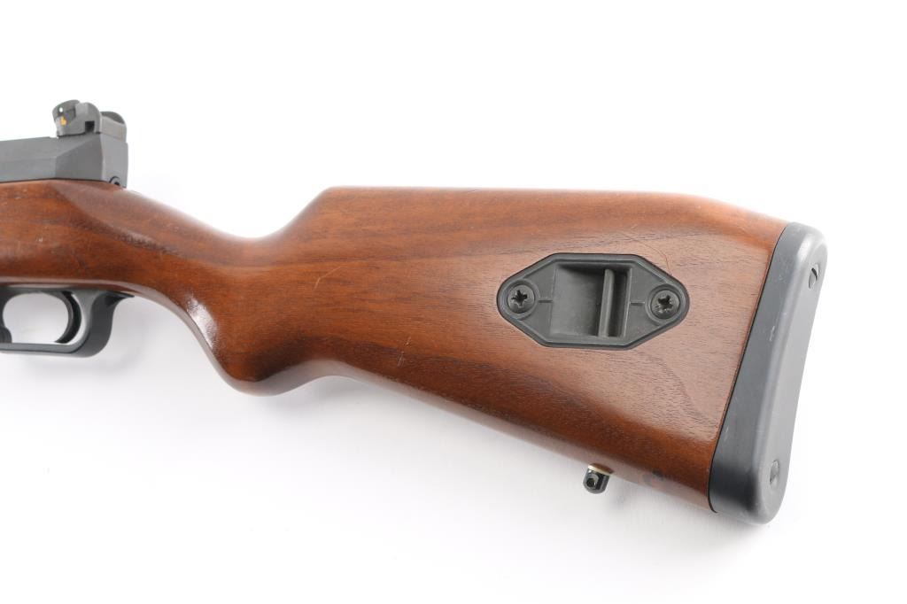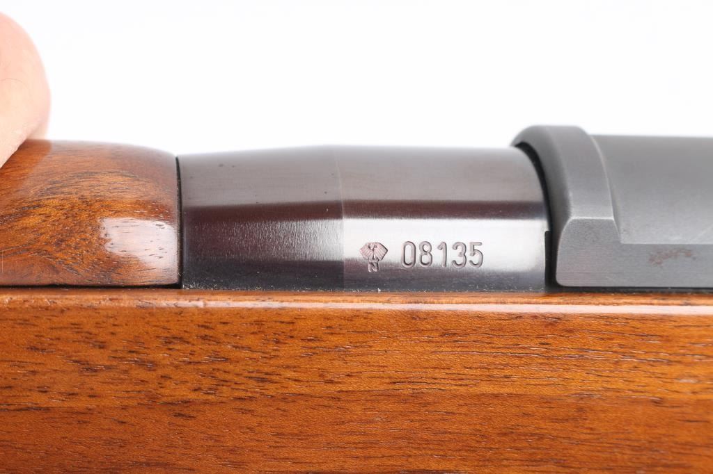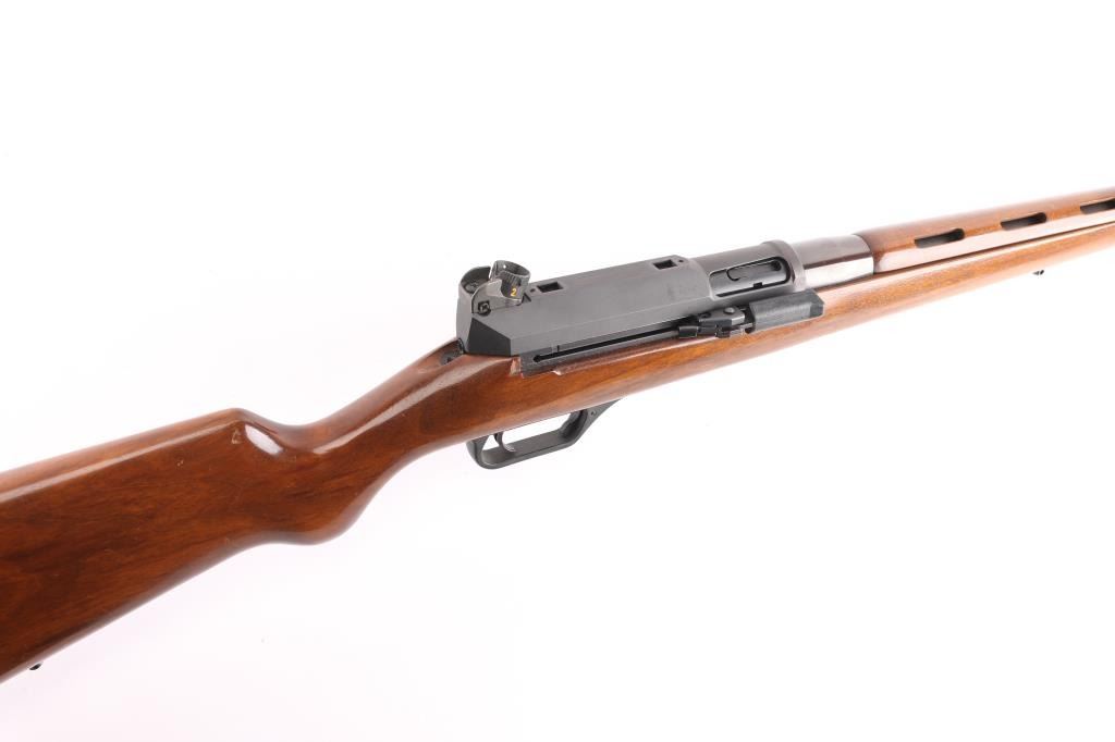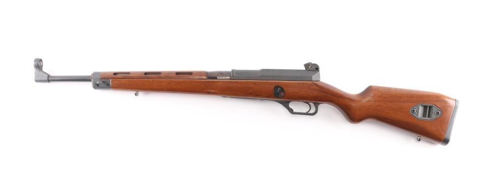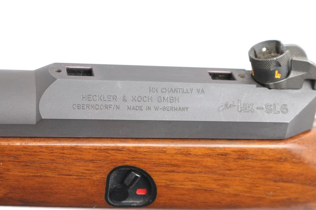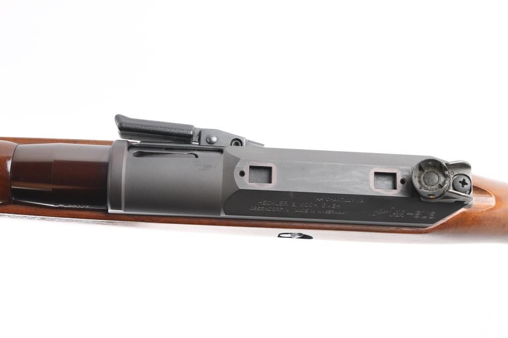 The Heckler & Koch SL6 is a roller-delayed, semi-auto blowback operated sporting carbine made in Germany in 1983. 17 inch barrel with hooded post front sight and HK rotary drum rear sight. European walnut Monte Carlo stock with vented upper hand guard. Steel butt plate and swivel studs. Right-hand charging handle with 4 round .223 box mag. Two stage trigger, manual safety all functions good. Bore is very good. Rifle is in great overall condition.