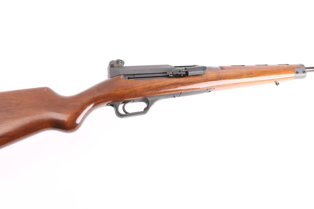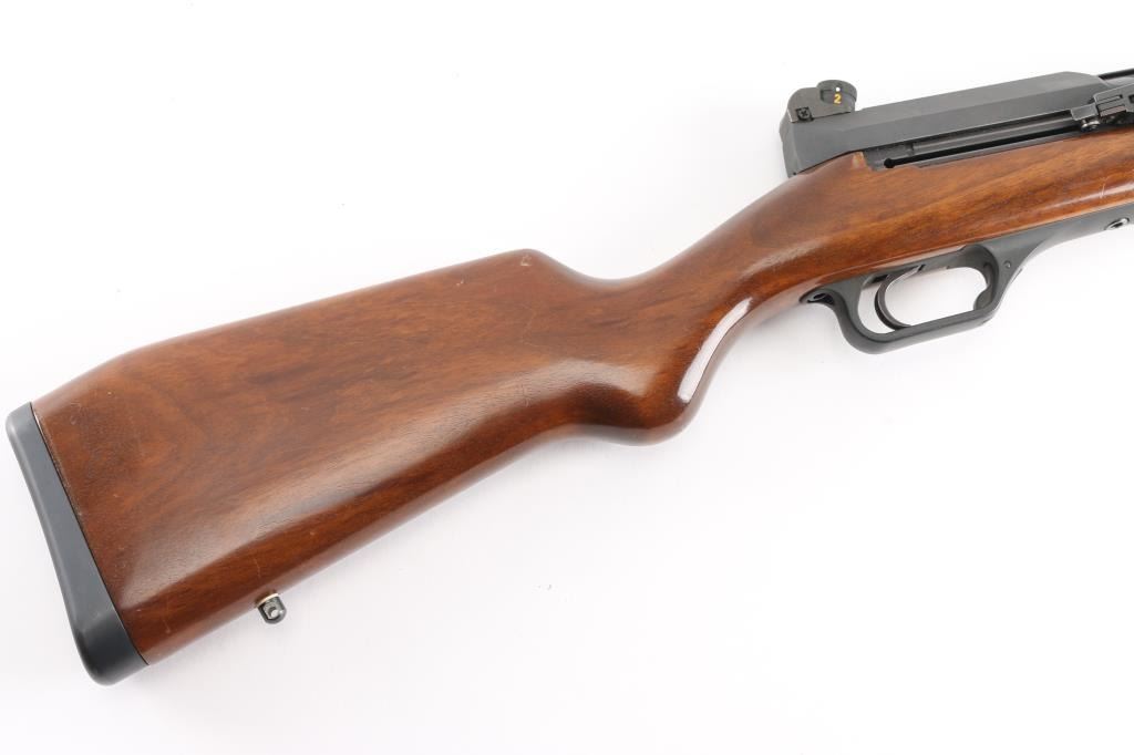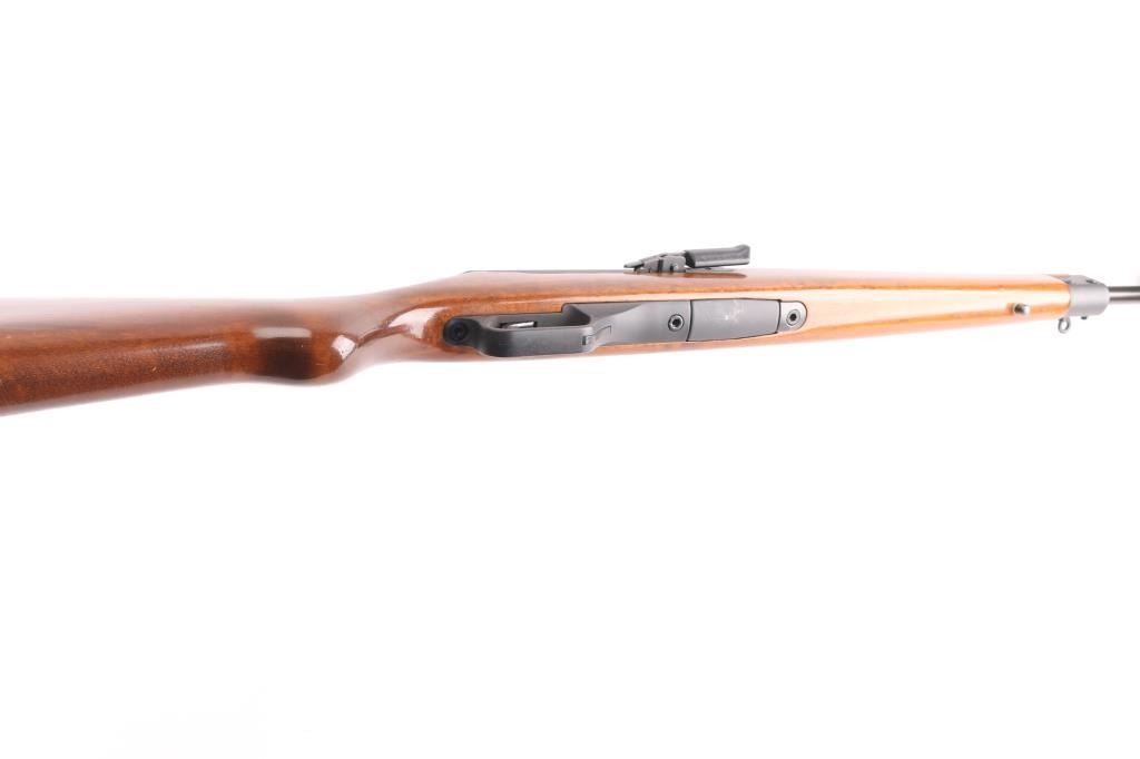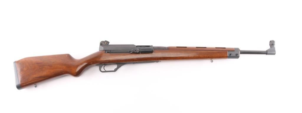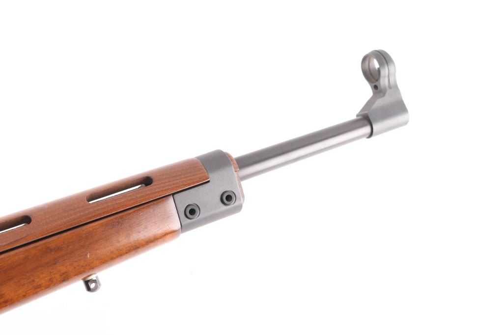 The Heckler & Koch SL6 is a roller-delayed, semi-auto blowback operated sporting carbine made in Germany in 1983. 17 inch barrel with hooded post front sight and HK rotary drum rear sight. European walnut Monte Carlo stock with vented upper hand guard. Steel butt plate and swivel studs. Right-hand charging handle with 4 round .223 box mag. Two stage trigger, manual safety all functions good. Bore is very good. Rifle is in great overall condition.