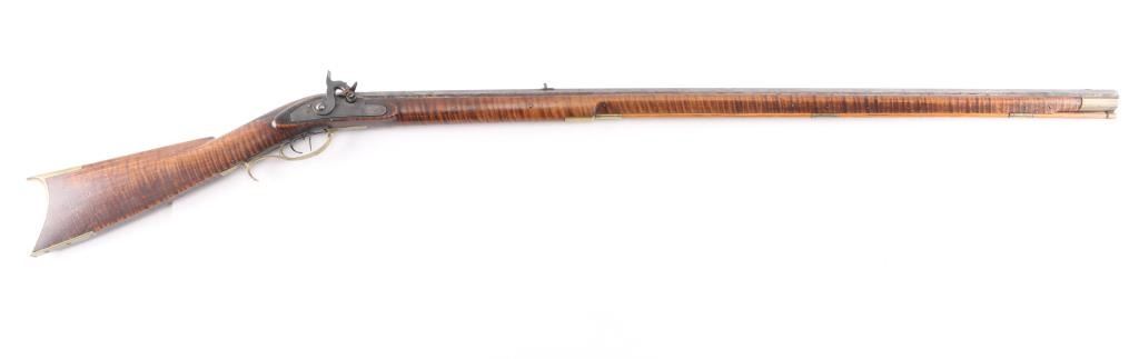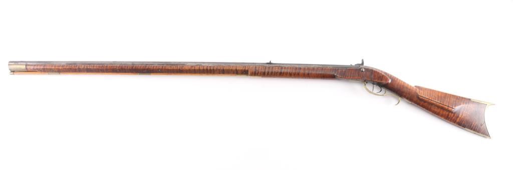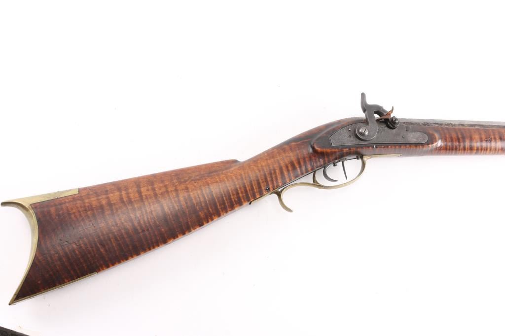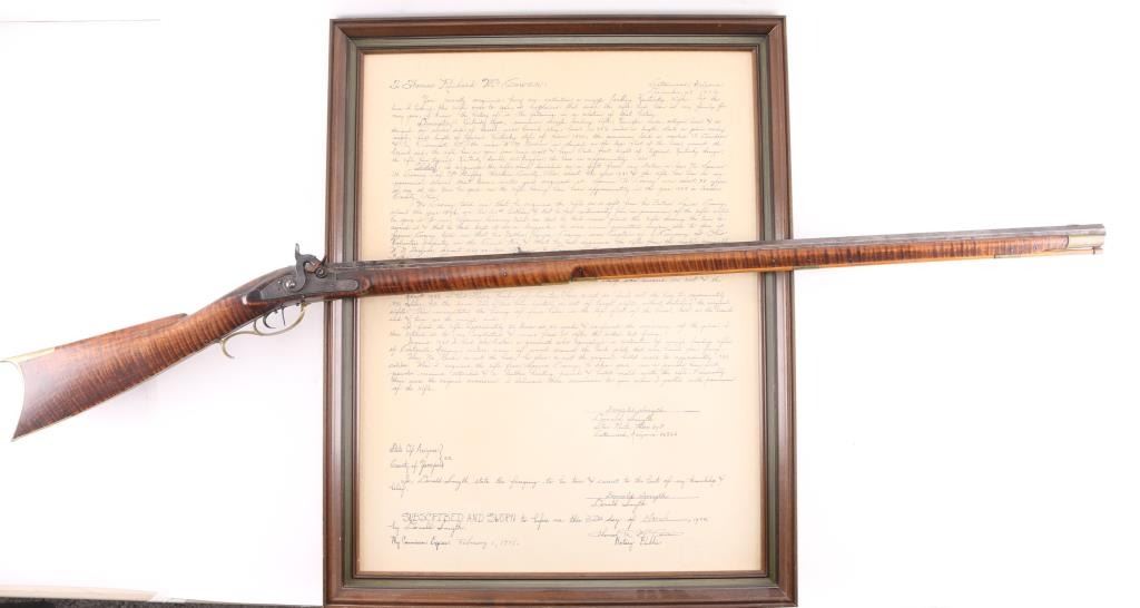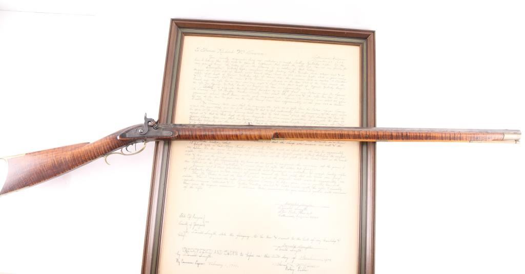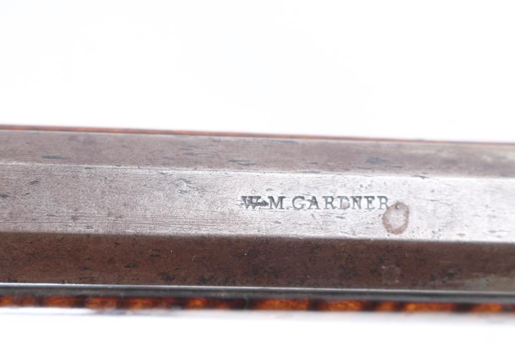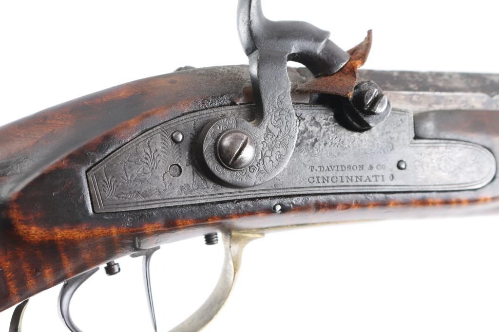 NVSN. Plain Kentucky Type Percussion Rifle circa 1850. Lock is marked "T. DAVIDSON, Cincinnati Ohio", with engraved scene of a Man hunting water fowl. On barrel is Gun makers name of "WM Gardner" 38 inch octagon barrel. Hand-crafted buckhorn rear sight, front sight is German silver blade with brass dovetail insert, beautiful Tiger maple stock, brass end cap, furniture, and ram rod holding tubes. Hickory ram rod with original brass tip, double set triggers, action is crisp/strong, cheek piece, crescent brass butt plate. Metal surfaces have turned molted brown/gray patina, furniture has turned a nice golden brass patina. The Tiger maple stock is very good/sound, bore appears very good, strong rifling. there are two bright areas on the top barrel flat that appear to have been cleaned below the front sight, and ahead of the hammer. Tyler Davidson Co. was a producer of hardware between 1834 and 1866, including providing lock mechanisms for guns. There is a W. Gardner listed in the database of U.S. gun makers. he was from Geneva, N. Y. Maker of a full stock, Kentucky rifles. This rifle comes with a 1974 framed, notarized statement of the rifles history by a man who acquired the rifle in 1930 and sold it to the consignor in 1974 in Cottonwood, Arizona. The history of ownership goes back to 1849/50. The frame measures 29" x 23". A fascinating history.