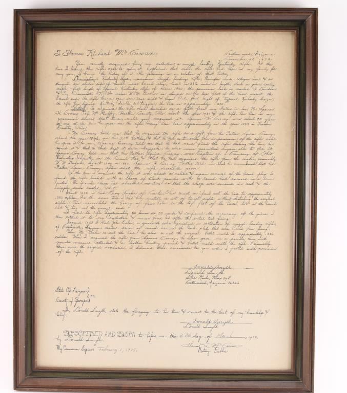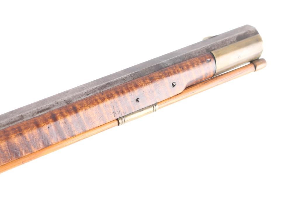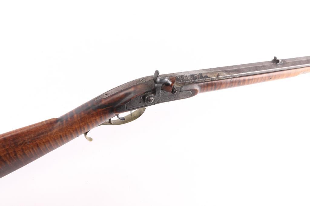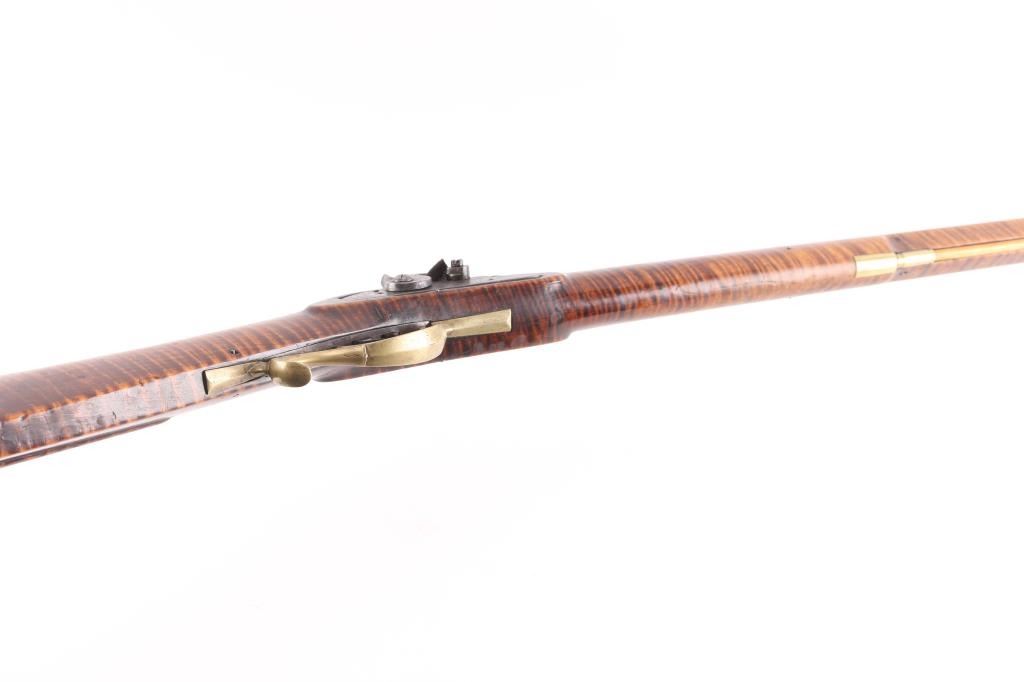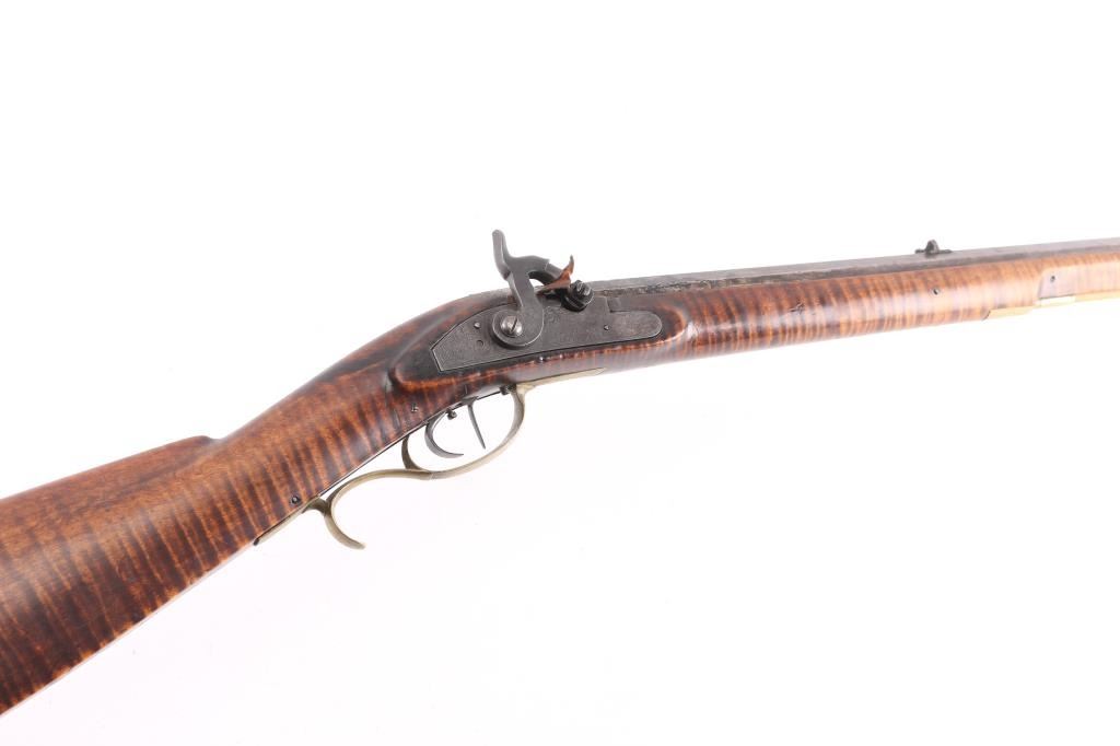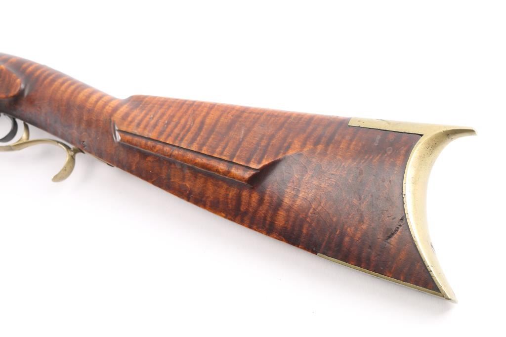 NVSN. Plain Kentucky Type Percussion Rifle circa 1850. Lock is marked "T. DAVIDSON, Cincinnati Ohio", with engraved scene of a Man hunting water fowl. On barrel is Gun makers name of "WM Gardner" 38 inch octagon barrel. Hand-crafted buckhorn rear sight, front sight is German silver blade with brass dovetail insert, beautiful Tiger maple stock, brass end cap, furniture, and ram rod holding tubes. Hickory ram rod with original brass tip, double set triggers, action is crisp/strong, cheek piece, crescent brass butt plate. Metal surfaces have turned molted brown/gray patina, furniture has turned a nice golden brass patina. The Tiger maple stock is very good/sound, bore appears very good, strong rifling. there are two bright areas on the top barrel flat that appear to have been cleaned below the front sight, and ahead of the hammer. Tyler Davidson Co. was a producer of hardware between 1834 and 1866, including providing lock mechanisms for guns. There is a W. Gardner listed in the database of U.S. gun makers. he was from Geneva, N. Y. Maker of a full stock, Kentucky rifles. This rifle comes with a 1974 framed, notarized statement of the rifles history by a man who acquired the rifle in 1930 and sold it to the consignor in 1974 in Cottonwood, Arizona. The history of ownership goes back to 1849/50. The frame measures 29" x 23". A fascinating history.