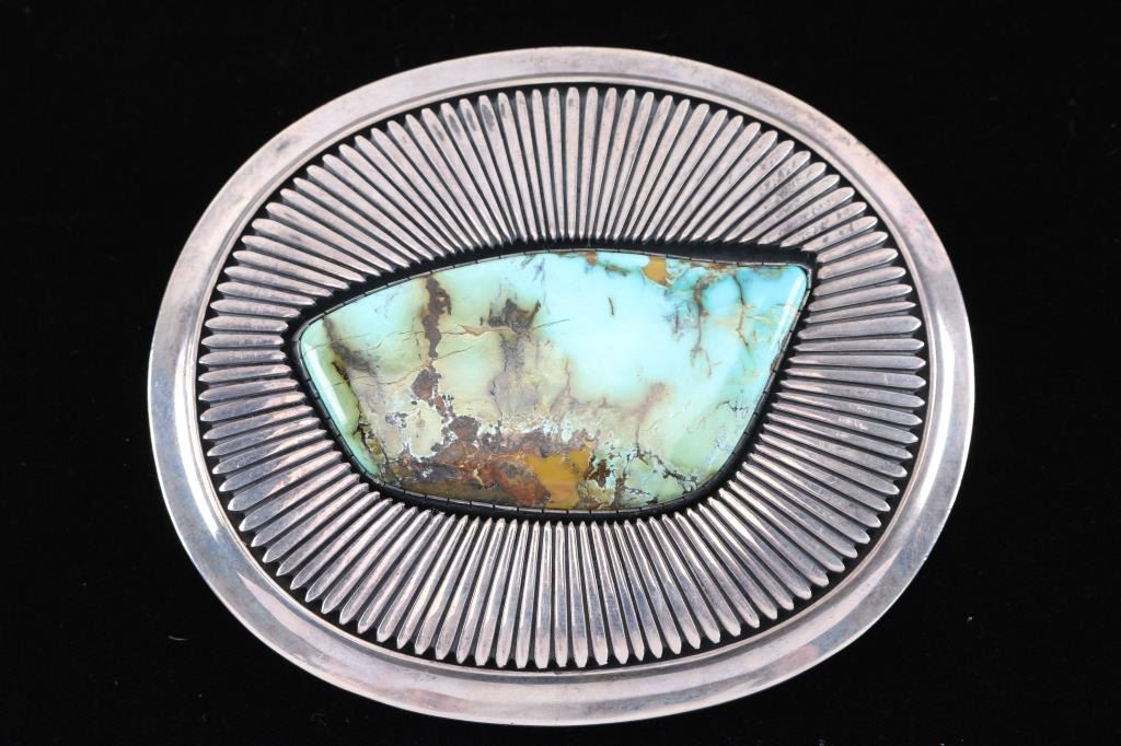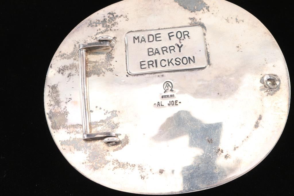 Large center turquoise stone, maker marked AL JOE for Barry Erickson. Set in heavy sterling silver. Measures 4"x3".