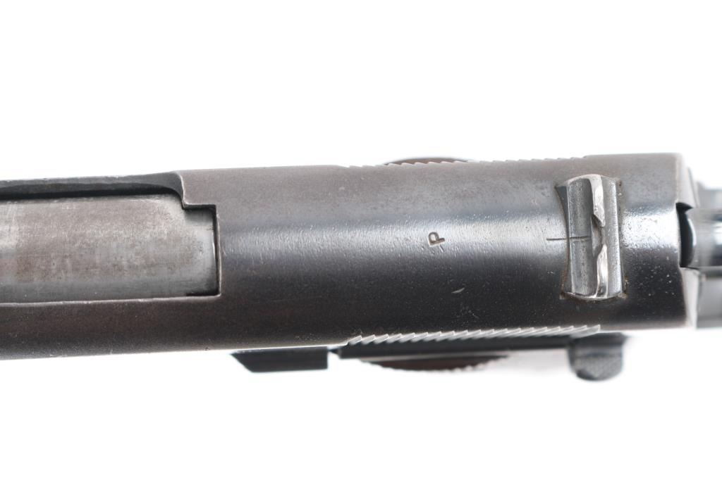SN: 2430052 U.S Military WWII era semiautomatic pistol manufactured circa 1945. Features blued refinish, reinforced checkered brown plastic grips, 5" blued barrel, fixed front & dovetailed rear sights, single action, stamped trigger, grip safety, manual safety, serrated arched mainspring housing with lanyard loop. Bore is very good. Retains 90% re-finish, with edge losses, scratches. Some thinning on grip straps, some alteration to contours on fine edges where polished. Fine parallel grooves or scratches and other imperfections to the surface finish of the metal below the finish may be rough wartime production. Grips are very good. Markings include: "REMINGTON RAND" with address on slide, "UNITED STATES PROPERTY", "M1911A1 US ARMY" (this area appears dished, perhaps struck a bit hard when stamped), "P" behind mag button, "FJA" below slide stop, "A" and "U' and "O" on trigger guard. Faint partial crossed cannons on right frame. Barrel marked "P" and "HS" on feet. Includes (1) very good condition "Kimber" marked blued steel magazine.