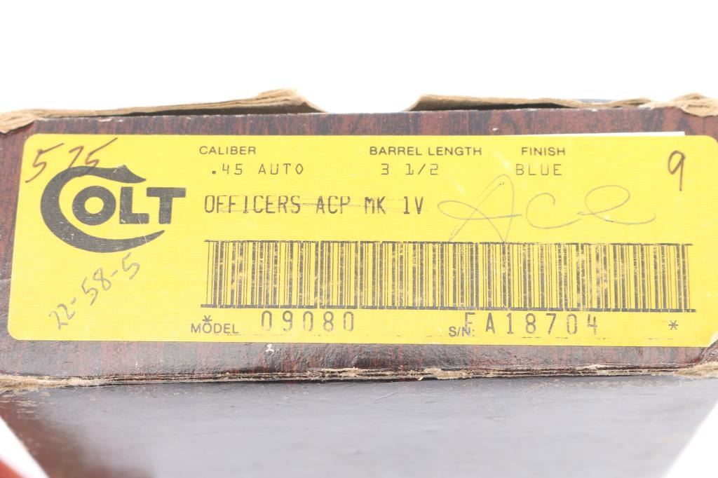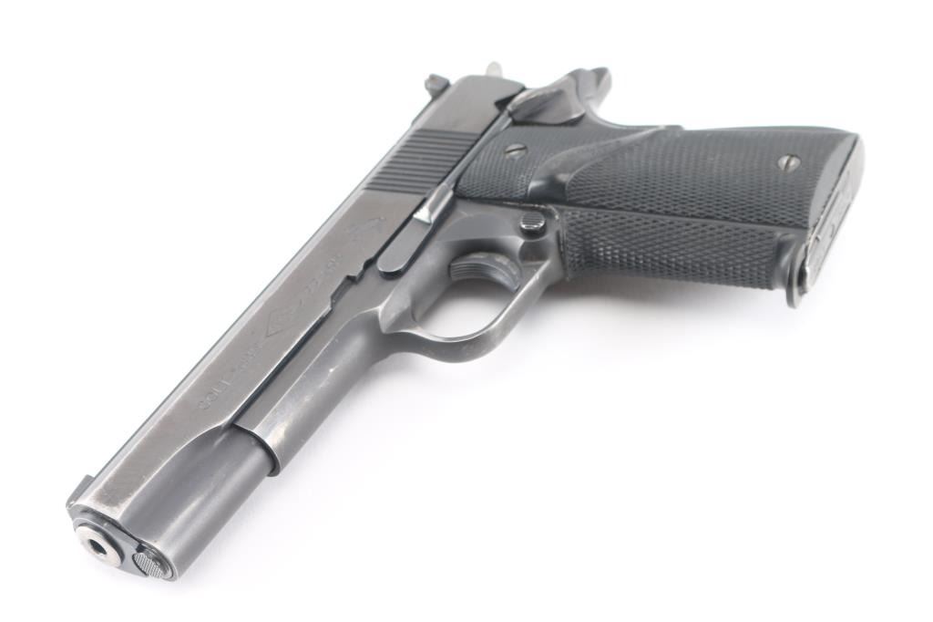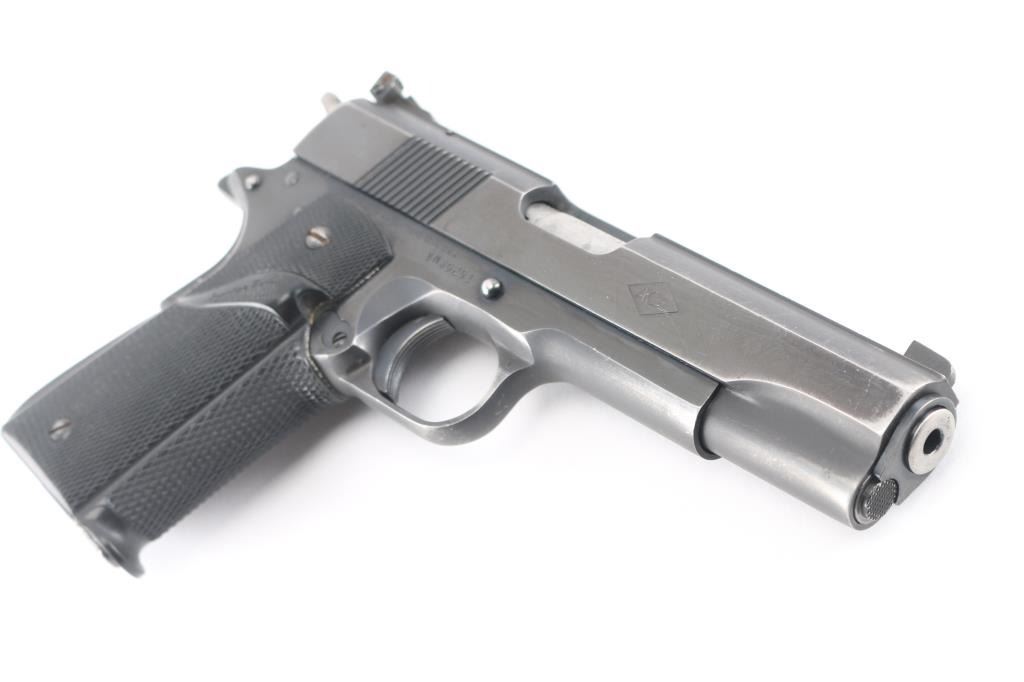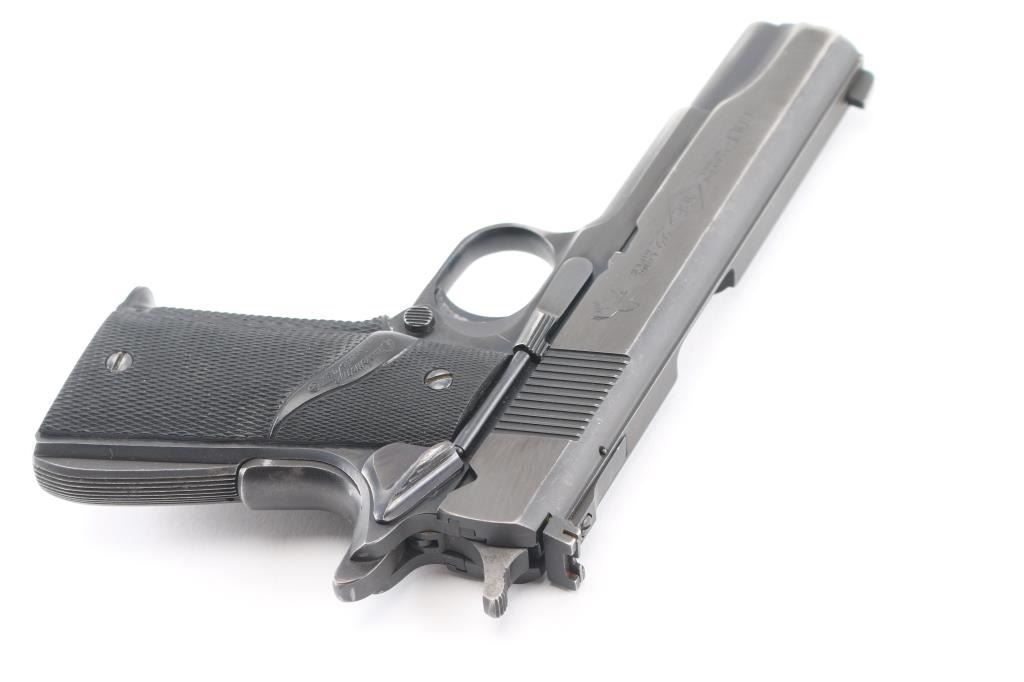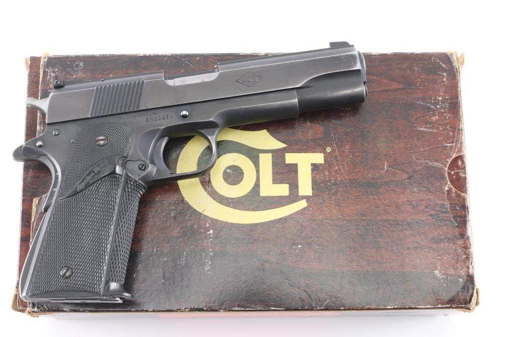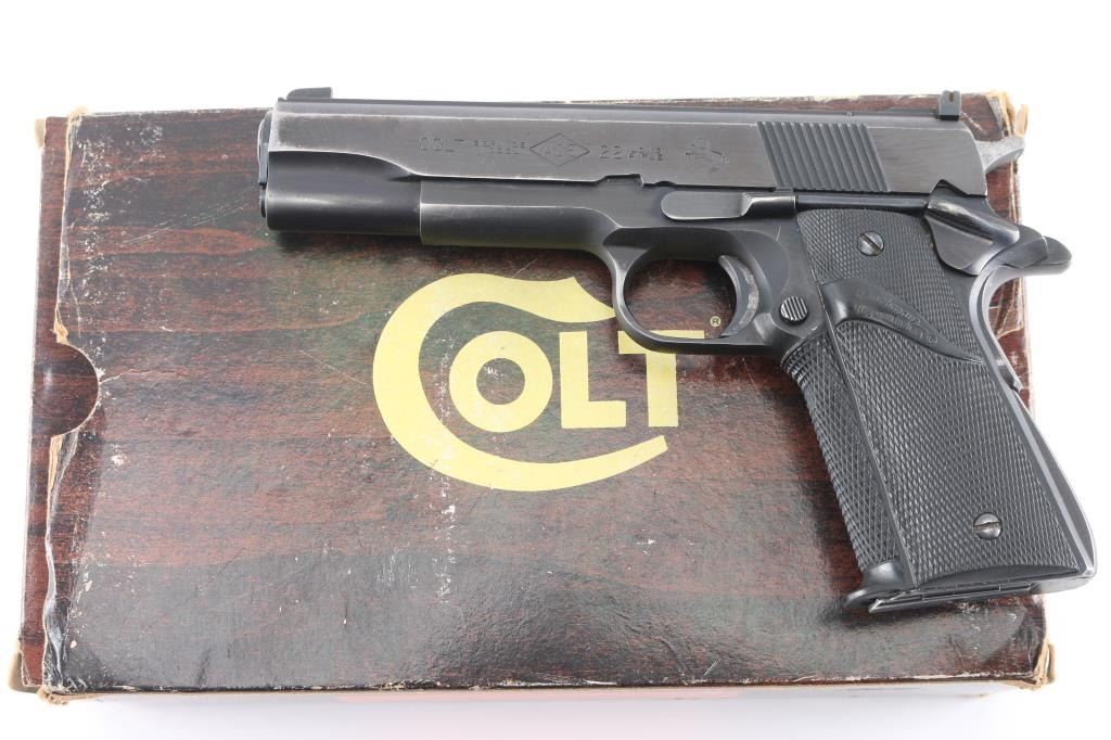 Semiautomatic rimfire pistol built on a full sized 1911 type frame, circa 1978-82. Feature 5" barrel, thumb & grip safeties, target sights, wrap-around Pachmayr grips. Bore is very good. Retains 85% to 90% finish with moderate edge losses. Includes factory wood grain cardboard box (originally for a different pistol), one Colt marked magazine.
