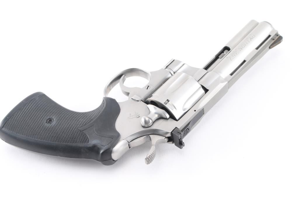 American made, large frame double-action revolver chambered in .357 Magnum, circa 1983. Features a stainless steel finish, 4" vent rib barrel with full underlug, serrated, pinned, ramp front sight, adjustable rear window sight, fluted six-shot cylinder, serrated trigger, knurled wide hammer spur, and two-piece checkered Pachmayr grips. Bore is excellent/bright. Metal finish excellent, faint drag line on the cylinder. Grips look great. Comes in the original factory 'wood grain' cardboard box with matching label, manual.