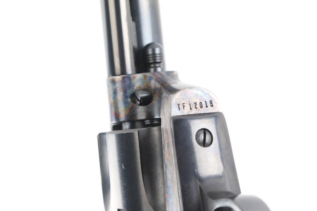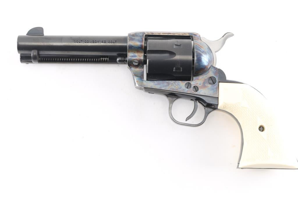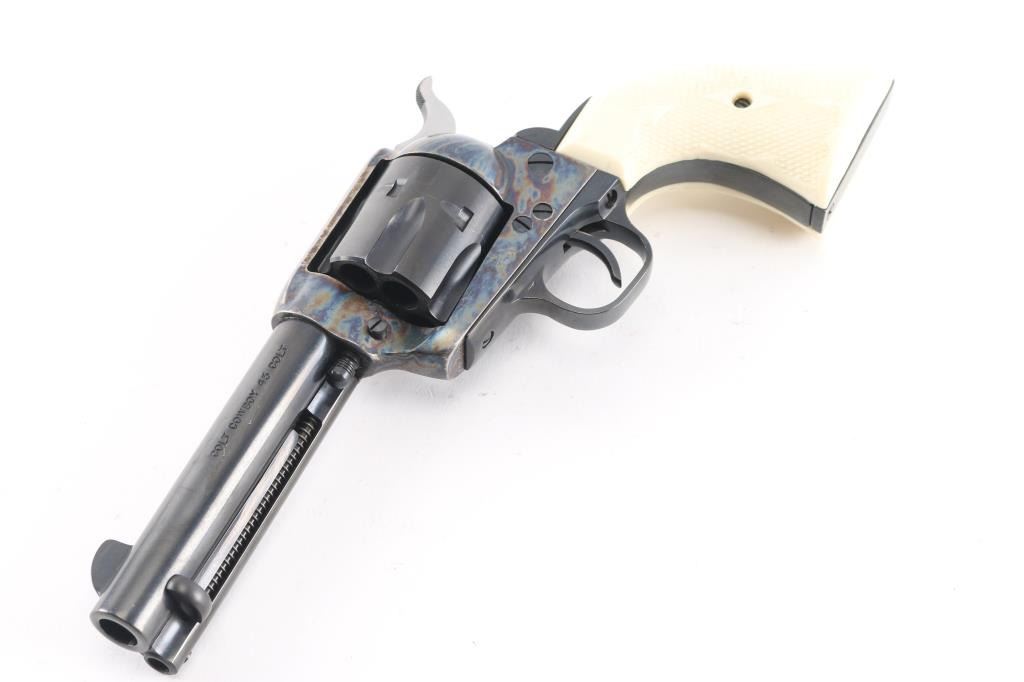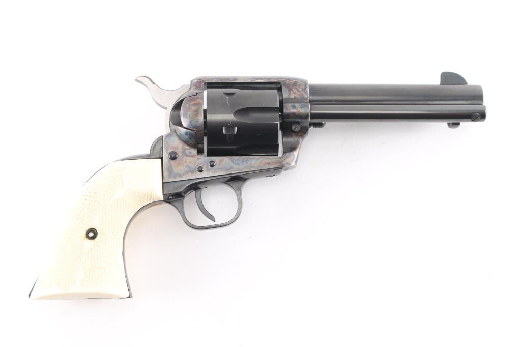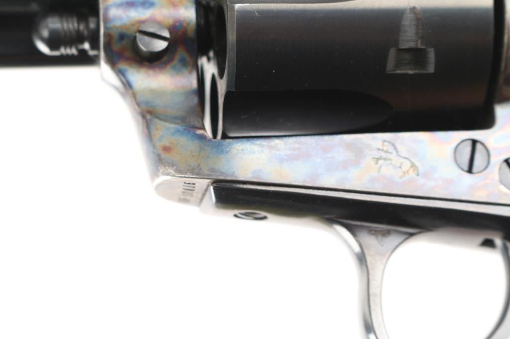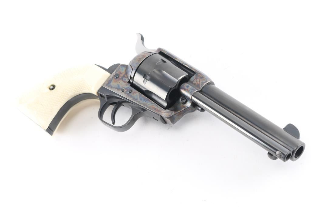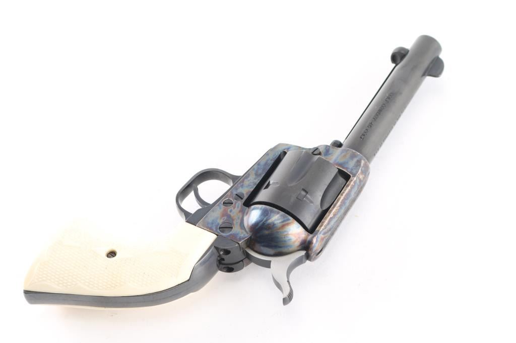 Single action revolver features blued finish, case color frame, 4 3/4" barrel, fixed sights, checkered polymer faux ivory grips. Same specifications as the Colt Single Action Army, manufactured 2001. All markings are crisp/clear. Action is smooth with tight lock-up. Bore is excellent/bright. Overall condition is like new with few signs of handling.