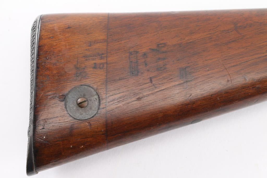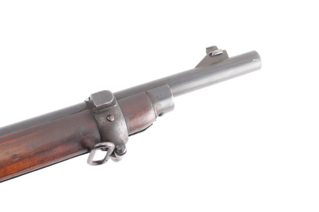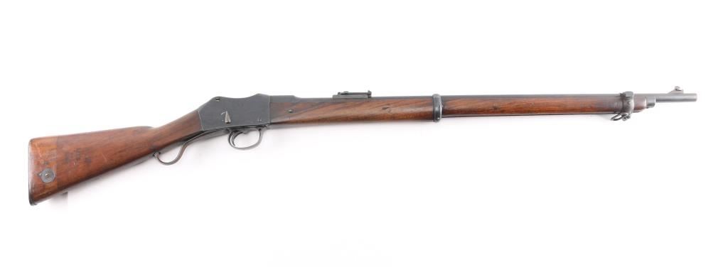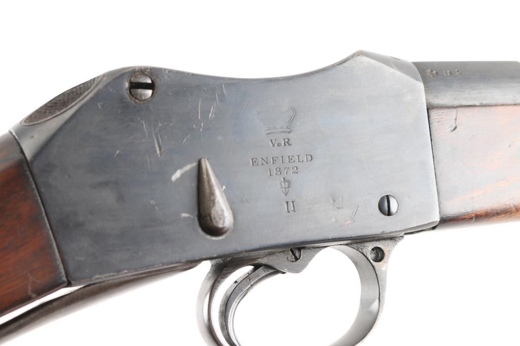 SN: 6686. Modified Enfield Pattern 1871 Mk II British military lever-operated breech loading single shot service rifle re-chambered for .22 caliber ammunition manufactured circa 1872. Features a dark blued finish with a 30" barrel, dovetailed bead/blade front sight, elevation adjustable ladder rear sight, lower sling swivel removed, two barrel bands, metal forend cap, serrated trigger, short lever, full length smooth forend and straight grip shoulder stock with metal disc and knurled buttplate. Marked '[crown]/VR, Enfield/1872, and II/2' on the right side of the receiver, 'Converted by C.G. Bonehill of Birmingham for the Society of the Miniature Rifle Clubs' on the left side of the receiver. Done in the early 20th century' Rifle exhibits approximately 95% of its old re-blued finish (most likely done at the time of conversion), showing light scattered wear. Action is sound, bore is very good/bright, strong rifling, and wood stocks are good, showing several blemishes, a 2 1/4" extension has been added to the butt.