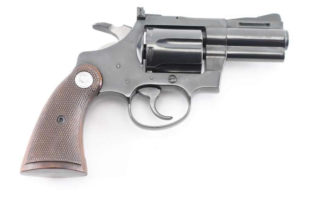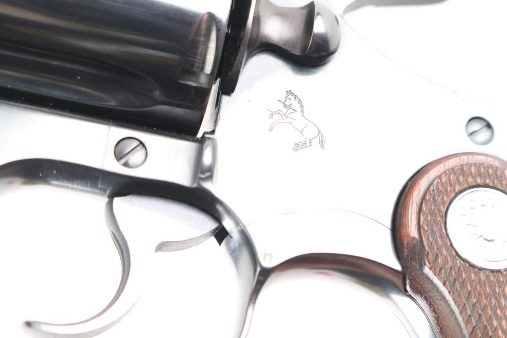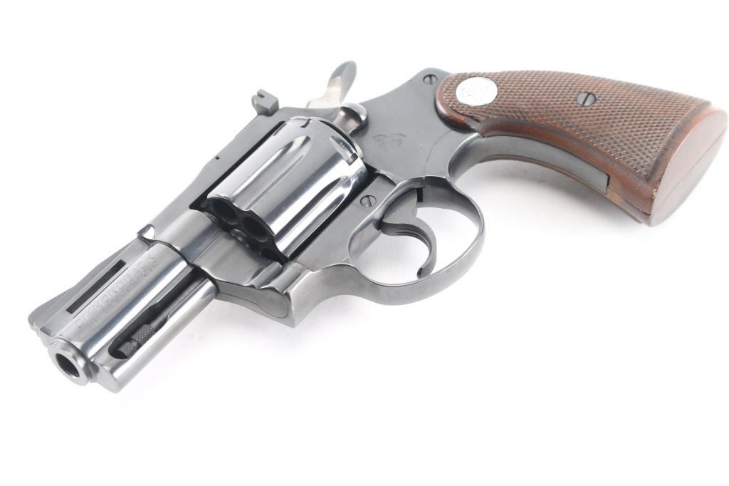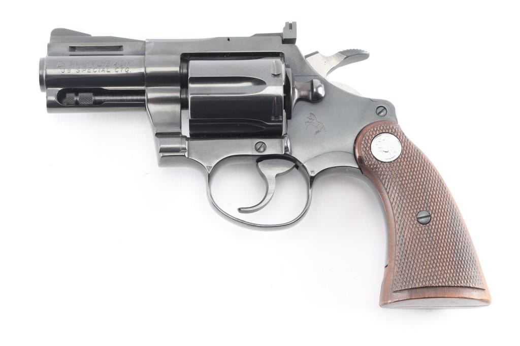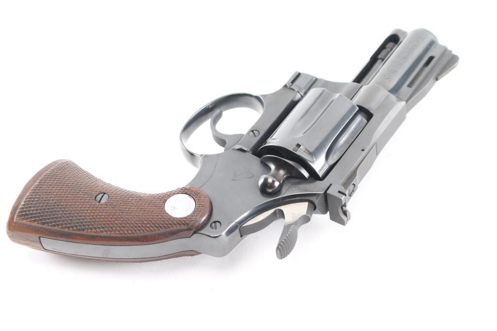 Double/single action revolver manufactured circa 1969, in 38 Special. Features blued finish, checkered wood target style grips with silver colored Colt medallions, 2.5" barrel with full length underlug and vent rib, adjustable sights. Wide serrated hammer spur. Bore and charge holes are pristine. Retains 99+% blue. Grips are excellent condition. Action is very smooth with tight lock-up.