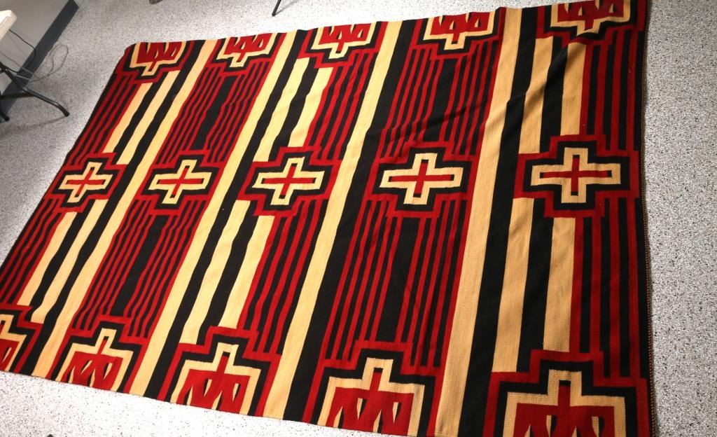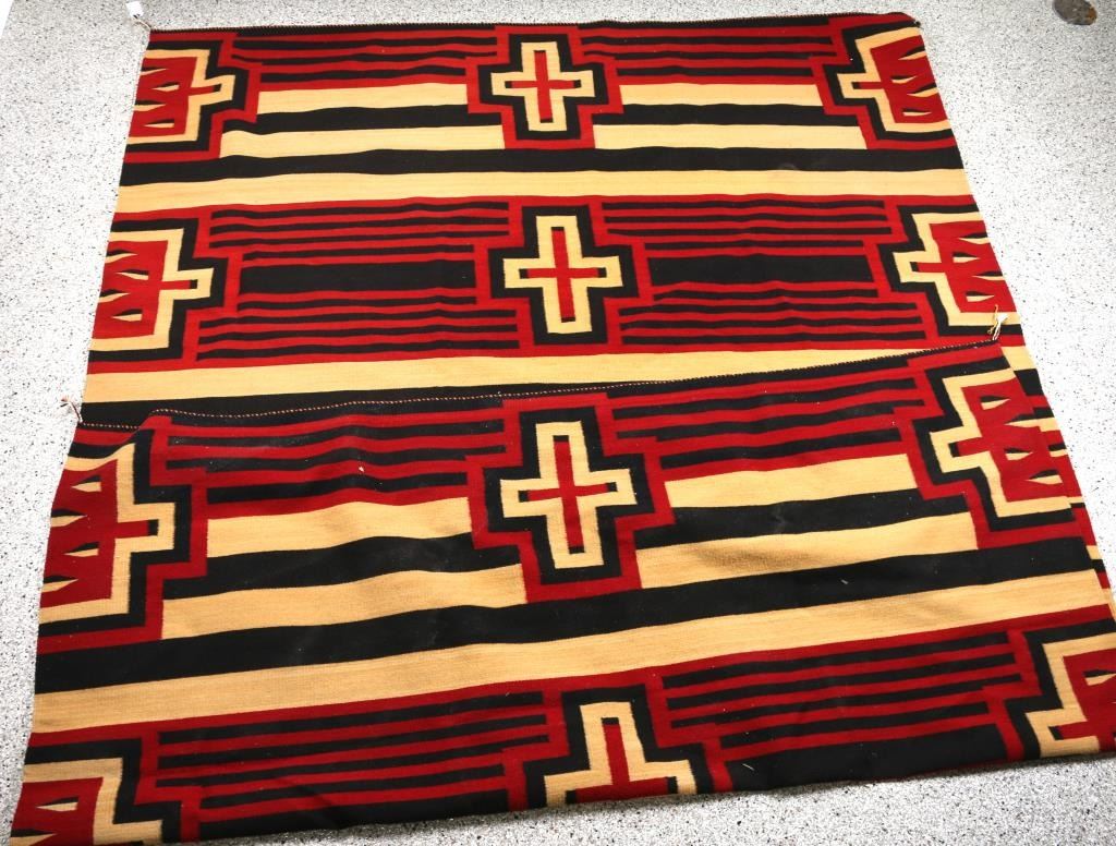 8ft by 10ft. In red, black, gold, and white. In overall excellent condition, with a beautiful striped pattern.