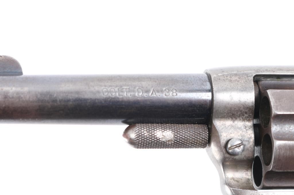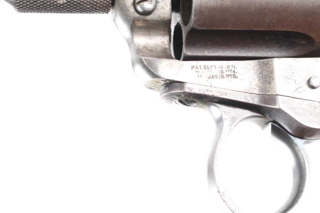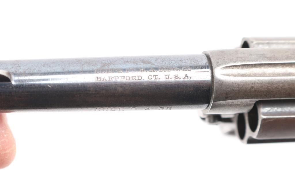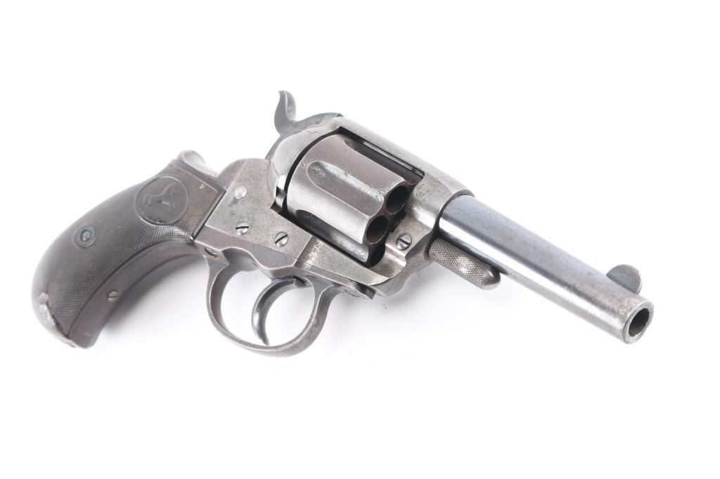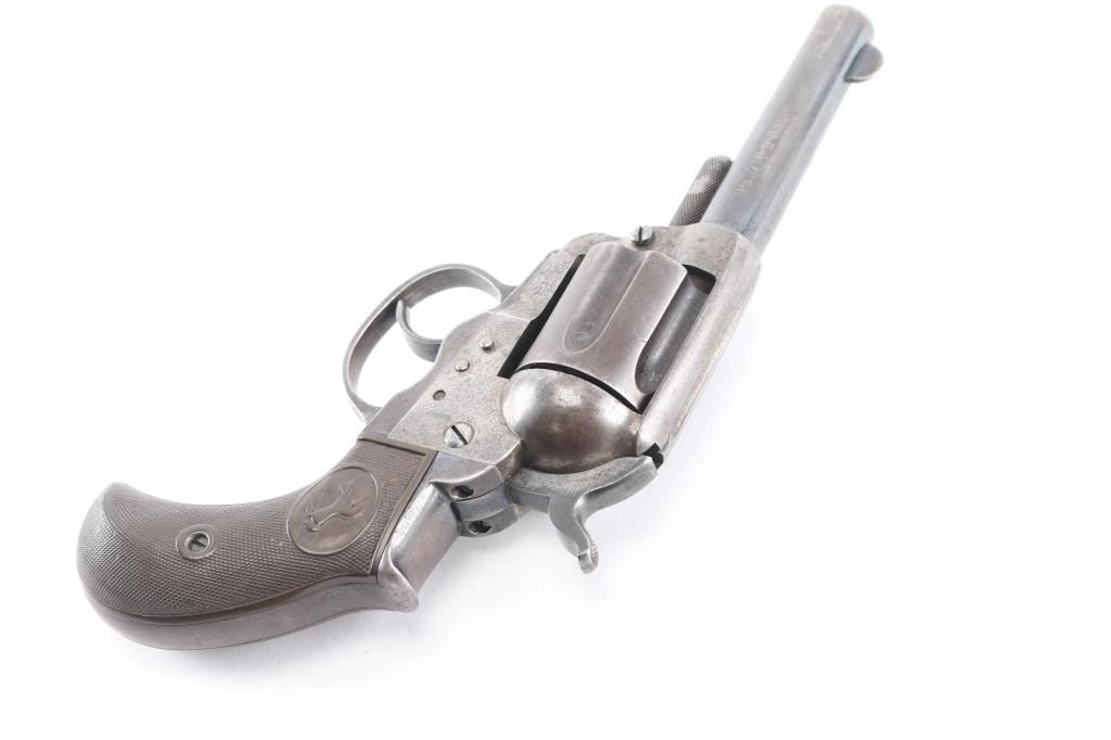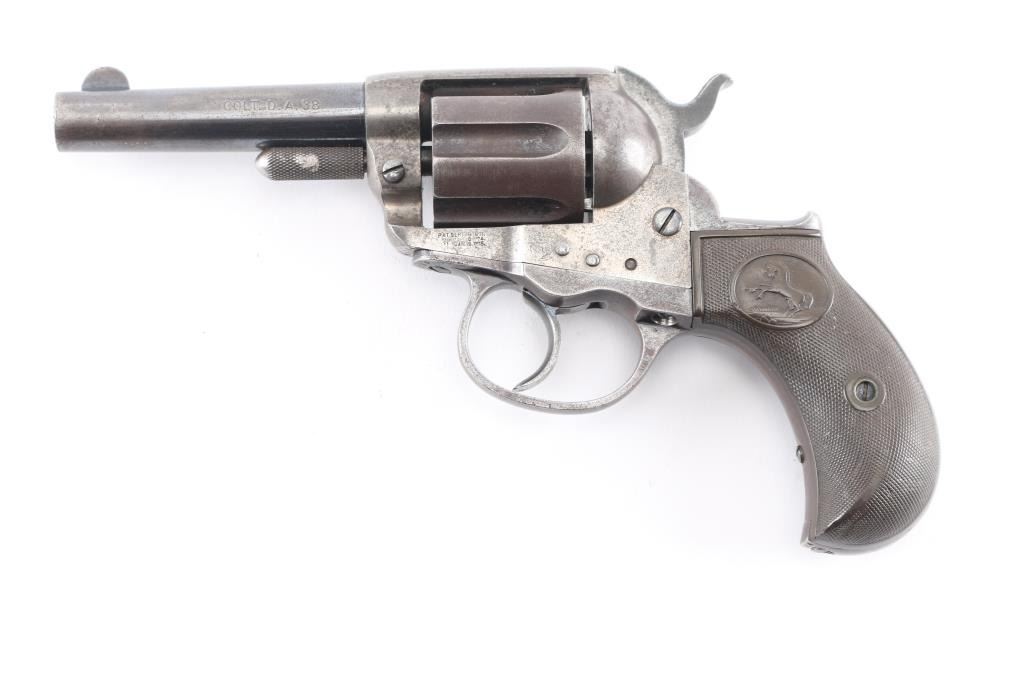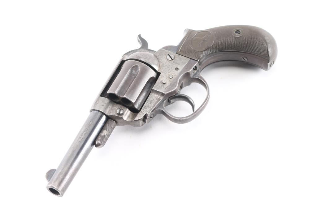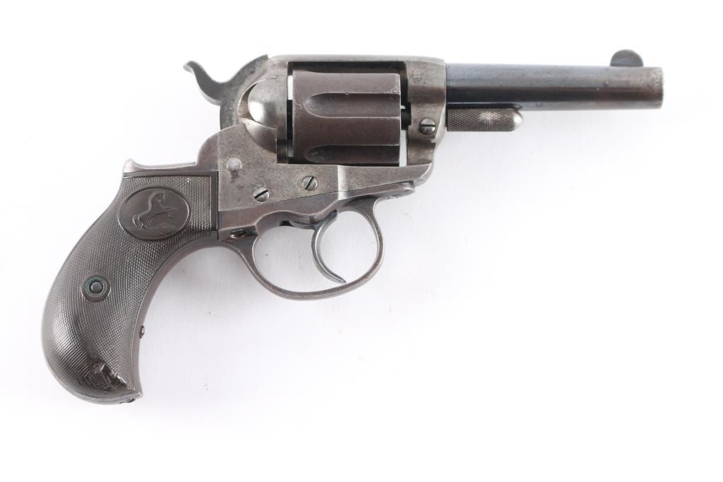 'Lightning' Shopkeepers or Sheriff's model, with 3.5" barrel and no ejector rod. Circa 1891. Features blued finish, six shot fluted cylinder, bird's head grip with checkered black hard rubber "Rampant Colt" grips. Bore is good condition, fairly bright with strong rifling, some pitting. Charge holes are good, minor roughness. Retains 10% blue on rear portions of barrel, mostly showing faded and thinned color. Cylinder shows an even brown toned finish. Frame is a dull grayish color. Grips are good, show smoothing, several tiny chips. Action is sound, good lock-up. Screw slots are good. Cylinder pin shows marring and loss of portion of knurling on head. Two line Hartford barrel address. Markings are generally sharp, Rampant Colt on frame is faint. British proofs on bottom of barrel (crown over "V", crown over "CP").