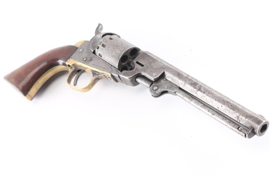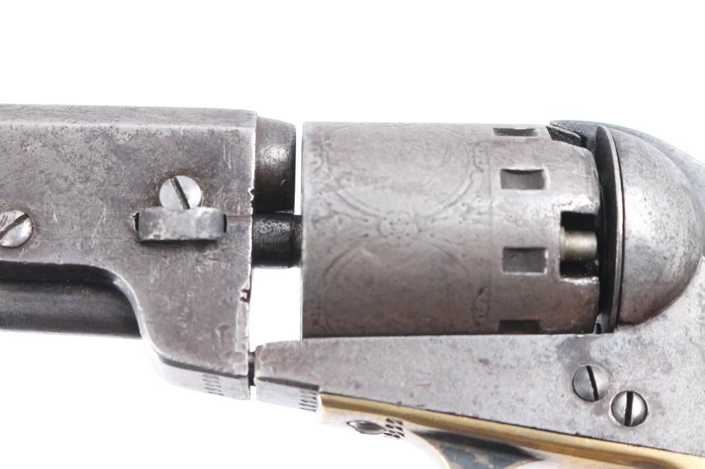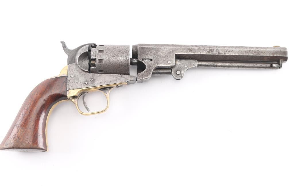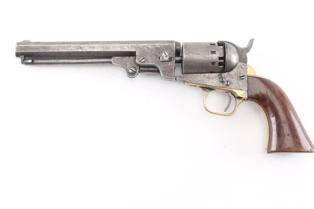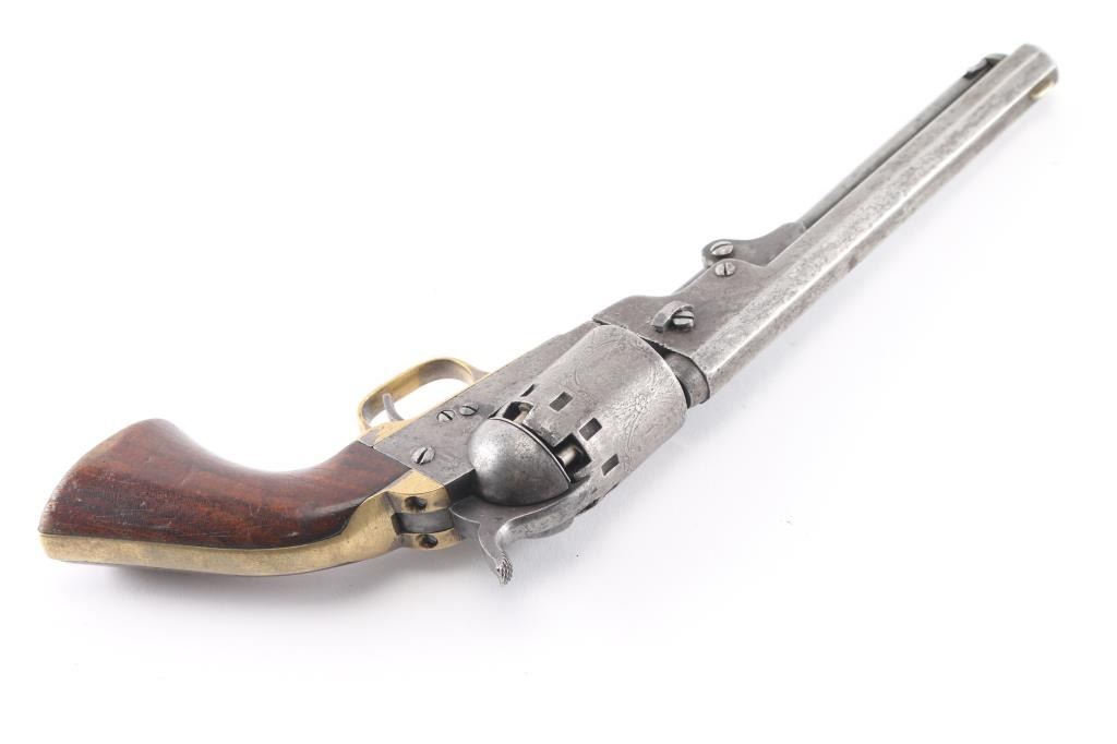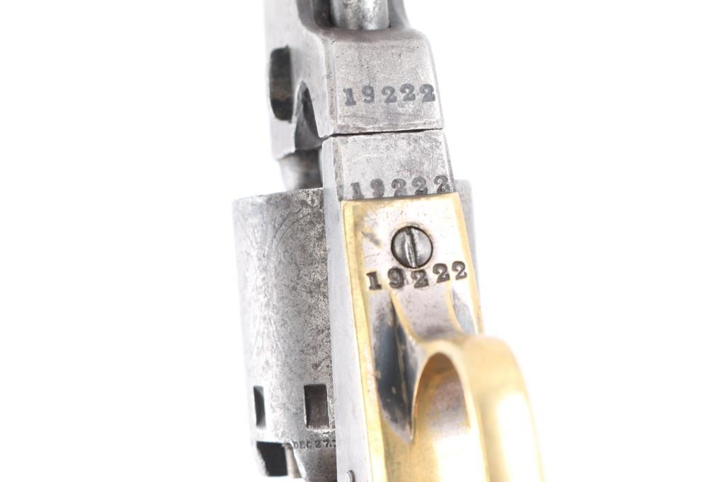 Civil War percussion single action revolver chambered for .36 caliber ammunition, 5-shot, modeled after Colt's 1849 Pocket. Approximately 30,000 of the SERIES III revolvers were made between Sept. 1, 1861 and April 1, 1864. Features a 6 1/2" octagonal barrel with "Manhattan Firearms Co. Newark NJ", loading lever, German silver blade front sight, notched rear sight, roll stamped cylinder with floral panels, checkered hammer spur, plated brass grip frame, and once piece varnished walnut grips. Finish has moved to an even medium grey patina. Matching serial numbers on the barrel, frame, triggerguard, grip frame, cylinder pin, and cylinder, wedge is mismatched, markings are feint, but readable. Bore has small areas of pitting, and wood grips are very good with few blemishes. The two cock hammer action works well with cylinder removed, but the cylinder stop does not depress when the hammer is cocked not allowing it to rotate. Needs repair/adjustment. The barrel is a little loose.