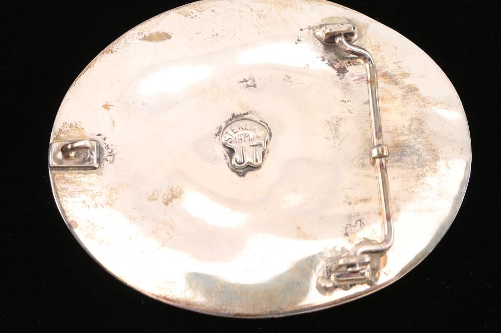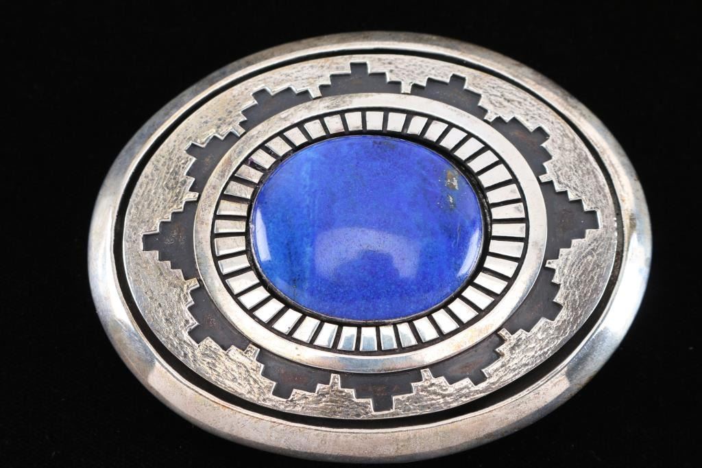 Large cobalt blue oval cut stone set in sterling silver, maker marked JT, measures 3.5"x2.5".