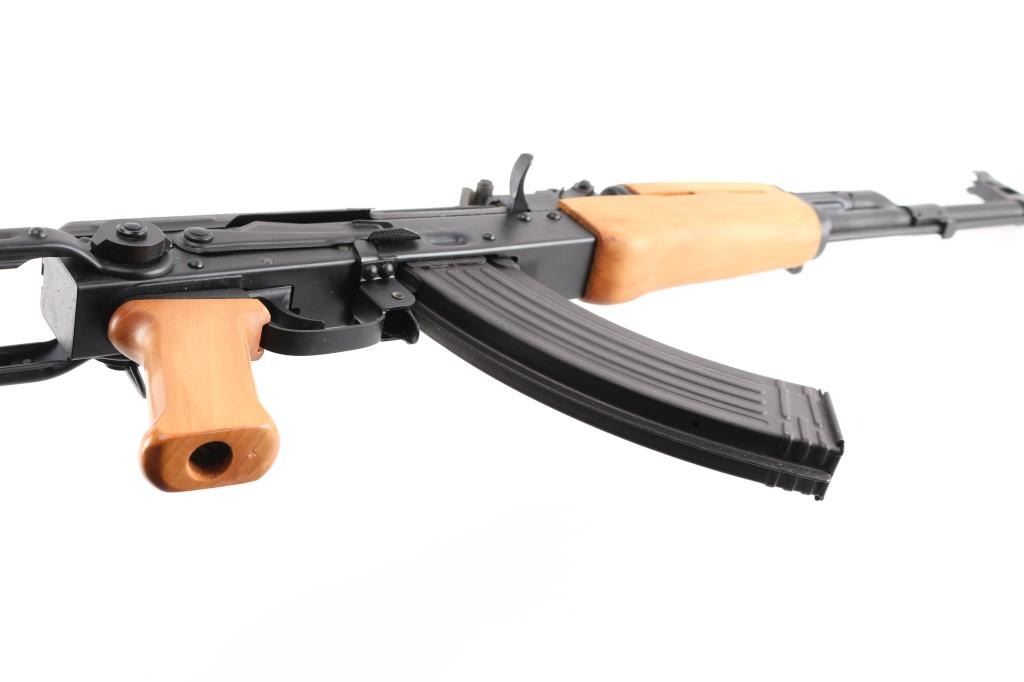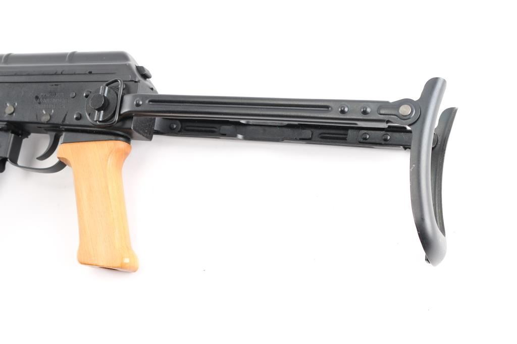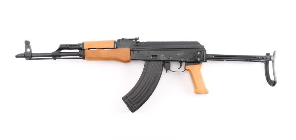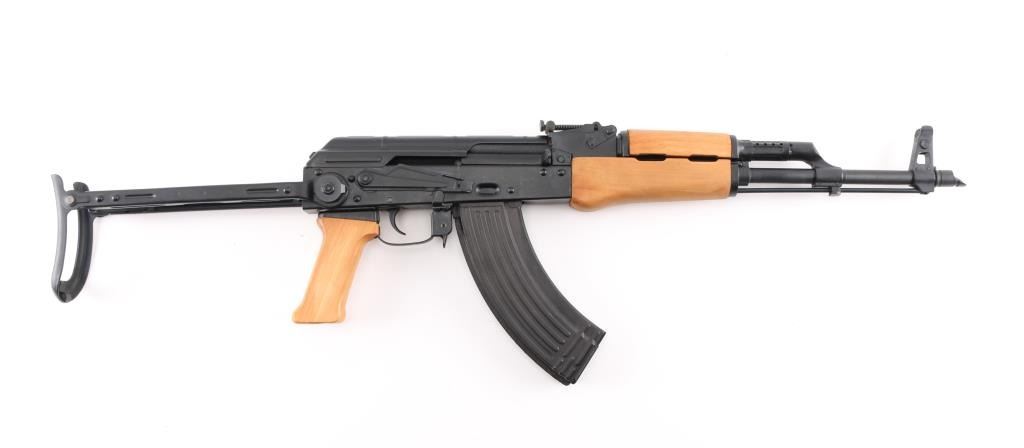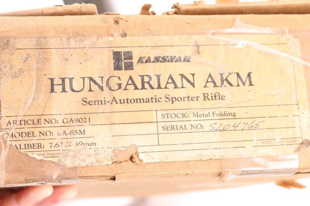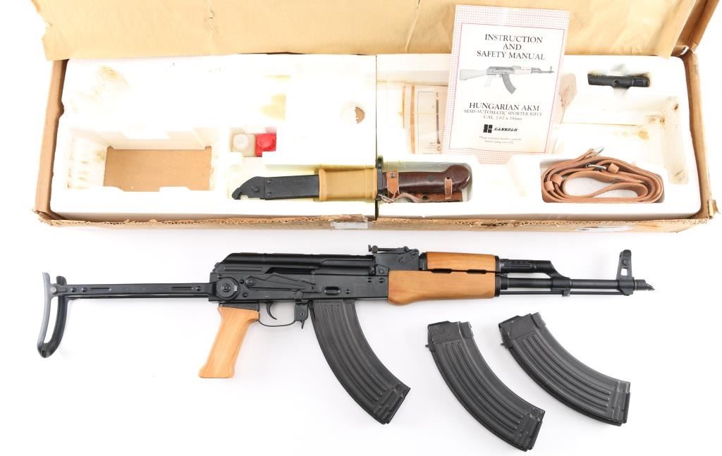 Hungarian semiautomatic rifle imported by Kassnar, Harrisburg PA. Based on AK-47/AKM design. Features black paint finish over parkerized metal, 16" threaded barrel with slant muzzle brake installed, cleaning rod, bayonet lug, protected post adjustable front sight, tangent rear sight, accepts detachable magazines, manual safety, under-folding metal stock, smooth wood hand guards and pistol grip, sling loop on gas block, sling swivel on receiver rear. Observed numbers match. Bore is very good condition, appears hard chrome lined. Retains 98% finish with few handling marks. Wood is very good condition. Includes factory box, three 30 rd magazines, leather sling, bayonet, cleaning kit, paperwork.
