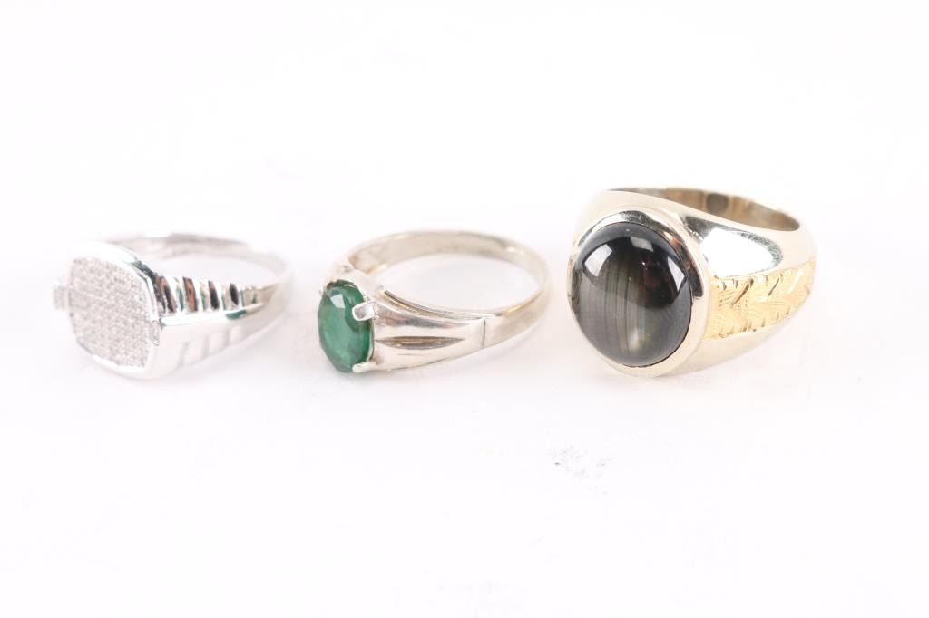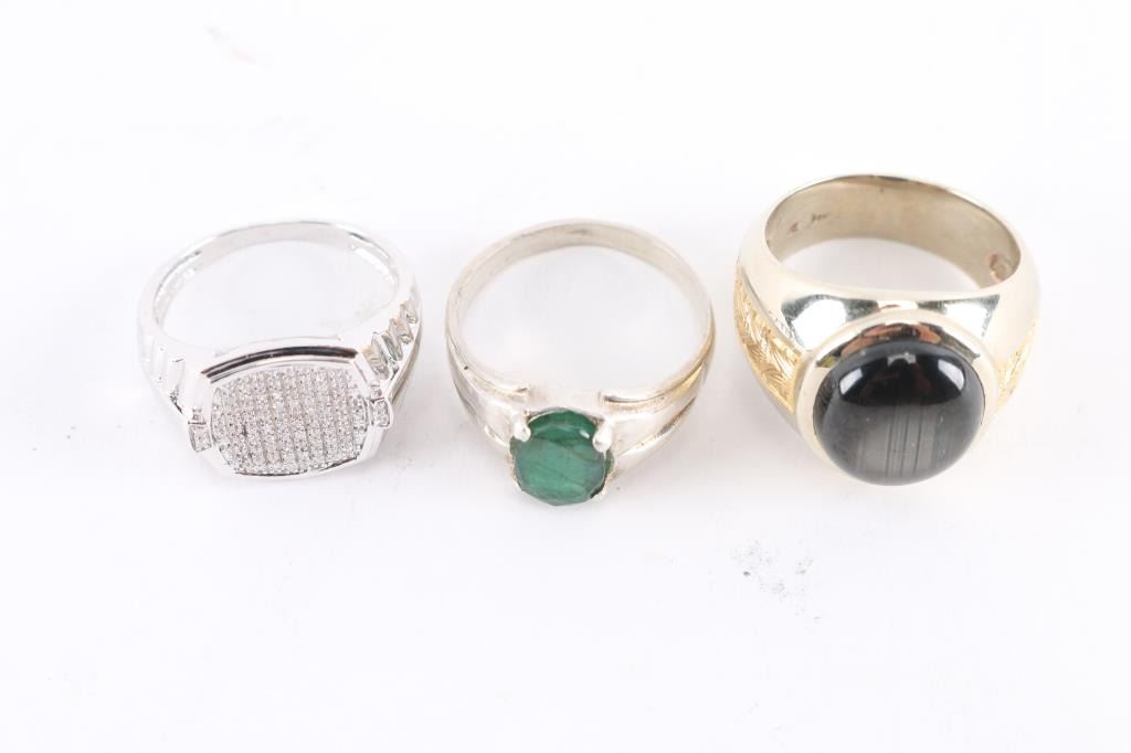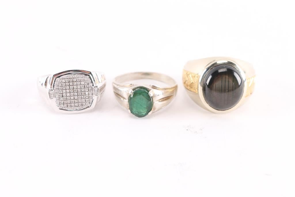 (1) Sterling men's ring with green stone;