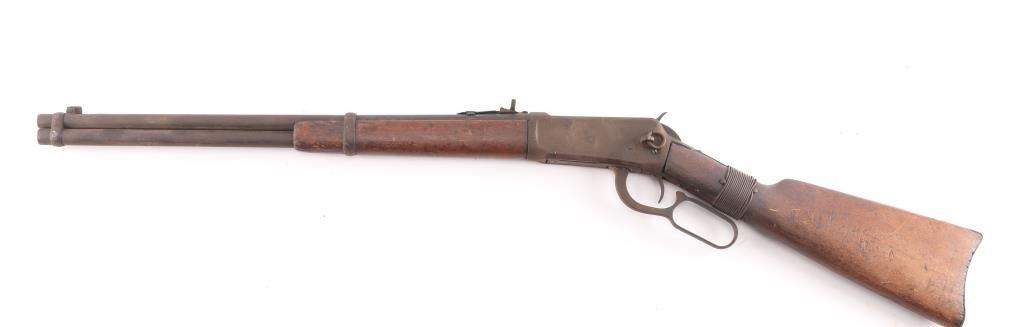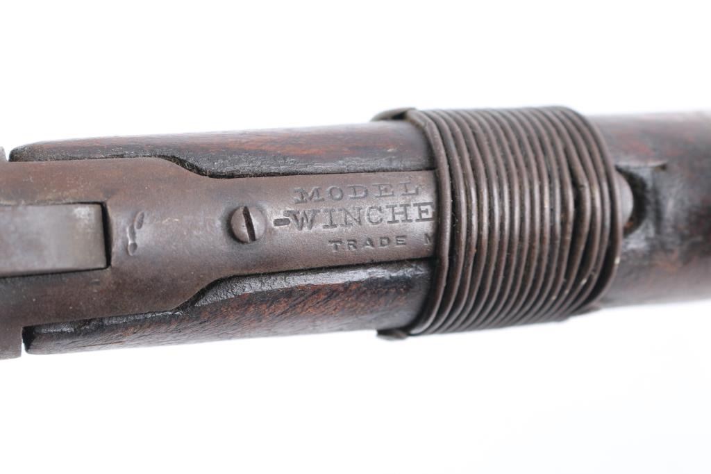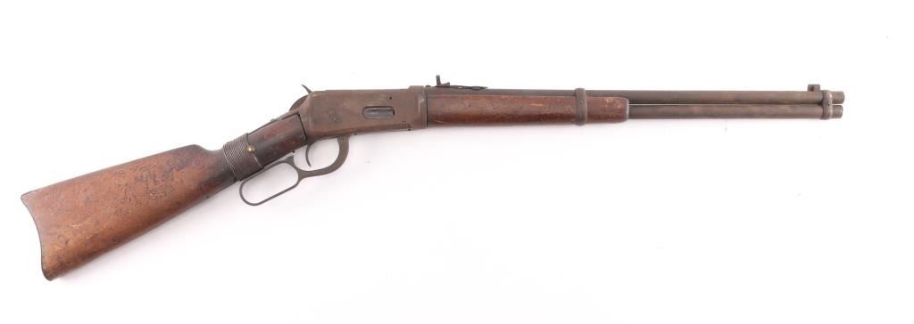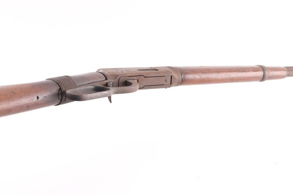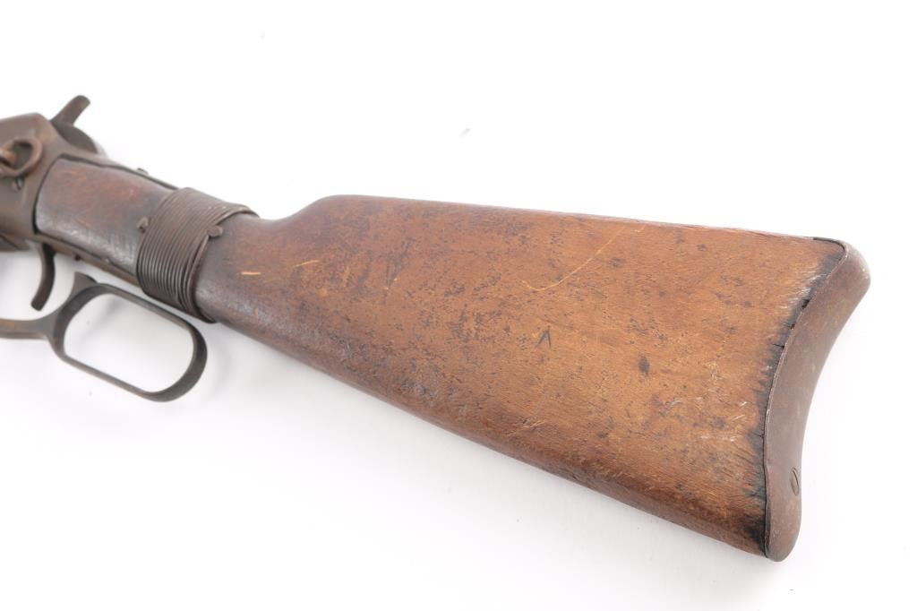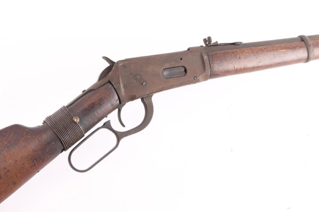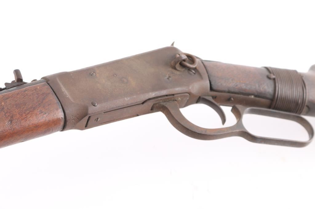 'Saddle Ring Carbine' Vintage lever action rifle manufactured circa 1906. Features 20" barrel, full length magazine tube, dovetailed blade front sight, buckhorn rear sight, smooth walnut forend & straight wristed buttstock, carbine butt with curved steel buttplate. Rifle is in relic condition. Bore has rifling, but is dark/rough. Metal surfaces have surface rust/light pitting, the wrist in cracked, and repaired with what appears to be copper wire. Action works well. All markings are clea, except on the tang where it is covered by the wire. The saddle ring is a period replacement, being smaller that it should be. Rifle has seen very hard use, possibly used by Native Americans.