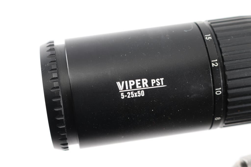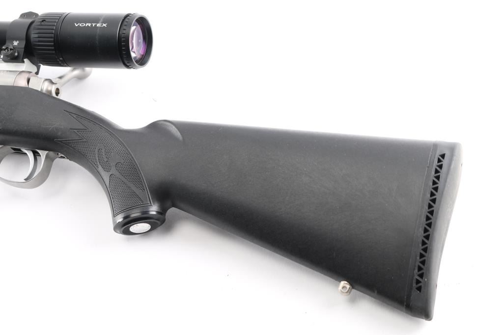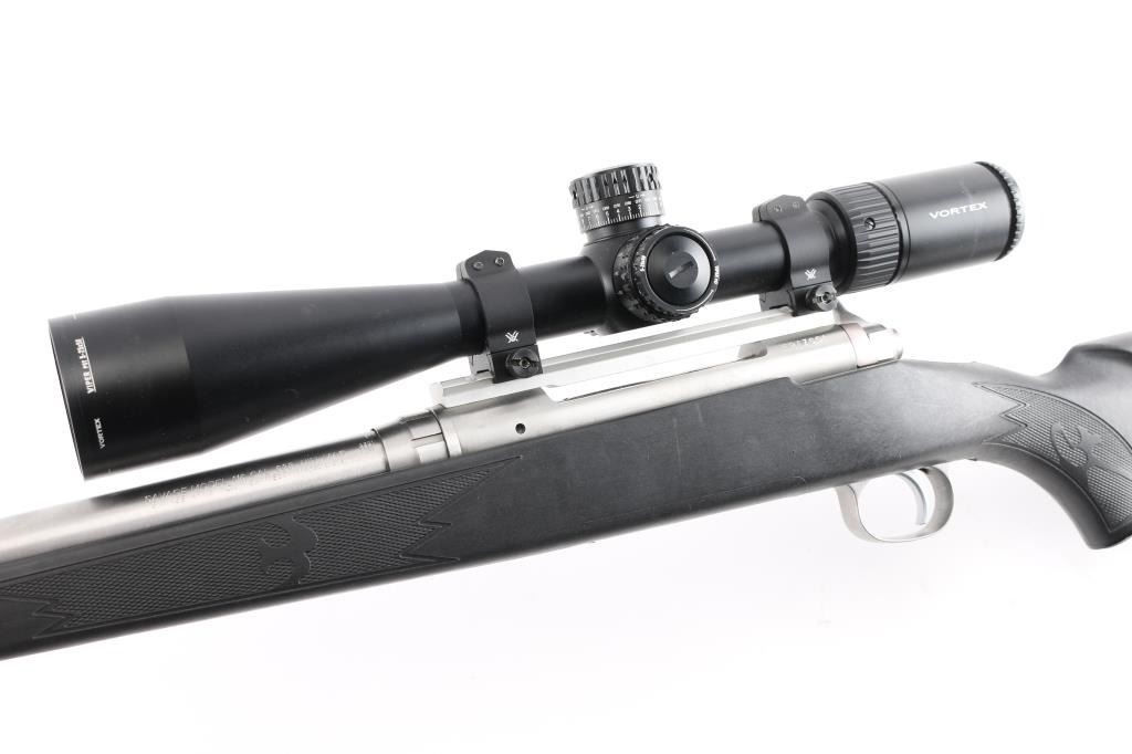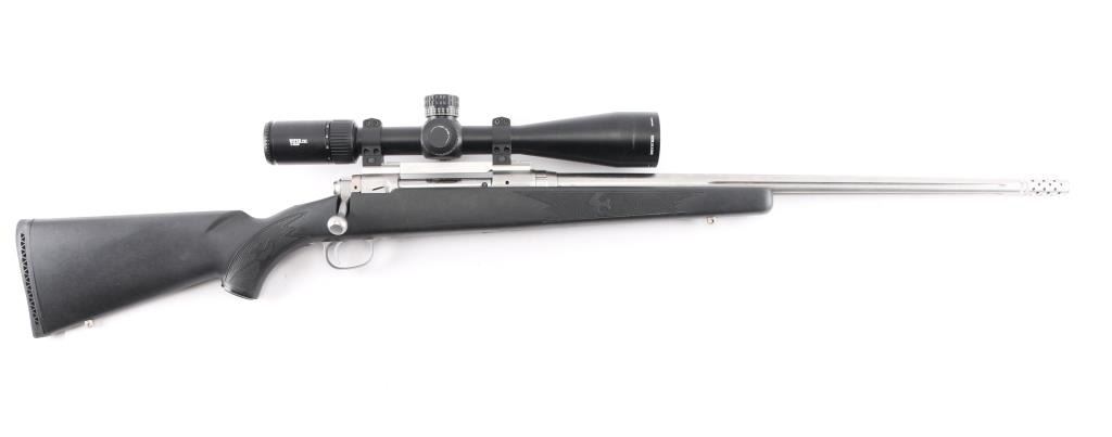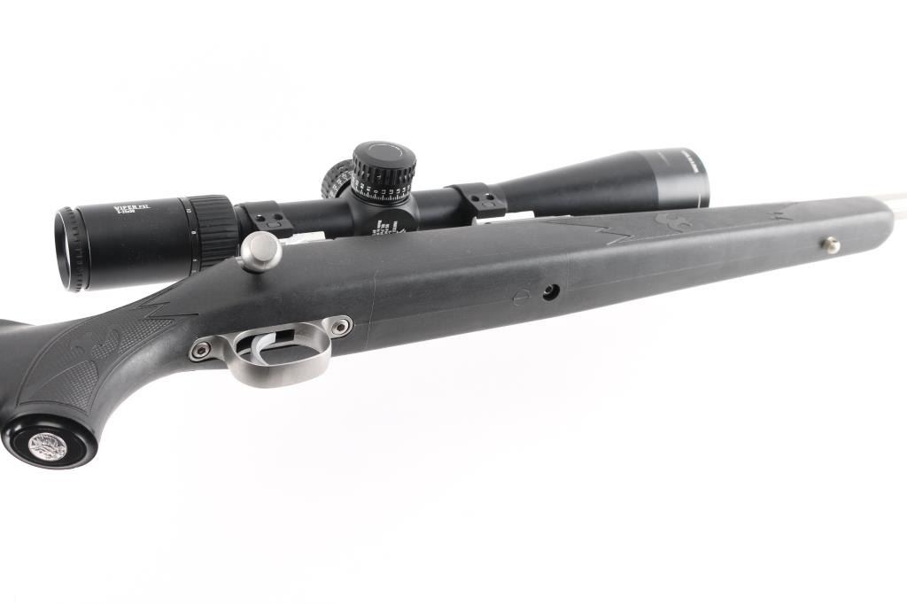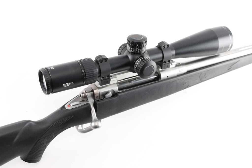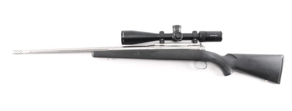 Bolt action rifle features stainless steel construction, black polymer stock with checkered panels at forend & curved wrist, no cheekpiece, solid rubber recoil pad, sling studs, 24" tapered, fluted barrel, muzzle break. no sights. Mounted with a Vortex Viper PST 5-25x50 scope & Vortex rings, blind magazine, manual safety. Bore is excellent condition. Stainless steel surfaces are excellent condition. Stock is excellent,