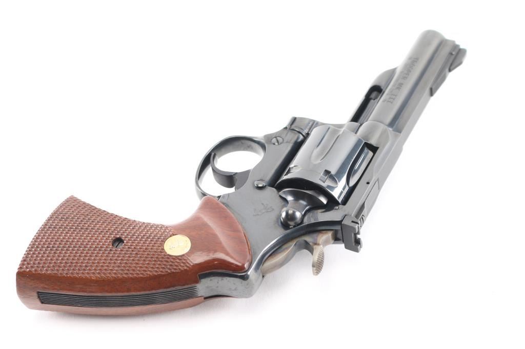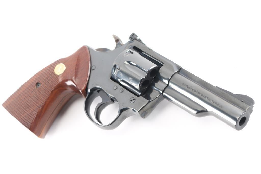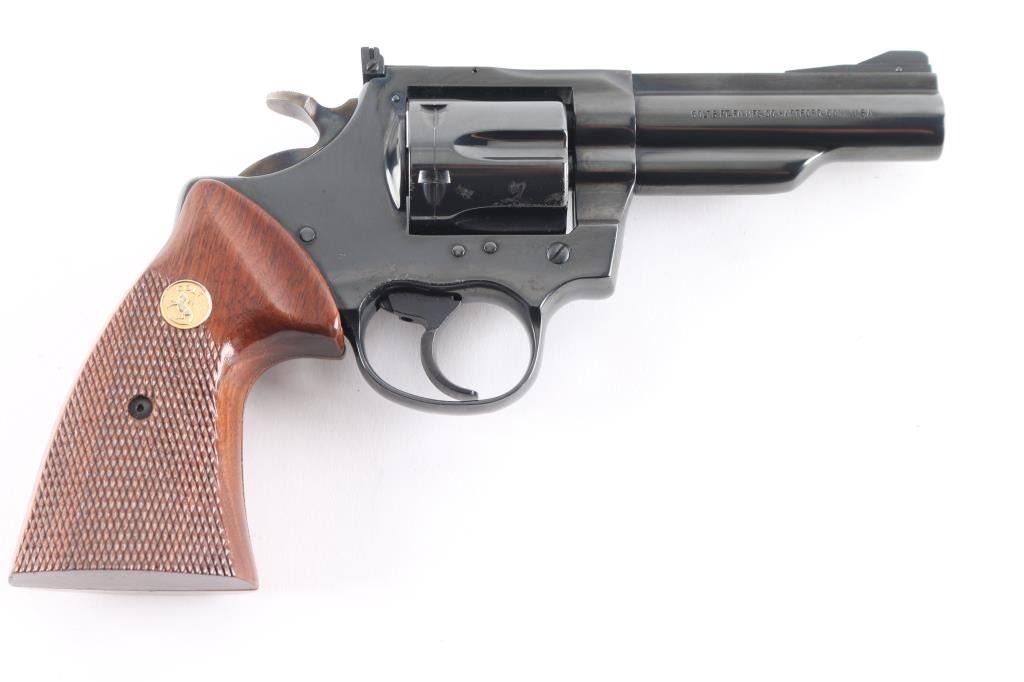 Double-action revolver chambered in .357 Magnum. Manufactured circa 1976. Features a blued finish, 4" barrel with solid top rib, shrouded ejector rod, raised & pinned ramp front sight, adjustable rear sight, fluted six-shot cylinder, smooth trigger, case hardened hammer with knurled wide spur and two-piece walnut checkered grips with rampant Colt medallions. Serrated backstrap. Bore is excellent. Retains 95% deep dark blued finish, with minor edge losses, several small patina patches on sides of cylinder. Grips are excellent. Action is smooth with tight lock-up. Includes very good condition Bianchi brown leather belt holster.
