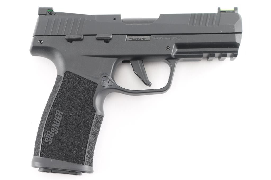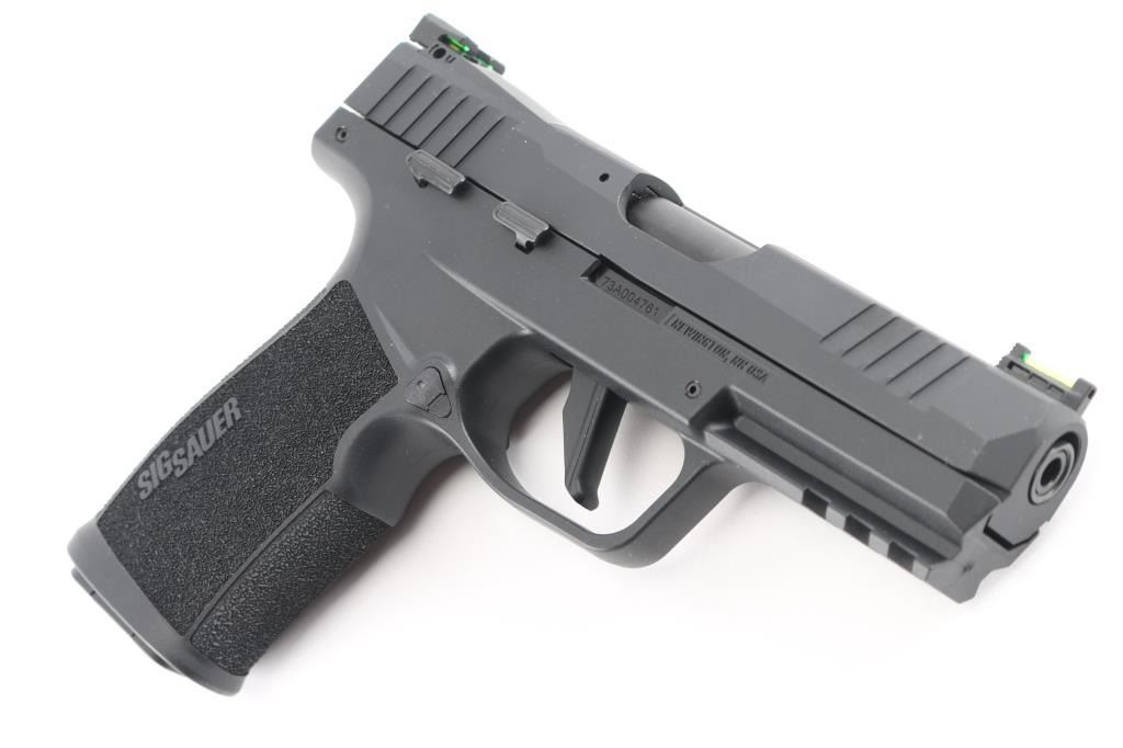 Sig Sauer semi auto SAO pistol. Black polymer frame and stainless steel slide with black Nitron finish. Green fiber optic sights , rear sight is adjustable, 4 inch barrel , with optic ready slide. Ambidextrous manual safety and slide lock. Textured grip and 1913 accessory rail on frame. Comes with threaded adapter for muzzle devices, choice of rounded or flat trigger shoe and two 20 round double stacks mags. Hard plastic case with manual. Pistol is unfired and new excellent at 100%.