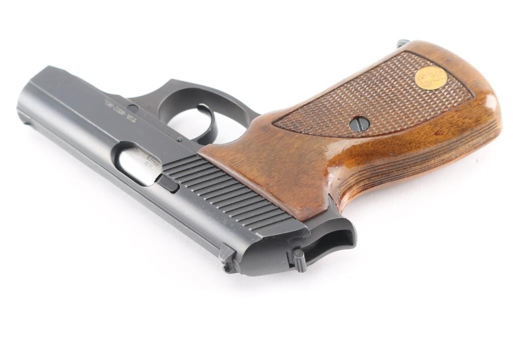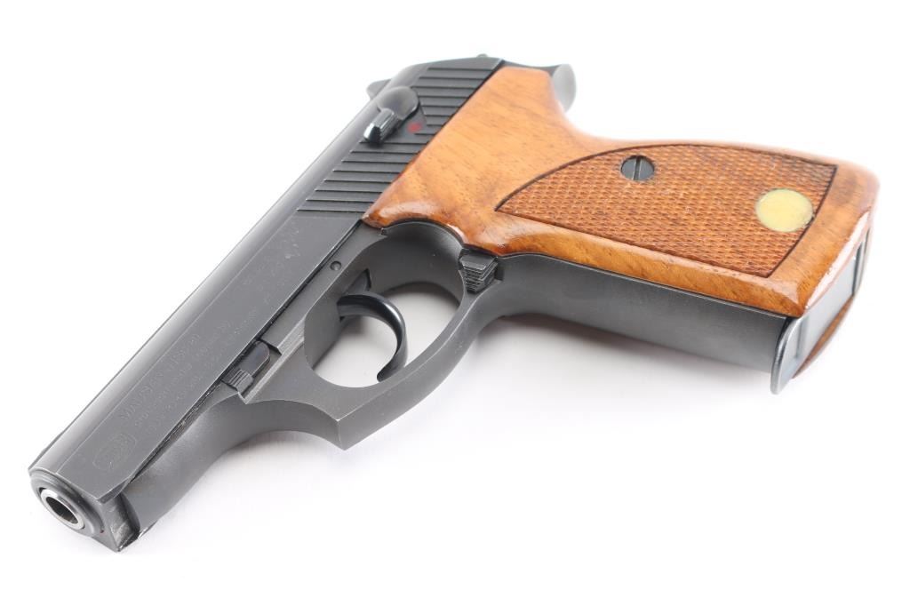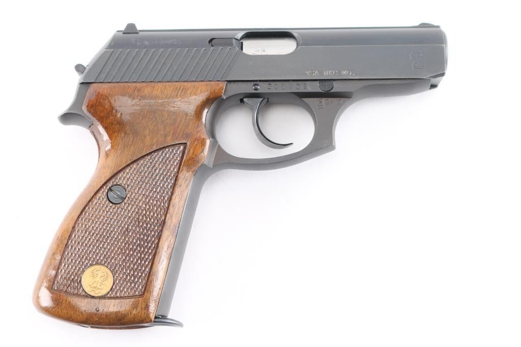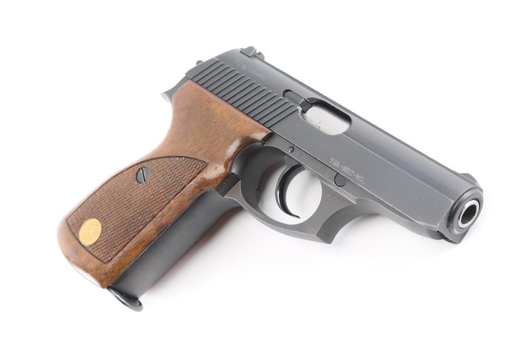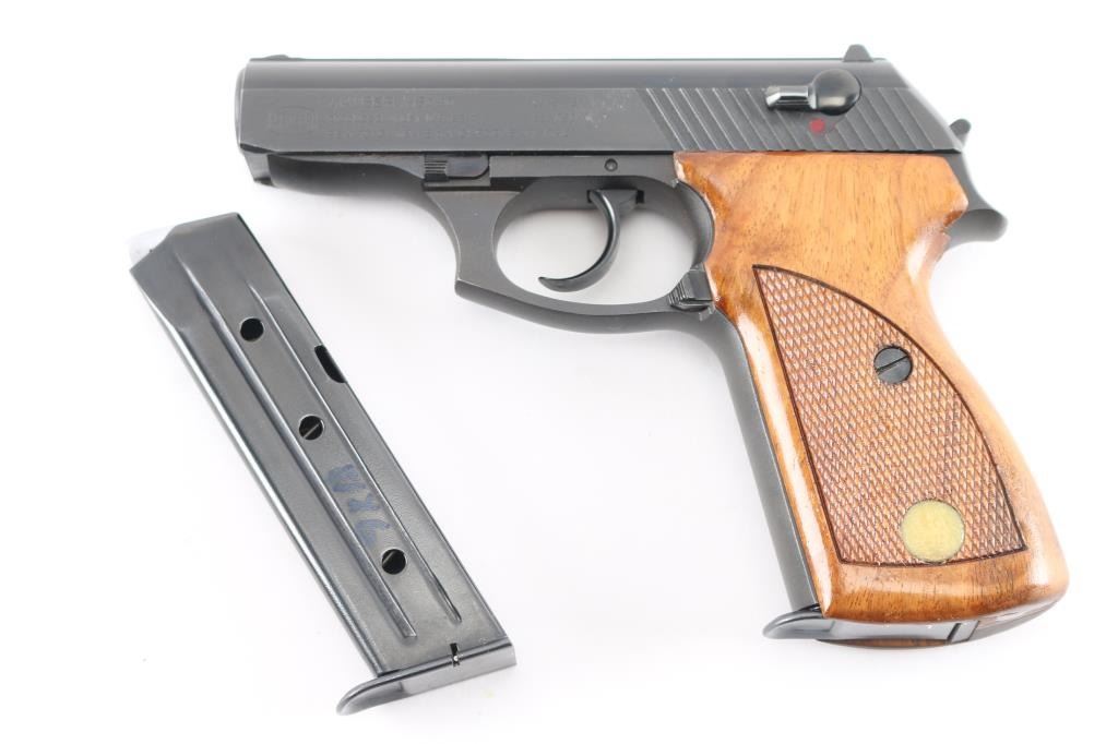 Sn: 300239 Also known as a model 80, this pistol was made in Italy by Renato Gamba, under license from Mauser in Germany, and imported by Interarms of Alexandria VA. Features blued finish, checkered wrap-around walnut grips, manual safety, fixed front sight, dovetailed rear sight, double stack magazine holds 13 rounds. External hammer. Bore is excellent. Bluing is near 99% with only slight wear on the muzzle. Grips are excellent, with one RG medallion missing and fill with epoxy. Includes factory shipping box and extra mag.