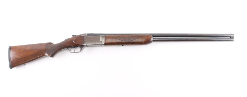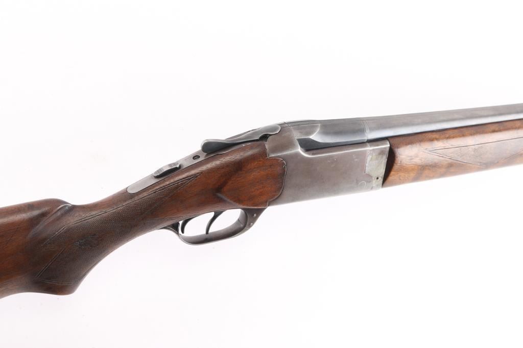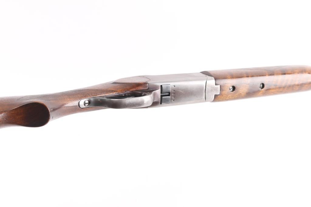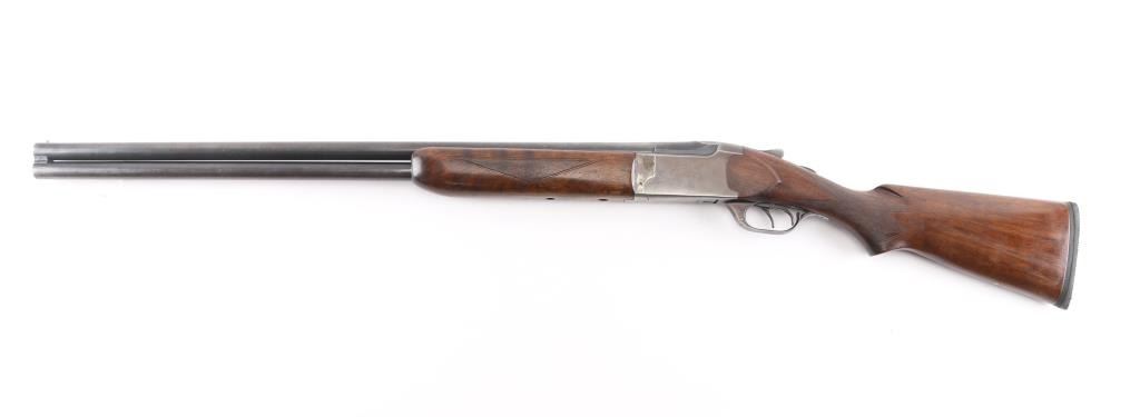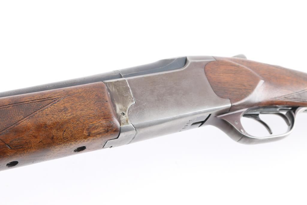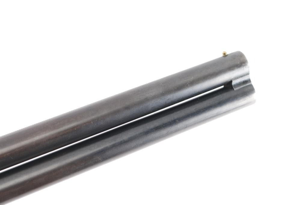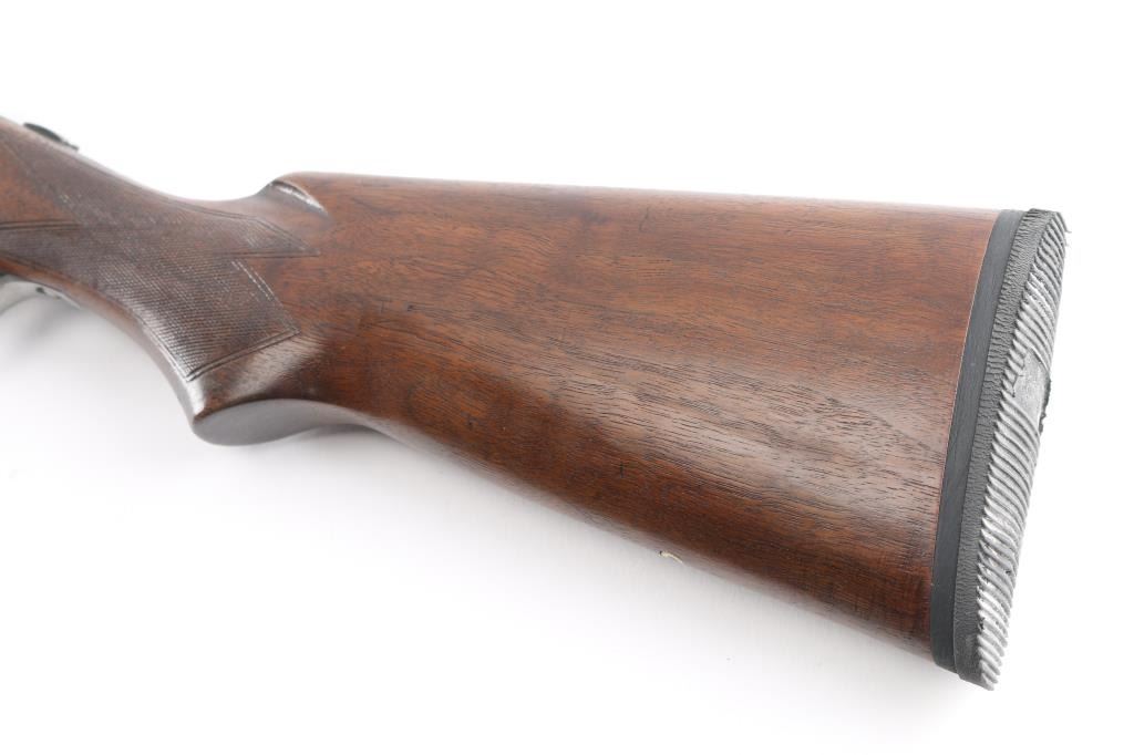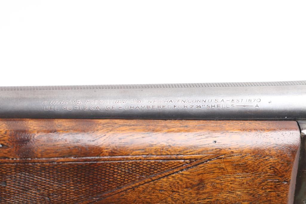 Vintage Marlin model 90 in 12 gauge O/U shotgun. Manufactured 1949. 2 3/4" chambers 30". "JM" marked, round barrels. Top barrel (Full) choke, bottom barrel (MOD) chokes. Rubber butt pad, checkered wood stock and foregrip. Brass bead front fixed sight. Sliding tang safety, double triggers. Bores are very good/bright, tight lock-up, wood is very good/sound, blue is about 40% with handling wear on the lower barrel, receiver,& triggerguard, receiver is starting to turn a brown patin,and the barrel extension has scratches leaving bright metal. Matching serial numbers. LOP 13 3/4".