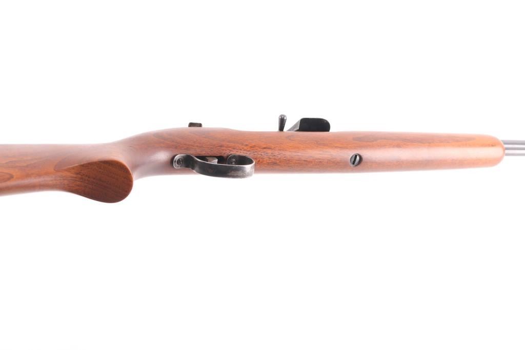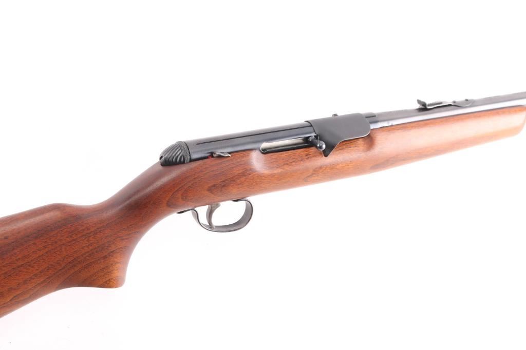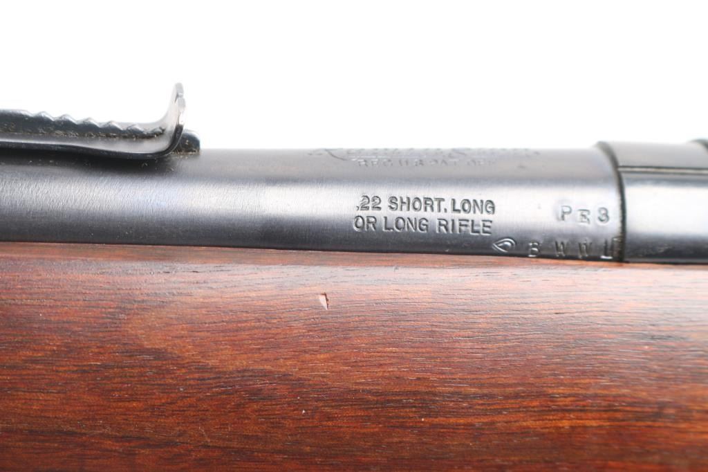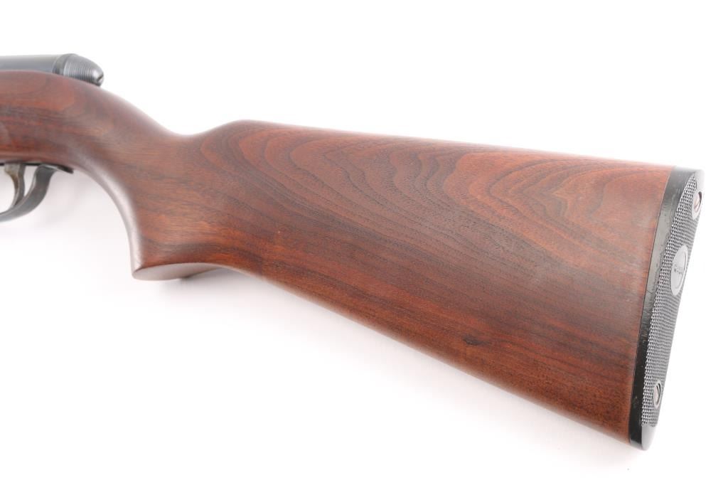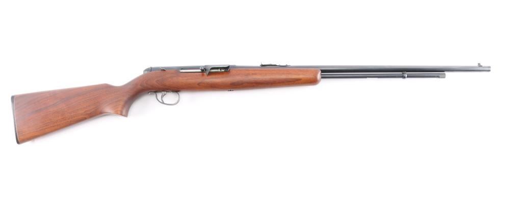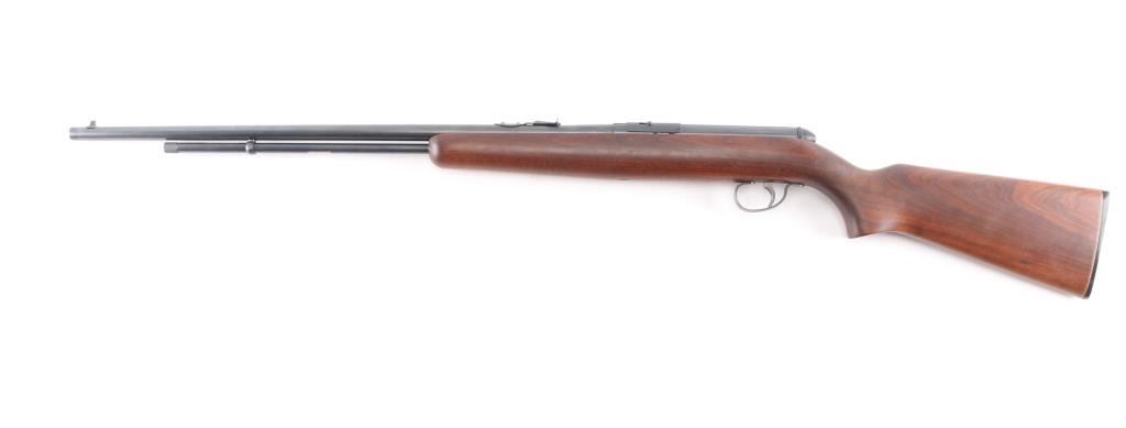Vintage American made tube-fed semi-automatic sporting rifle chambered in .22 Short, Long or Long Rifle. Features a blued finish, 24" barrel, 4/5 length magazine tube dovetailed blade/bead front sight, adjustable rear sporting sight, case hardened serrated trigger, manual safety, baton shaped charging handle . downward shell deflector installed on receiver,and one-piece smooth wood pistol grip shoulder stock with factory hard rubber buttplate. Rifle exhibits approximately 96% of it's original blued finish showing very minor scattered handling wear/scratches Action performs well, bore is excellent/bright, stock is excellent.