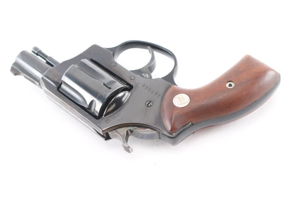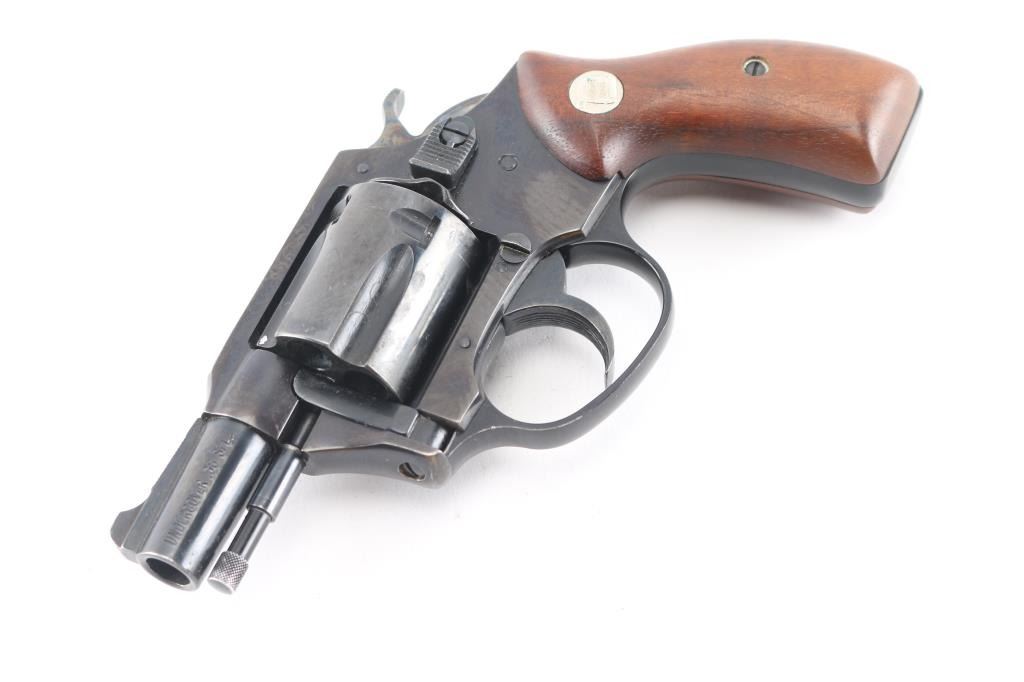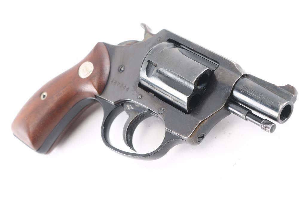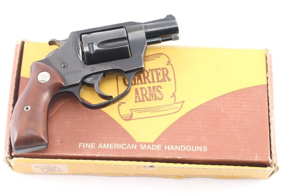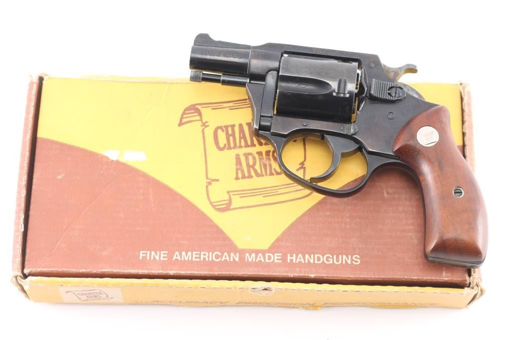 Double/Single action revolver features blued finish, smooth wood grips with Charter Arms medallions, 1.75" barrel, fixed sights, round butt. Bore is excellent/bright. Retains 99% blue with minor scratches. Grips are excellent condition. Action operates smoothly with tight lock-up. Comes in original factory box with matching label. Manufactured 1967-73.