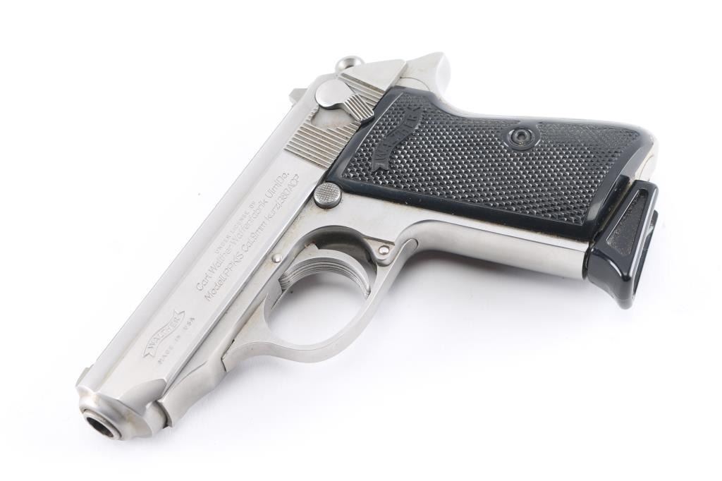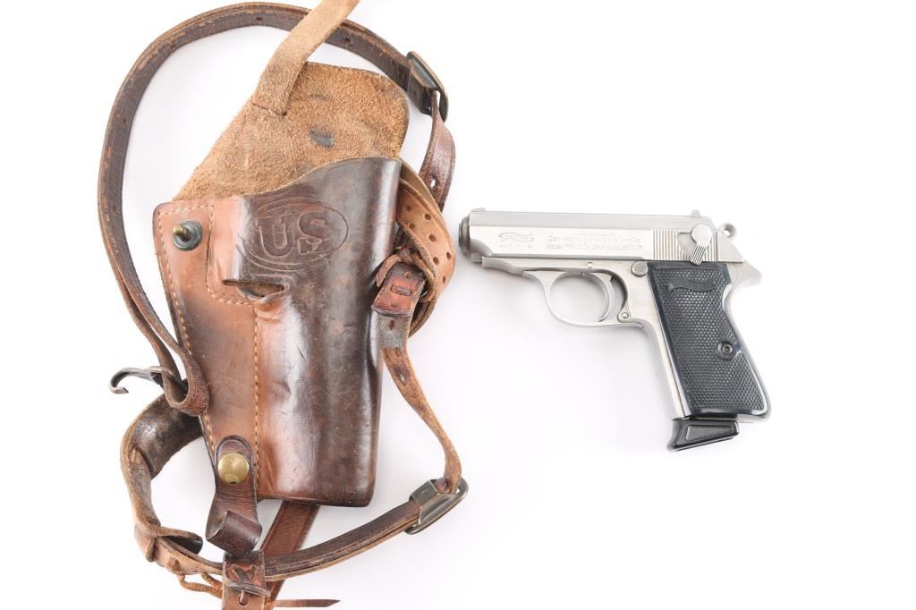 Semiautomatic compact pistol manufactured in the USA under license by Interarms, Alexandria VA. Features stainless steel construction, double action trigger, 3.3" barrel, fixed front sight with orange dot, dovetailed rear sight with square notch & orange bar, serrated trigger, serrated round hammer spur, thumb safety/decocker on the left side of the slide, loaded chamber indicator on the rear of the slide, push button magazine release, factory 7 round magazine with finger rest floorplate, and checkered black plastic grips with molded Walther banners. Bore is excellent. External appearance is very good with scratches and other handling marks, some discolored areas that appear to be dried grease or dirt. Grips are very good. Includes a fair condition leather shoulder holster, US issue, tan with added brown dye, hook for cross strap is broken.