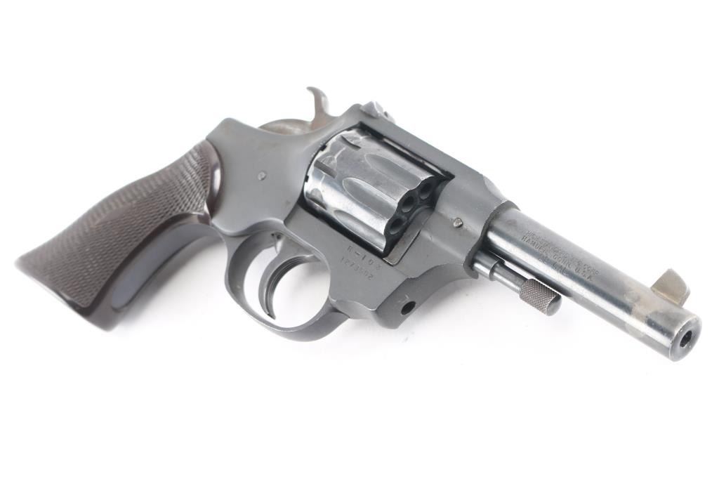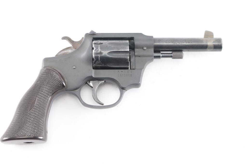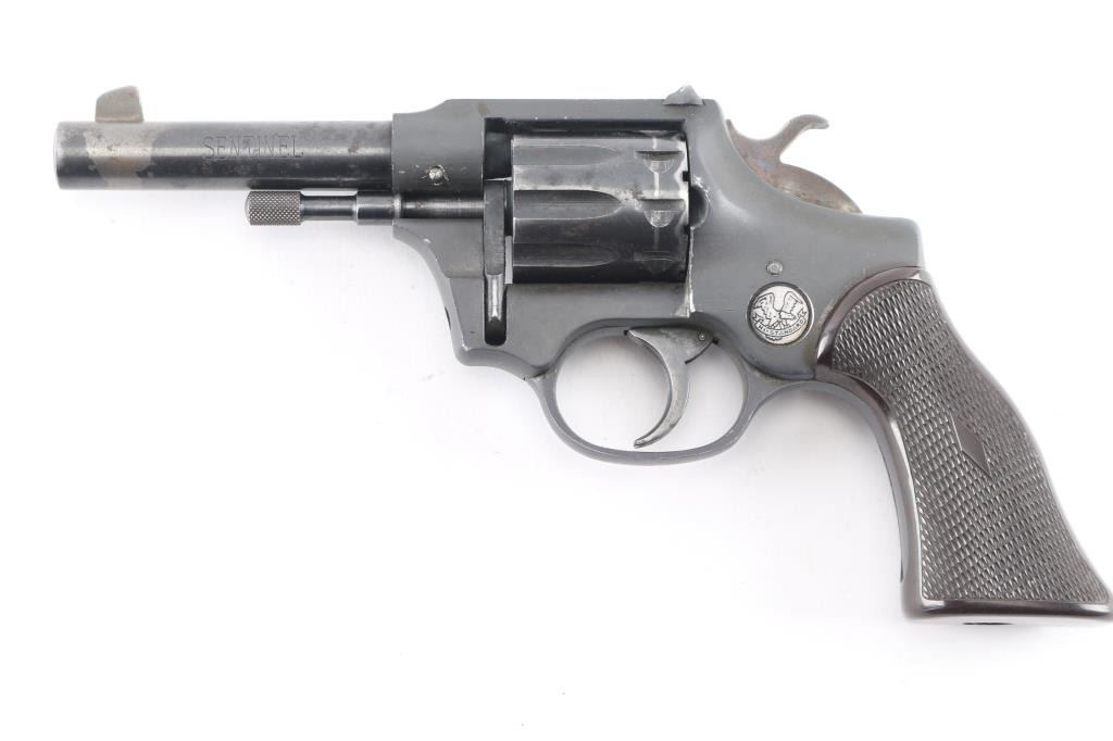 SN: 1273502. High Standard Sentinel R-103 Series Double Action Revolver. .22 caliber, 4" barrel, fixed sights, Blued cylinder, & barrel with brown checkered plastic grip. Black aluminum frame, 9-shot cylinder. Action is crisp/tight, bore is excellent/bright, grip is very good, there is finish loss on the barrel, & cylinder. Manufactured 1961.
