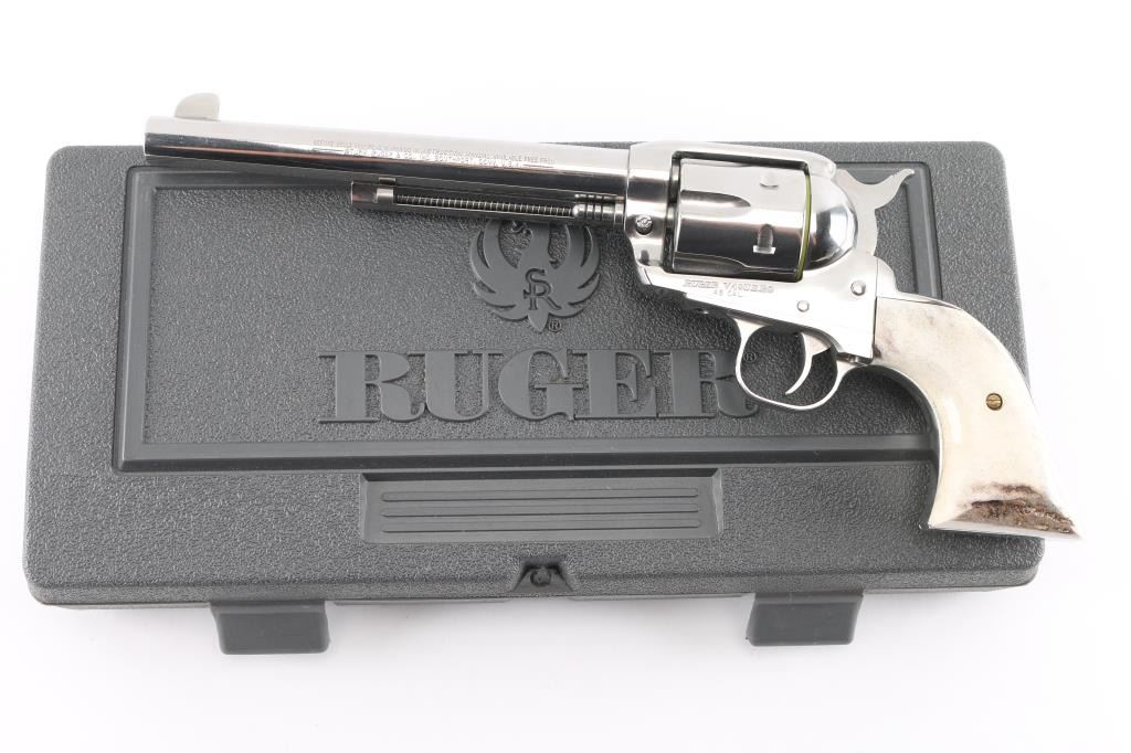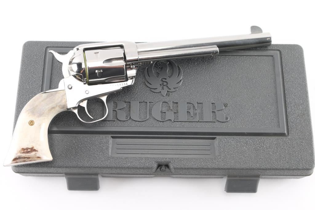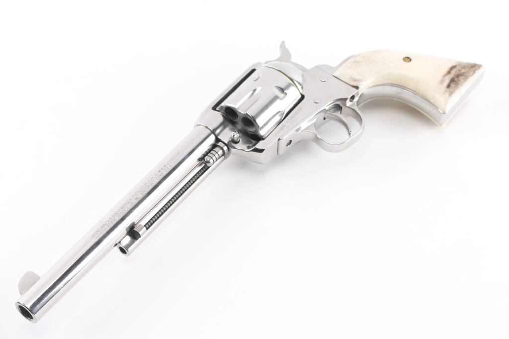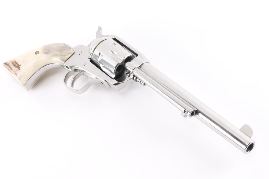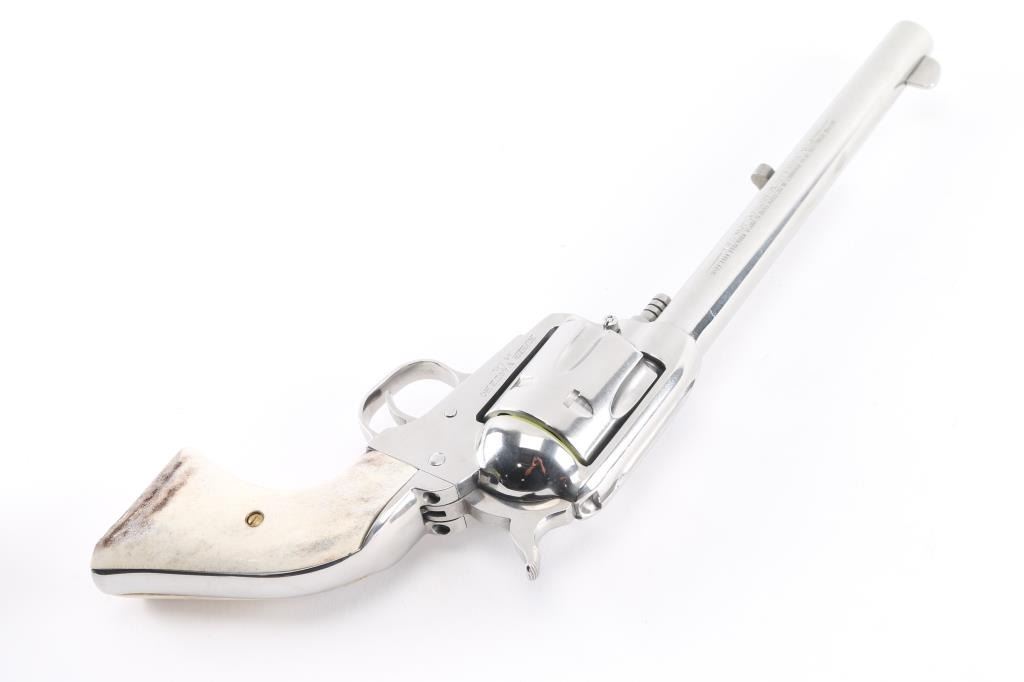 American made single action, 6 shot, revolver chambered for .45 Colt ammunition circa 1996. It features a 7.5" stainless steel barrel, frame and fluted cylinder. It has a blade front sight, integral rear sight, smooth stainless trigger and hammer with serrated hammer spur. It has two piece faux stag grips. The Metal finish looks great with a faint drag line on the cylinder, some minor scratches. Grips look great. Bore looks excellent, bright. Action is crisp/tight. Comes in gray factory hard case with manual, lock.