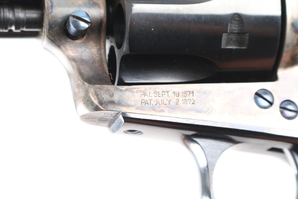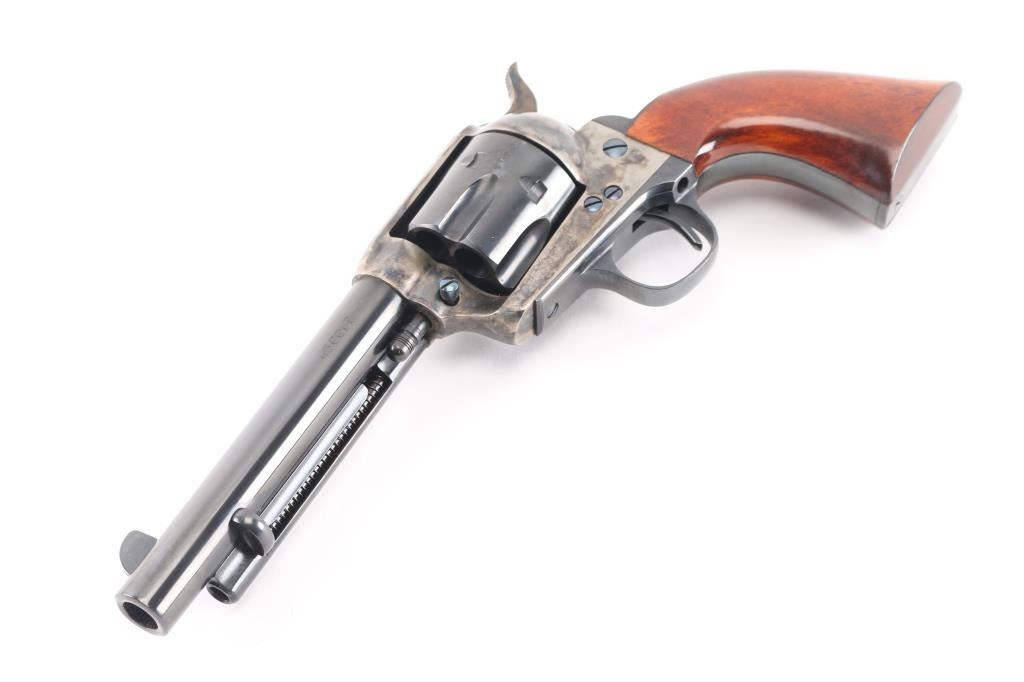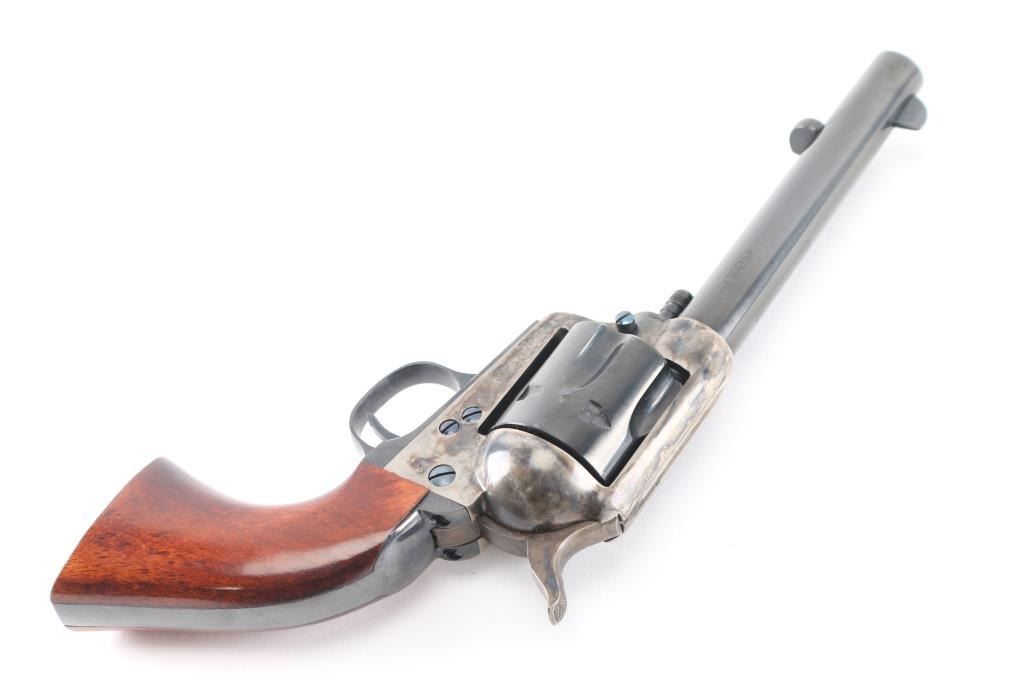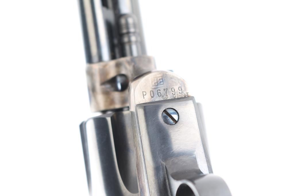 SN: P-06799. Italian made single action six-shot revolver imported by Cimarron of Fredericksburg, Texas, manufactured 2001. Features blued finish, case colored frame, loading gate, hammer, 5.5" barrel, blade front sight, u-notched rear sight, smooth thin trigger, knurled hammer spur, fluted cylinder, ejector rod, smooth walnut grip. Overall condition is like new with few signs of handling. Includes a Colt SAA cardboard box with documents, no label.