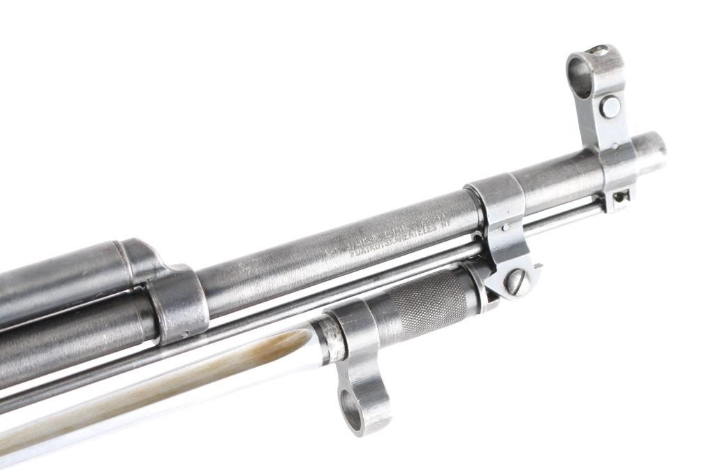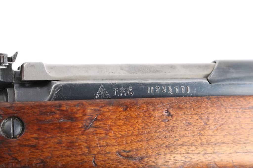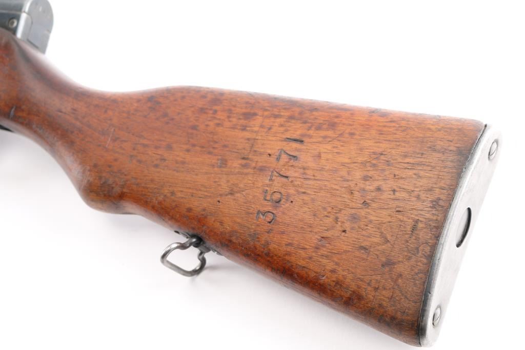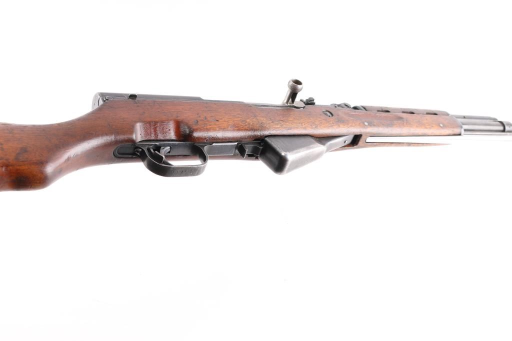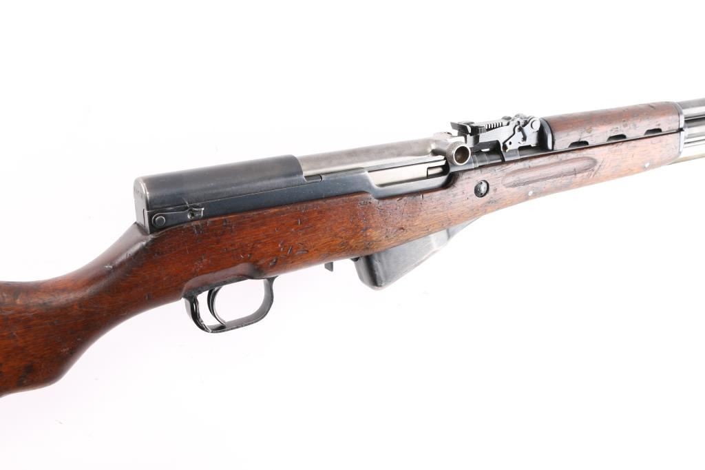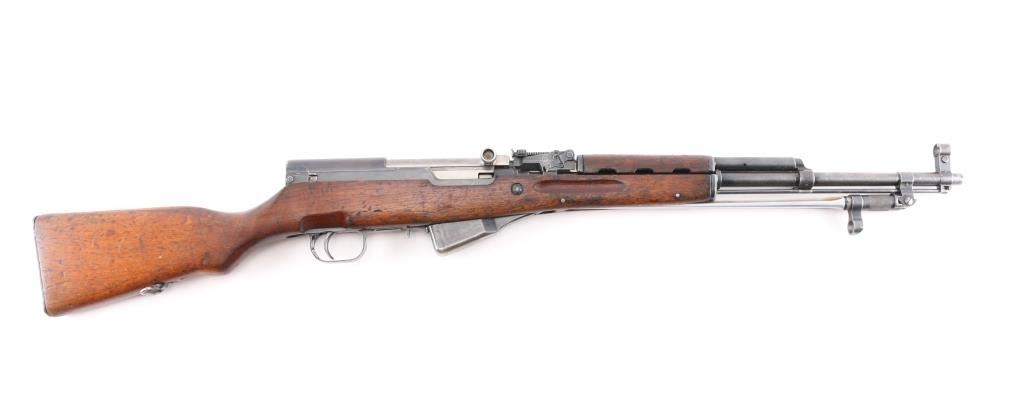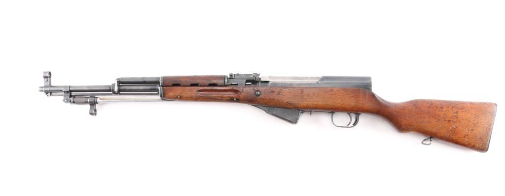 Chinese military semi-automatic service rifle chambered in 7.62x39mm, manufactured at the Jianshe Arsenal (factory 26) circa 1966. Features a blued finish, 20.25" barrel, adjustable hooded post front sight, tangent rear sight graduated to 1,000 meters, missing cleaning rod and under folding spike bayonet. It has a smooth trigger, manual safety in the rear on the triggerguard, 10 round fixed magazine, smooth laminated wood handguard, and semi-pistol grip shoulder stock with finger grooves in the forend & smooth metal trapdoor buttplate. Matching serial numbers are found on the receiver, bolt, bolt carrier, trigger guard, stock, and magazine. Metal finish looks good showing some scattered handling marks/wear. Action is smooth, the bore looks good and the wood stocks are good but does show some wear as is to be expected. Import marked on left barrel "FOXTROT SKANEATELES NY"