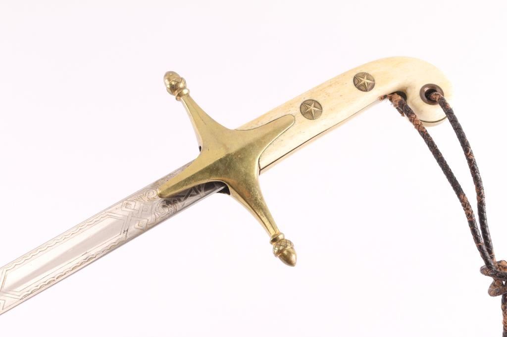 Ricasso is marked with maker "Jacob Reed's Sons" which went out of business in 1883. Very scarce19th century version of the USMC M1875 officer’s 'Mameluke'. 19th century versions of this sword are quite hard to find. The scarcity is due to the small size of the Marine Corps at this time. At the turn of the century there were fewer than 300 Marine on active duty at any given time. The 29" blade is slightly curved and carries a single broad fuller for most of its length that divides into two narrow fullers, nicely strengthening it for a thrust, about 12 inches from the spear point tip. The blade is smooth metal, in the bright, with good edges and tip. On both sides a central panel is etched with swallow-tail banner reading, “US MARINES” between to foliate terminal E/G/A, American flag motifs. The brass guard with double langets and acorn finials, two star-embossed rivet caps on either side of the nice ivory grip. The hole for the sword knot in the pommel has brass washers, period brown leather sword knot in place. The regulation scabbard has brass fittings. Overall very good condition, grip, brass fittings are excellent, sword knot is worn with some scuffs, the blade is bright, no nicks, but has some scattered spots of dark pitting. These swords are very scarce, and do not appear often. A rare opportunity to acquire one.