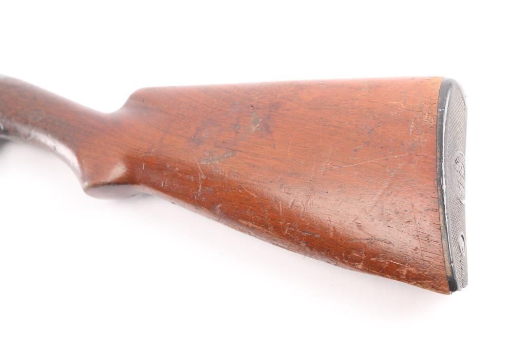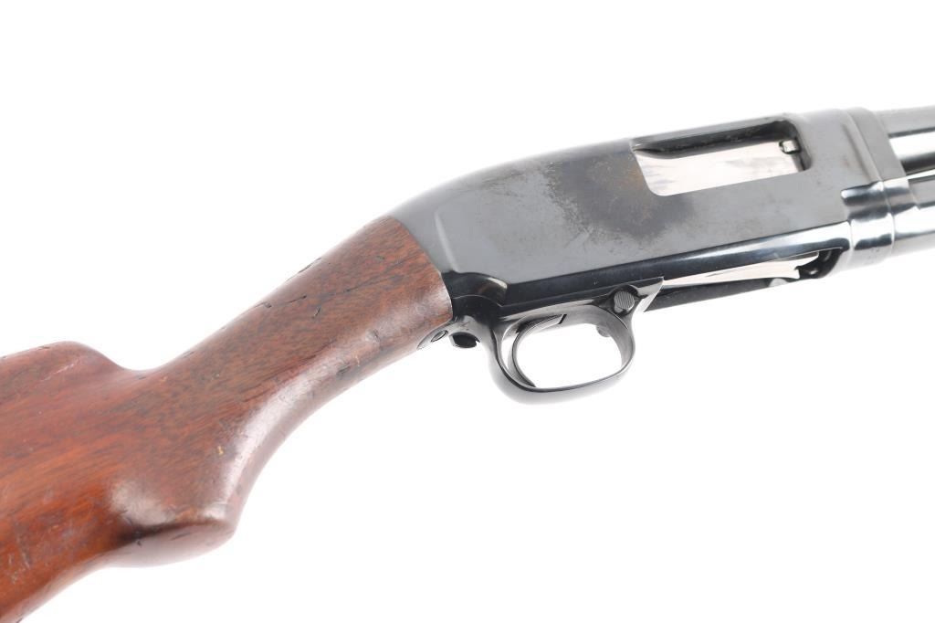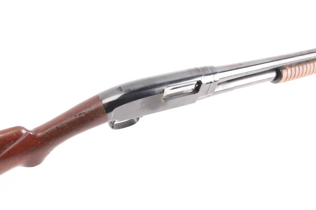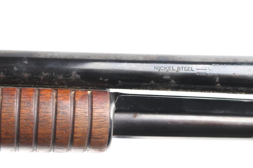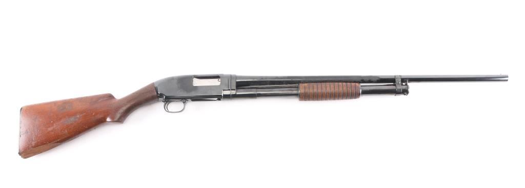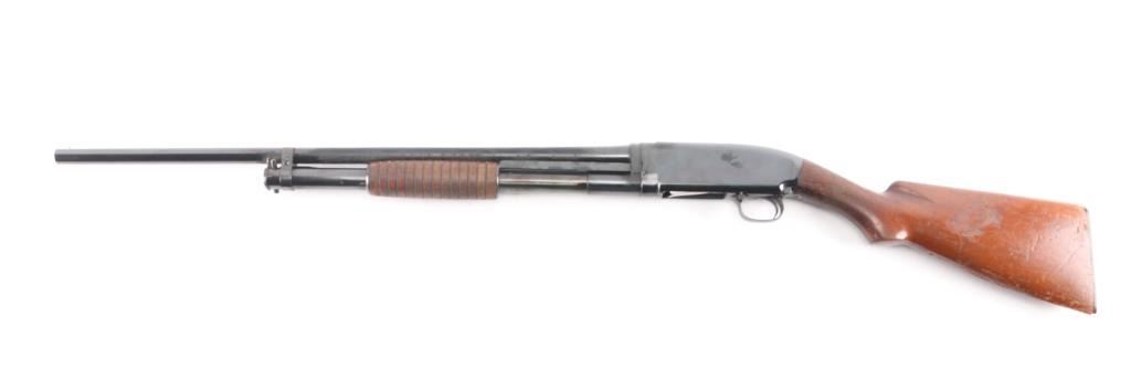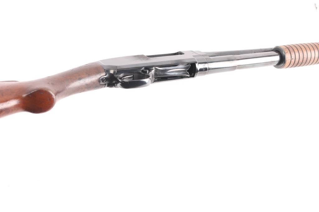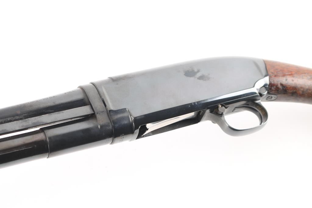 Vintage slide action repeating shotgun chambered for 2 ¾” 20 gauge shells. Manufactured in New Haven, CT circa 1913. Features a blued refinish, 25” plain take-down barrel marked “FULL”, brass bead front sight, 6 round tube magazine, smooth curved trigger, cross-bolt safety, polished bolt, polished carrier, single action bar, grooved walnut slide handle and smooth semi-pistol grip shoulder stock with factory buttplate & 13 9/16” LOP. Shotgun retains approximately 70% of its high polish blued refinish showing wear and scattered rust. The action is mechanically sound other than the safety which appear frozen or hard to work, the bore is bright and the walnut stocks are fairly rough with blemishes & a large chip of wood missing from the toe.