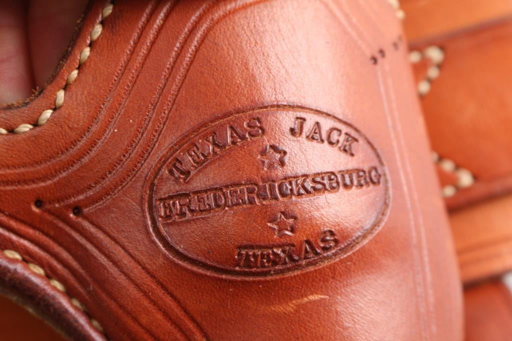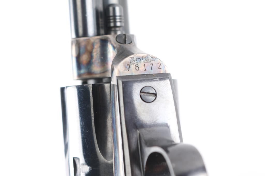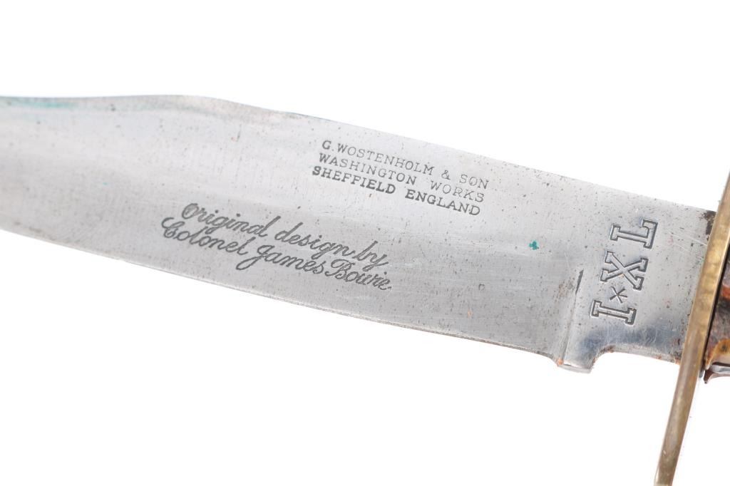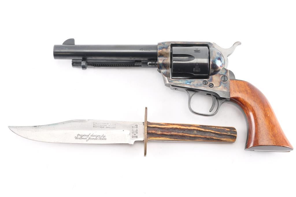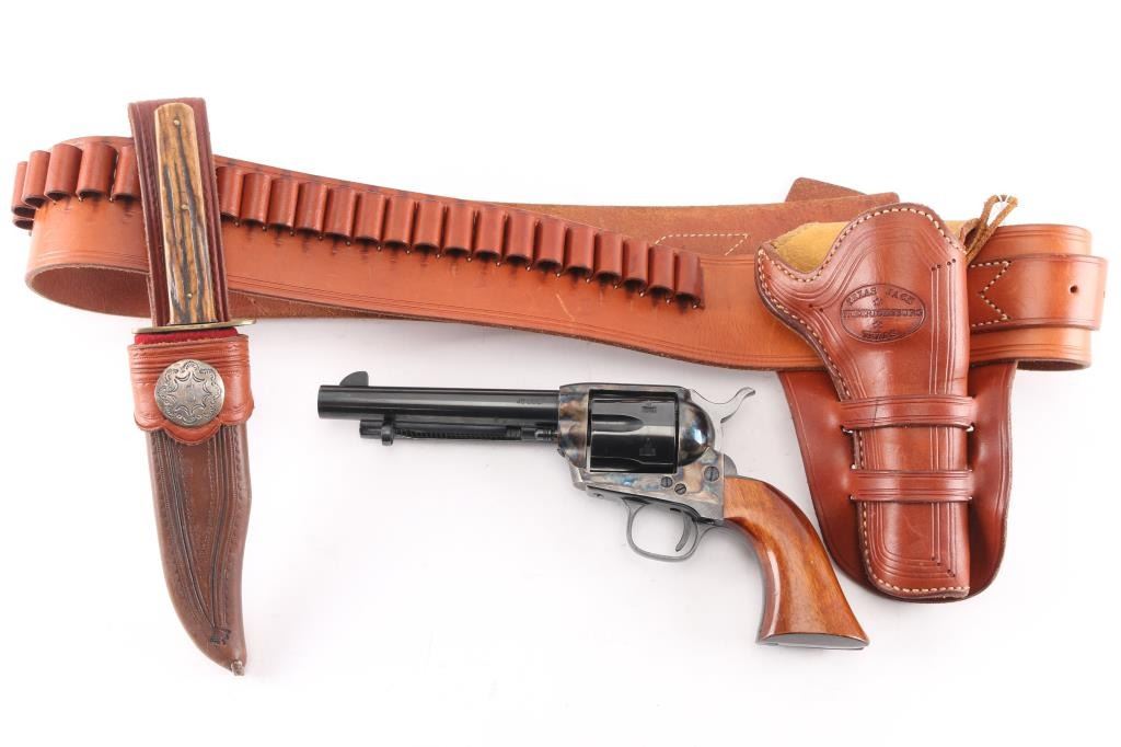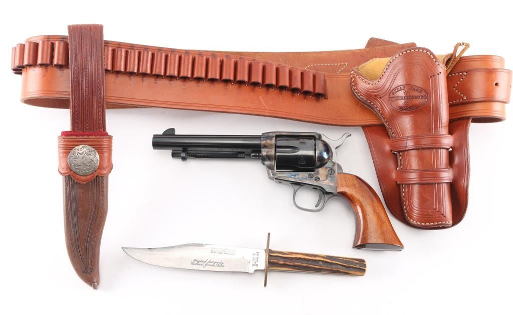 SN: 76172. Single action revolver made in Italy by Uberti, imported by EMF, Santa Ana CA. Features blued finish, case color receiver, smooth wood grips, 5.5" barrel, fixed sights, ejector rod under barrel. Bore is excellent/Bright. Overall condition is near new with few signs of handling or use. Very minor muzzle wear. Texas Jack brand (actually made by El Paso Saddlery), double loop Mexican style, border tooled and lined holster, 36 loop cartridge belt for .45 Colt. Both belt and holster are marked 'Made in Texas'. Also included is a antique George Wostenholm & Son I XL genuine stag handle hunter. Made at the Washington Works in Sheffield, England. Full tapered tang with brass handle pins, brass double guard. Knife is stamped as follows: G Wostenholm & Son - Washington Works - Sheffield England. Tang is stamped I (star) X L. Stamped on blade in cursive script: Original design by Colonel James Bowie. Blade length is 6" x total overall length 10"This rare Wostenholm bowie knife is in excellent condition with a nice patina. It is contained in a Garrett W. Roberts of Camp Verde, Arizona custom sheath with silver concho inscribed with "E". The whole rig is in very good condition. Size is approx. 36-40.