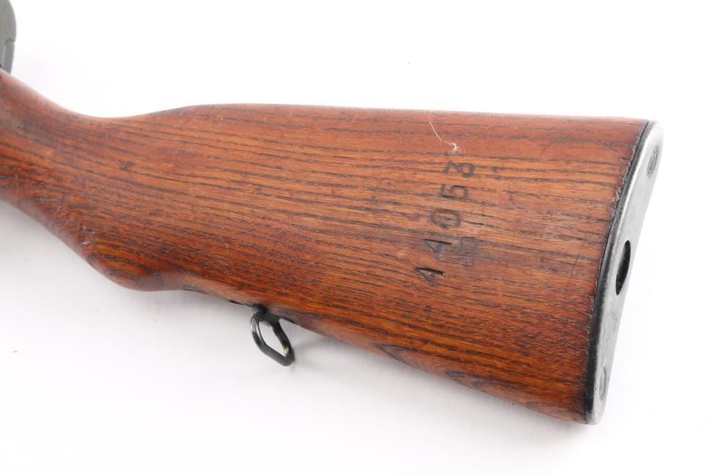 Zastava M59 PAP, also known as Papovka, is a Yugoslav licensed version of Soviet SKS semi-automatic rifle.'Mdl 59' Yugoslavian made gas-operated semi automatic rifle chambered in 7.62x39mm. Imported by CAI, right barrel. Features a blued finish, 20.5" barrel, hooded post front sight, tangent rear sight graduated to1,000 meters, cleaning rod, folding blade bayonet, manual safety, smooth trigger, fixed 10 round magazine, smooth wood handguard, pistol grip shoulder stock and trapdoor metal buttplate. Matching serial numbers on the receiver, bolt carrier, magazine, and stock. Rifle is lightly coated with cosmoline from storage. Rifle retains approximately 94% of it's blued finish, with some minor edge wear, scratches/rubs, bore looks ok good with frosting in the grooves, dried cosmoline, should improve with cleaning. and wood stocks are good+ with several minor dings & gouges. Serial numbers puts it at pre 1967,