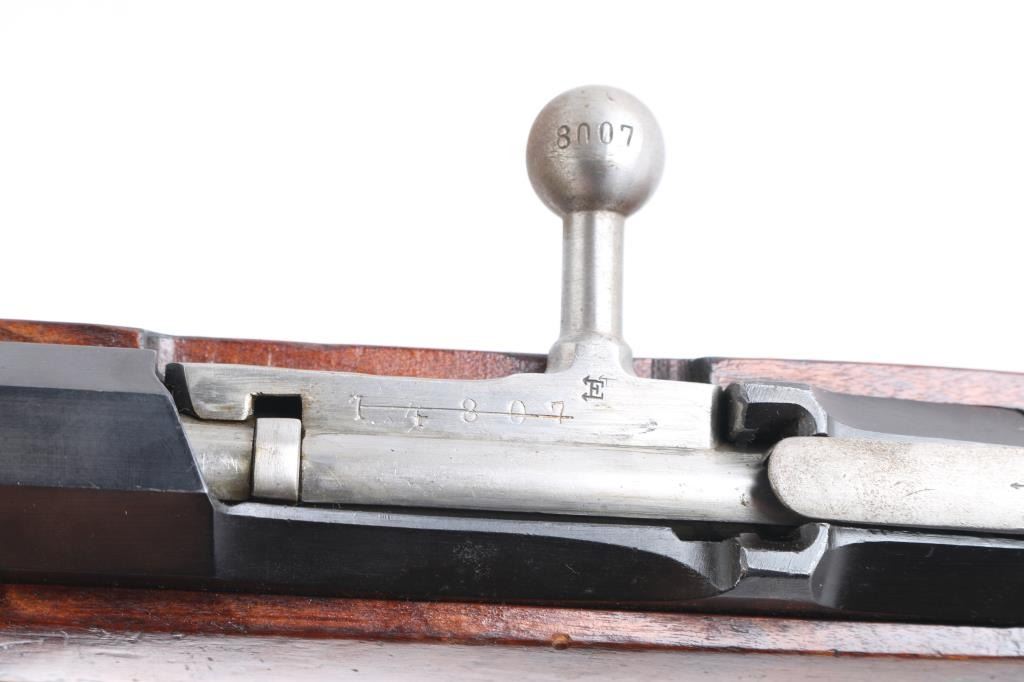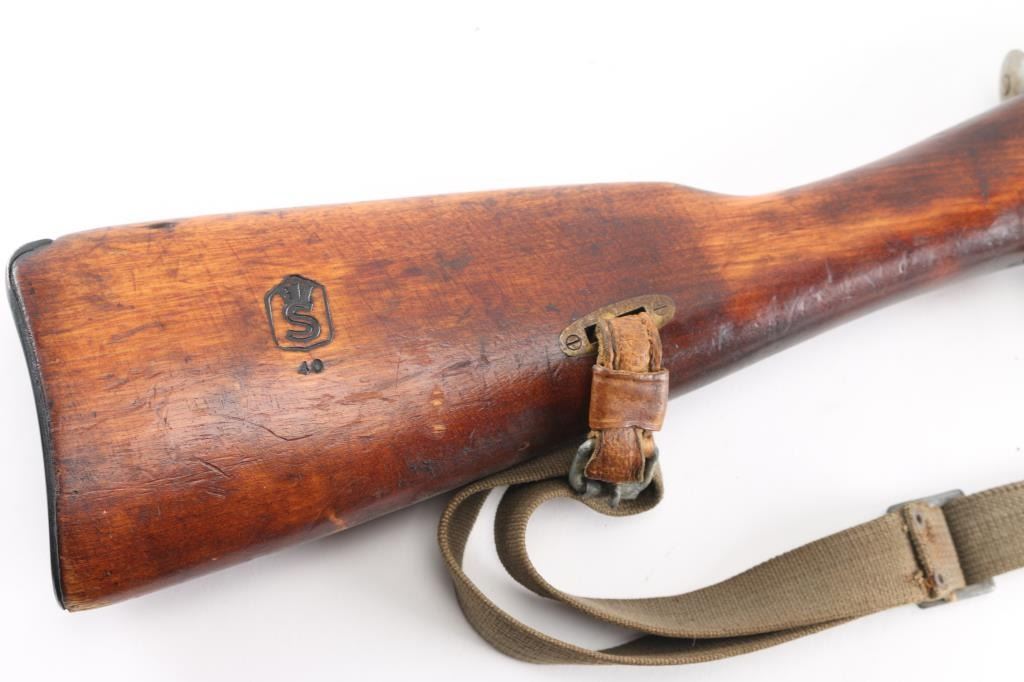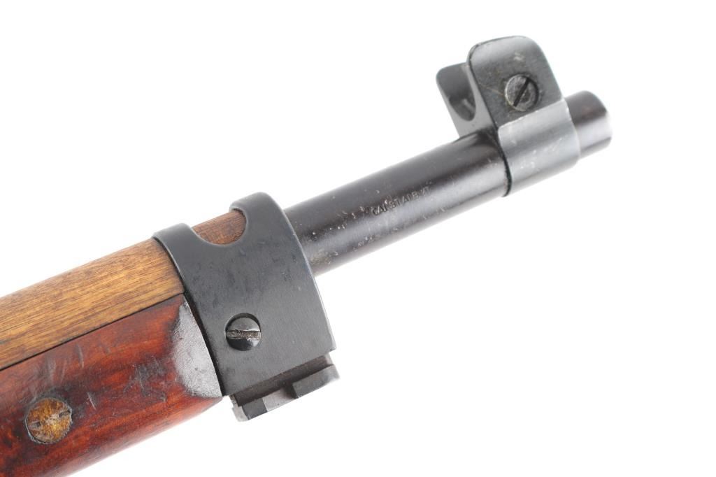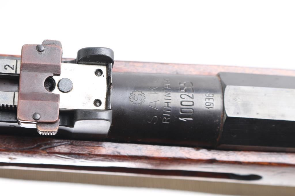 SN: 100255. Very rare Sako, Riihimaki marked Finnish military bolt action rifle, dated 1936, imported by CAI, Vermont. Riihimaki (Drying Barn Hill) is a town in the south of Finland where a Sako arms factory is located. Features blued finish, bolt assembly in the white, wood stock & handguard, 27" barrel, protected blade front sight, tangent type rear sight also flips up to serve as a ladder sight, cleaning rod missing, bayonet lug, sling slots. Bore is very good/bright, with strong rifling. Blue finish is about 95% with minor edge wear/scratches. Wood is good condition with scrapes and gouges, finish loss on the handguard. Markings include: "SA", "S" inside gear logo on the barrel, & sight base, divot on hex receiver where Russian Imperial eagle was removed, "S" in shield stock cartouche (for SKY). Mismatched bolt. Comes with original period green canvass "Dog Collar' sling marked "SA".