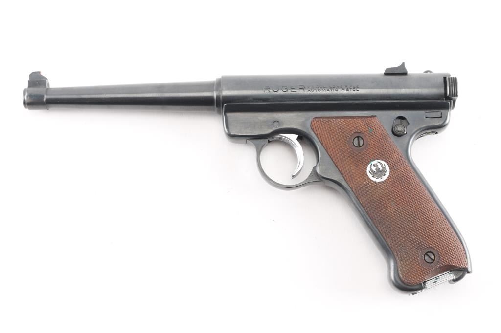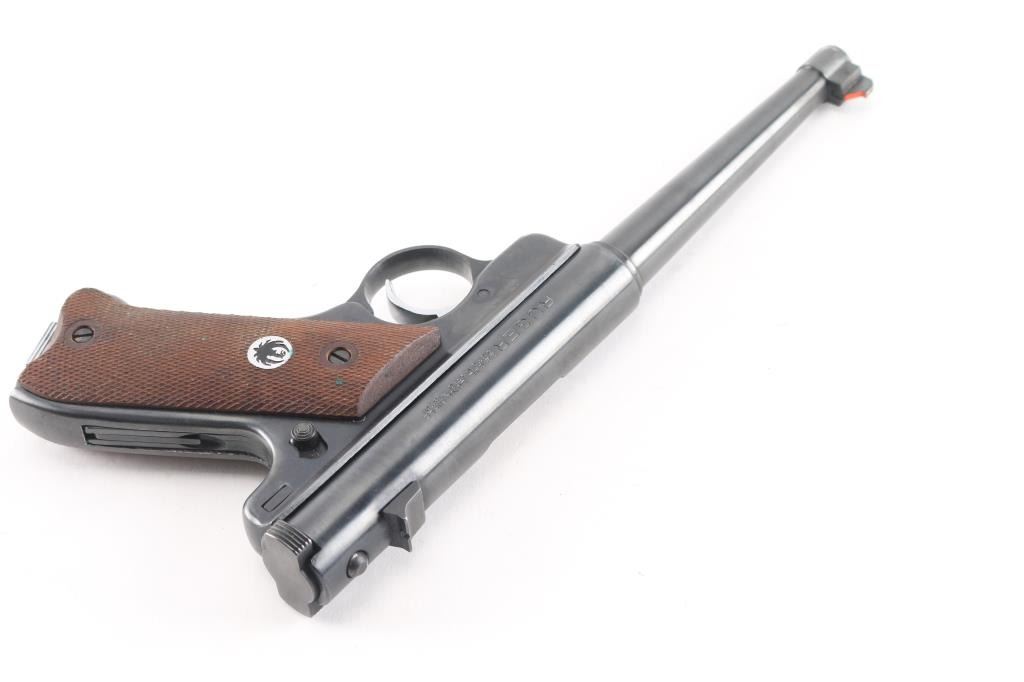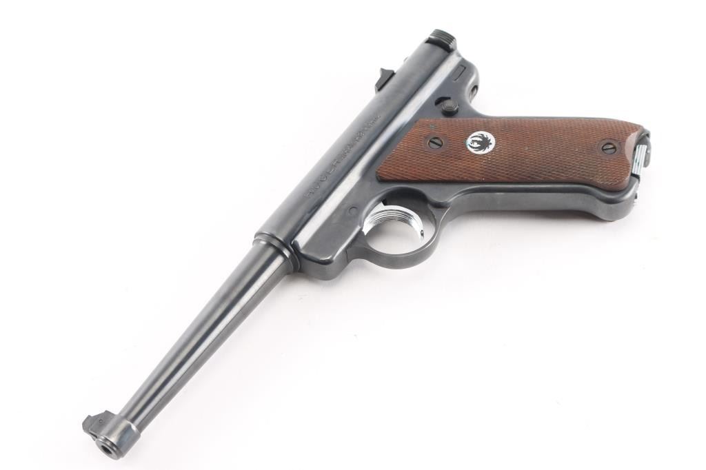 Blowback operated single action semi-automatic target pistol chambered in .22 Long Rifle. Features a blued finish, 6" tapered barrel, pinned patridge front sight, dove tailed square notch rear sight, serrated wide trigger, concealed hammer, manual safety/bolt catch on the left side of the frame, serrated cocking knobs on the rear of the bolt, heel magazine release, after market 10 round magazine, and two-piece checkered wood grips with a silver/black Ruger medallion in the right panel. Pistol exhibits approximately 97% of it's original blued finish showing minor wear. Action is smooth, the bore is excellent/bright., and the grips are excellent.