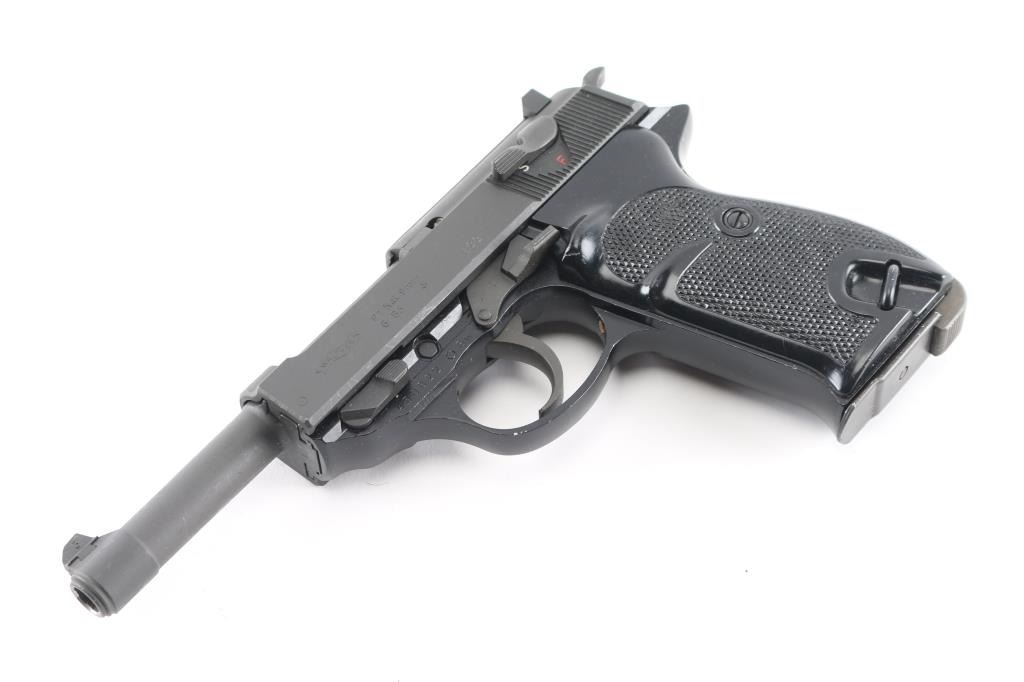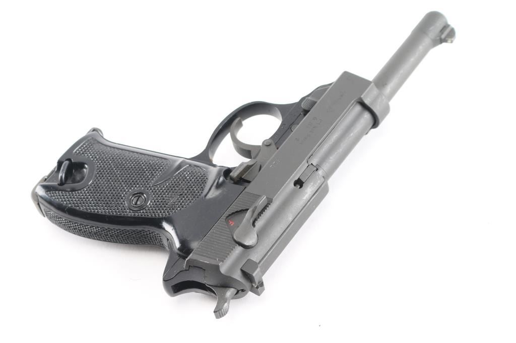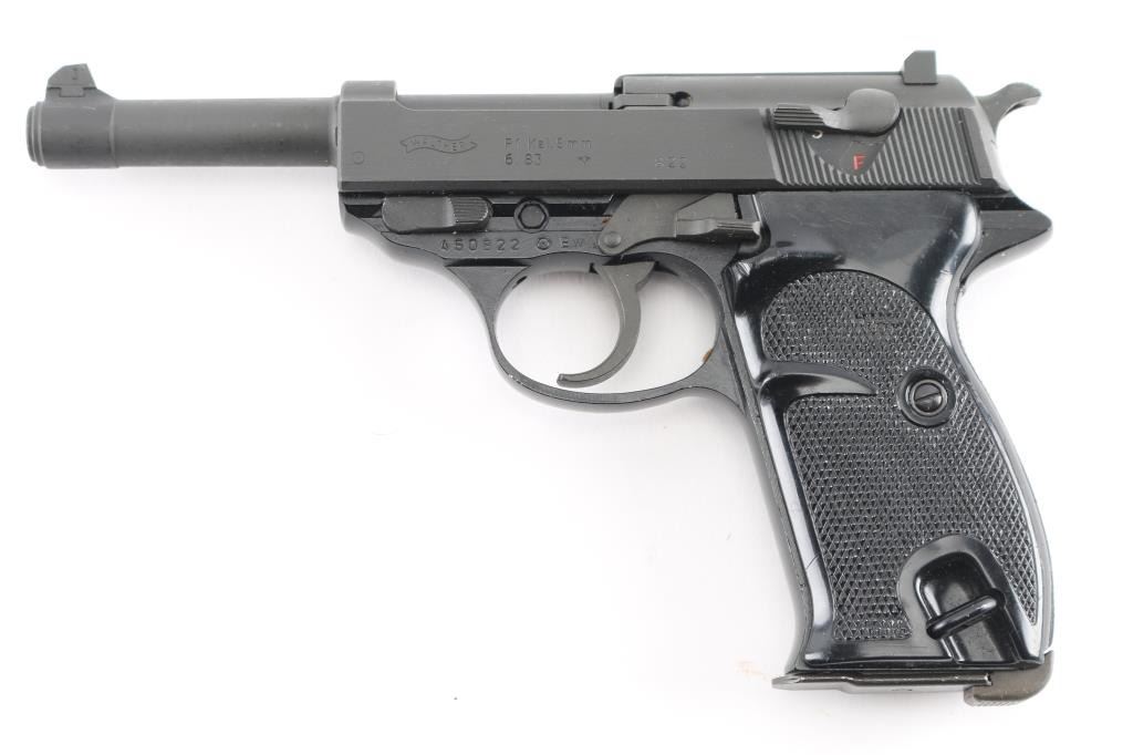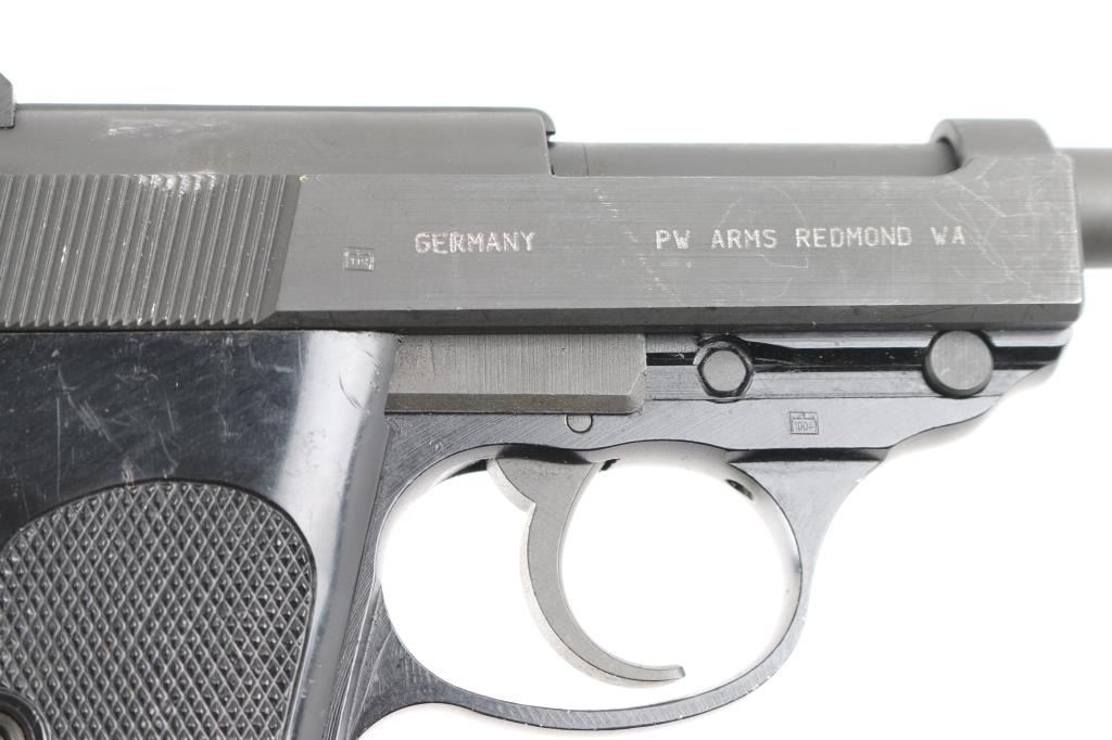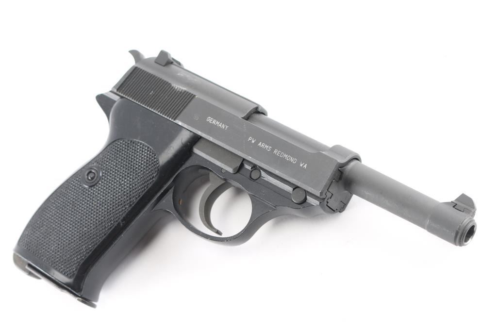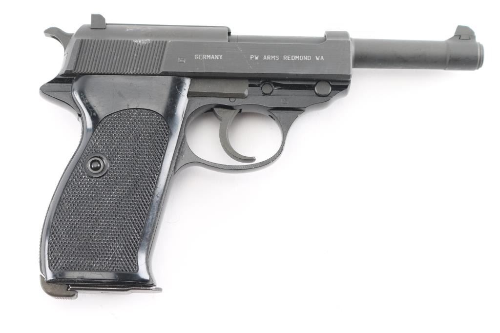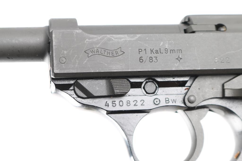 German double action semi-automatic pistol chambered in 9x19mm, imported by PW Arms, Redmond WA. Slightly updated P.38 made after WWII with an aluminum frame. Dated 1983. Features a dark gray parkerized finish on steel parts and black anodized finish on the aluminum alloy frame, 4.9" barrel, dovetailed blade front sight, square notched rear sight, smooth trigger, serrated hammer spur, thumb safety/decocker, lanyard loop on frame, heel magazine release, two-piece checkered black plastic grips. Bore is very good. Retains 90% finish with handling wear, scuffs and edge losses. "BW" marking (for German Bundeswehr). "822" stamped on slide and on barrel. Includes one "Walther P1" marked magazine.