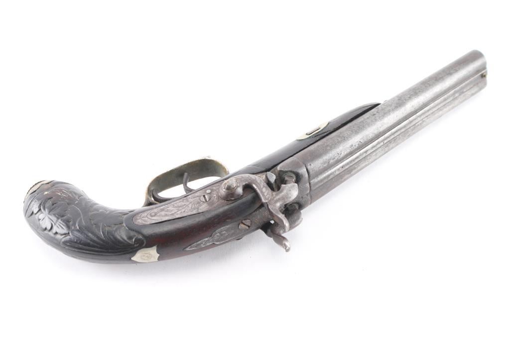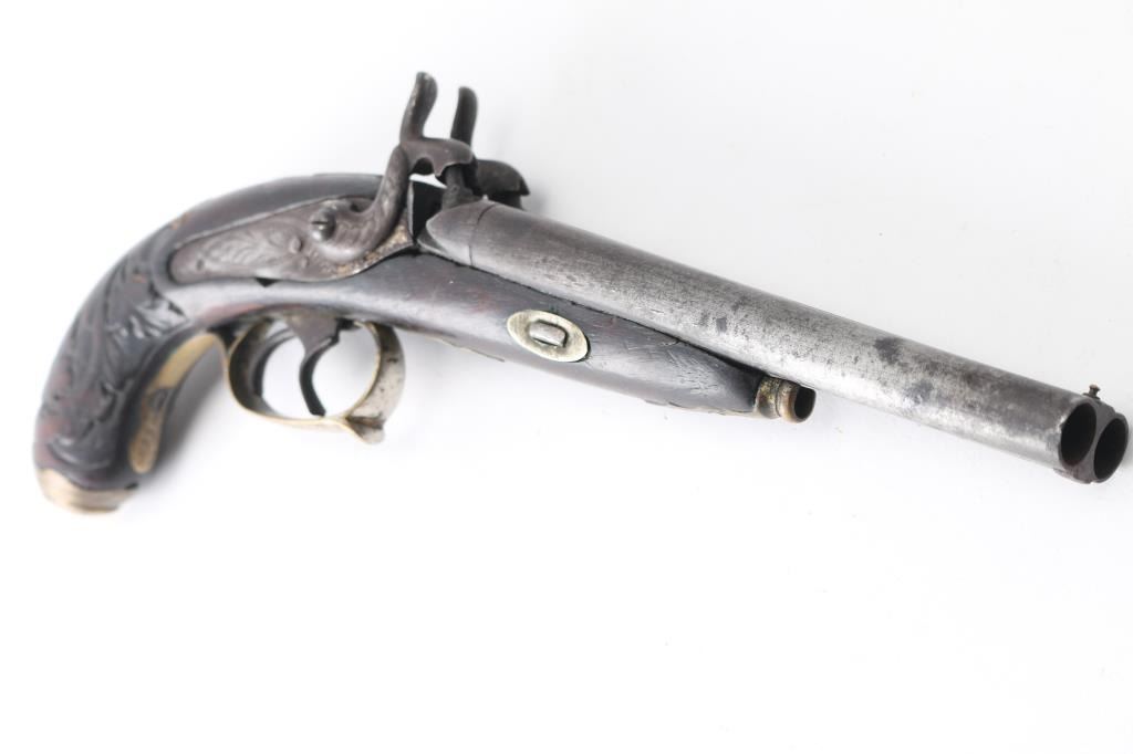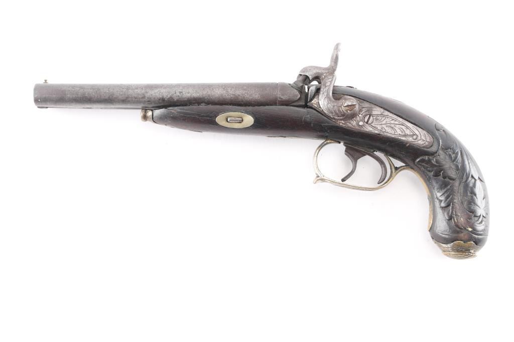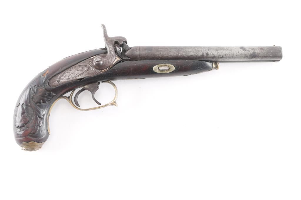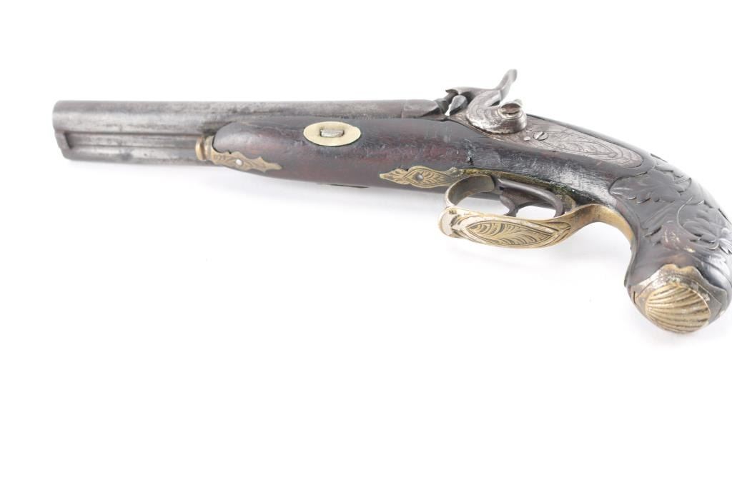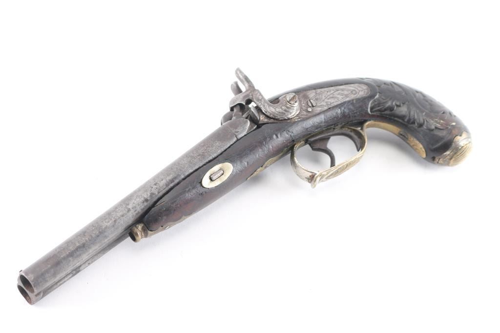 SN: 180 Antique large caliber percussion pistol. 6' round barrels, 'rabbit ear' hammers, brass coated nickel furniture, floral engraved. German silver shield inletted in the top of the grip, double triggers, hinged 'clam shell' grip cap for cap storage, floral carved grip, wood is sound with minor scratches/dings, both hammer actions are crisp/tight, the left hammer screw is damaged, metal finish has turned a dark gray patina with dark spots, bores are rough, and there is some handling wear to the triggerguard. Missing the ramrod. Circa 1840's-50's. Was a high quality pistol at one time.