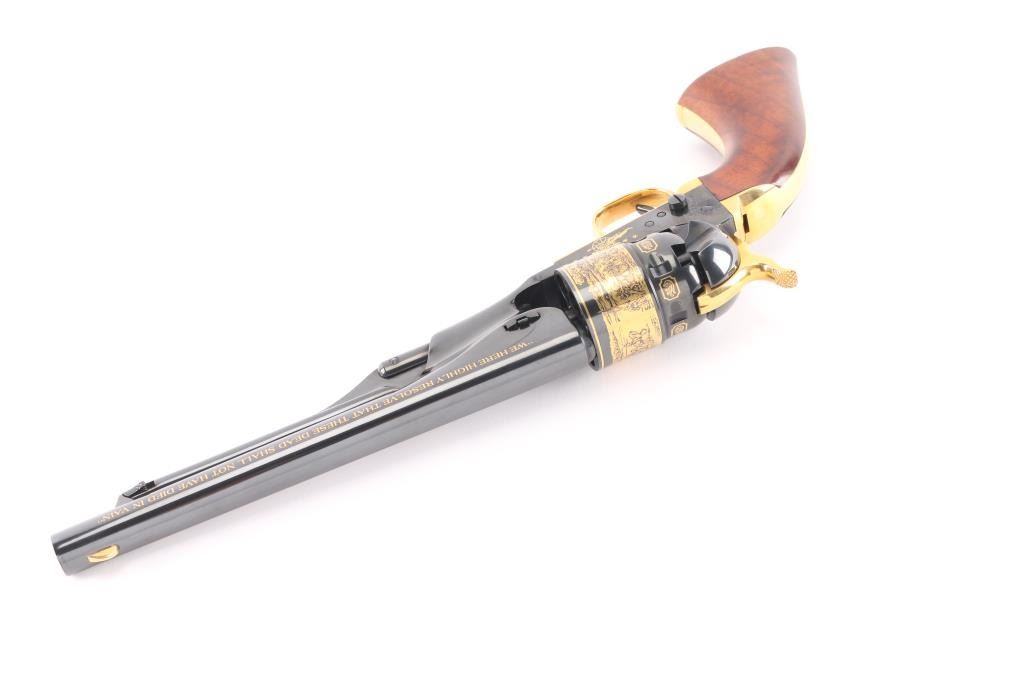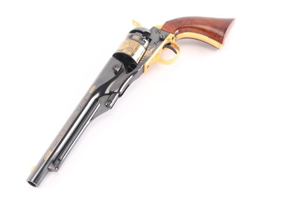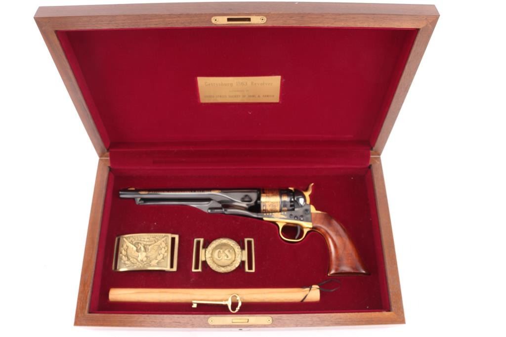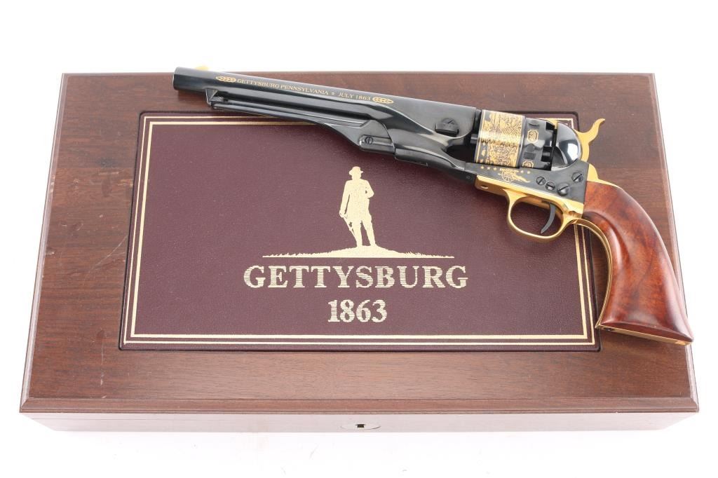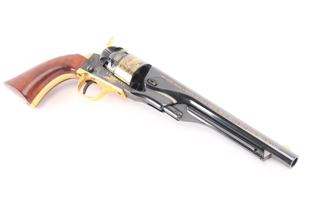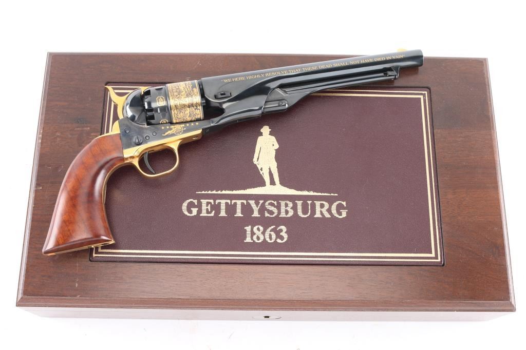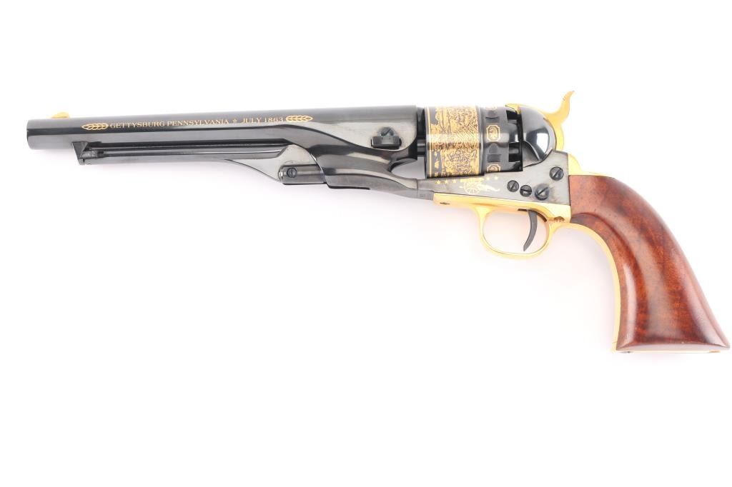 Cased, highly embellished limited edition reproduction of the 44 cal Colt 1860 Army celebrating the Battle of Gettysburg. #383 of 1,863 produced by America Remembers and authorized by the United States Society of Arms & Armour in cooperation with the Civil War Trust. Features a high luster blued finish with 24kt gold accents including: “We here highly resolve that these dead shall not have died in vain”, “Gettysburg, Pennsylvania, July 1863”, Pickett’s Charge panoramic cylinder scene, cannons and floral embellishment. Also features a one piece oil finished walnut grip and four screw frame with shoulder stock cuts in the recoil shield & backstrap. Includes a locking wood presentation case with maroon velvet lined French fitted interior with Union & Confederate belt buckles and rolled replica of the Gettysburg Address on parchment paper. Also includes white gloves, certificate of authenticity and other documents. Revolver displays no observed wear. The case shows some scratches and small losses.