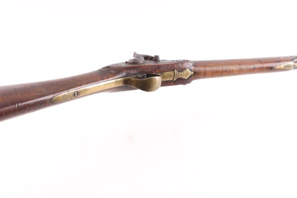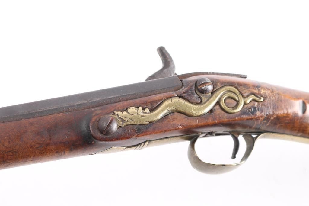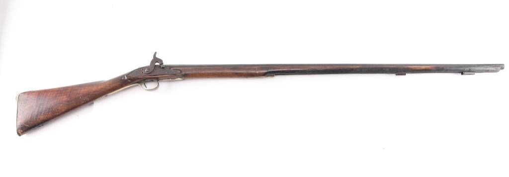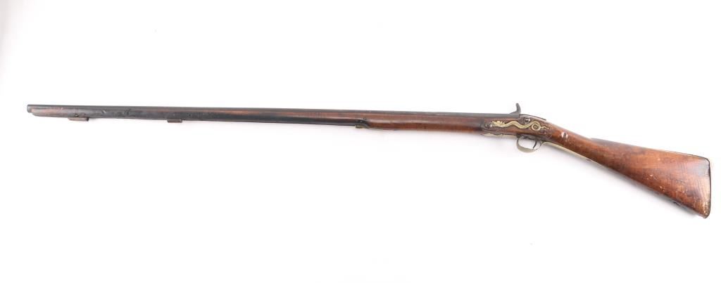 Late 18th to early 19th century trade gun converted from flintlock to percussion with desirable brass serpentine style sideplate. Approximately 54.5" overall with 39.5" barrel, approximately 20 gauge. Full stocked to muzzle. No name or proofs. Plain brass mounts other than side plate. Simple light engraving on the lock. False stripping burnt into stock. Conversion is utilizing hand made in forge hammer and looks "frontier'. Uncleaned condition with working action. No ramrod. Some small breaks and losses in forend that are minor. Just the type traded in Fur Trade Era to American Native Indians who favored the serpentine sideplate as a sign of quality and power.