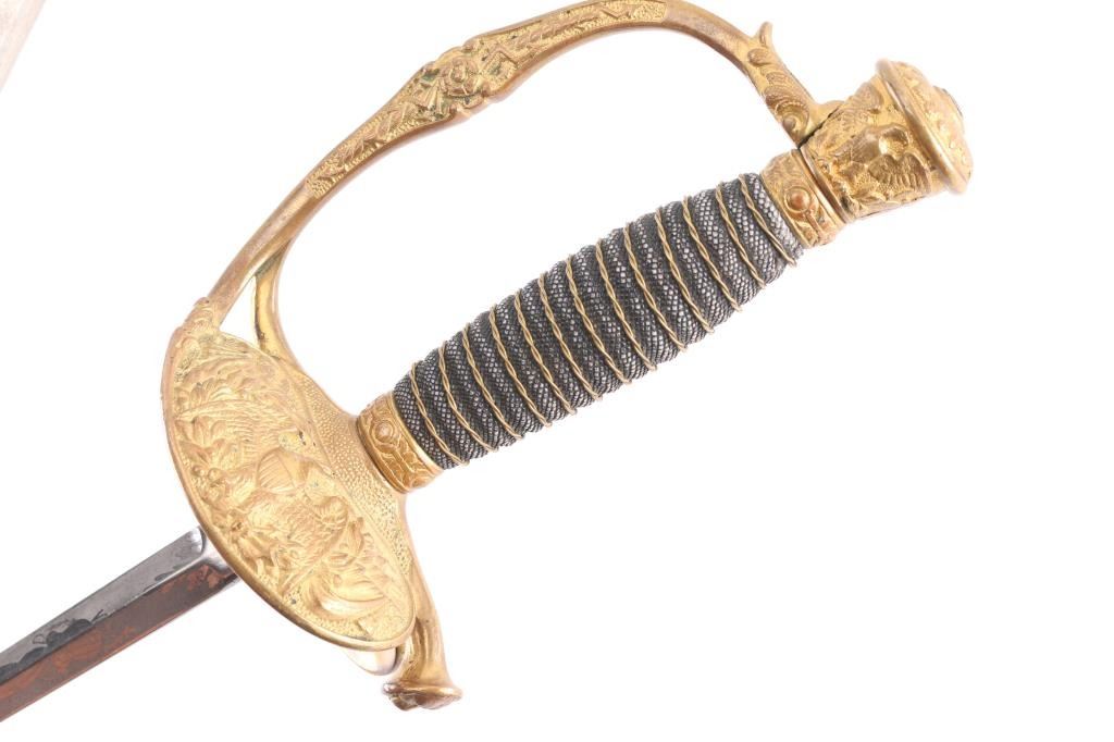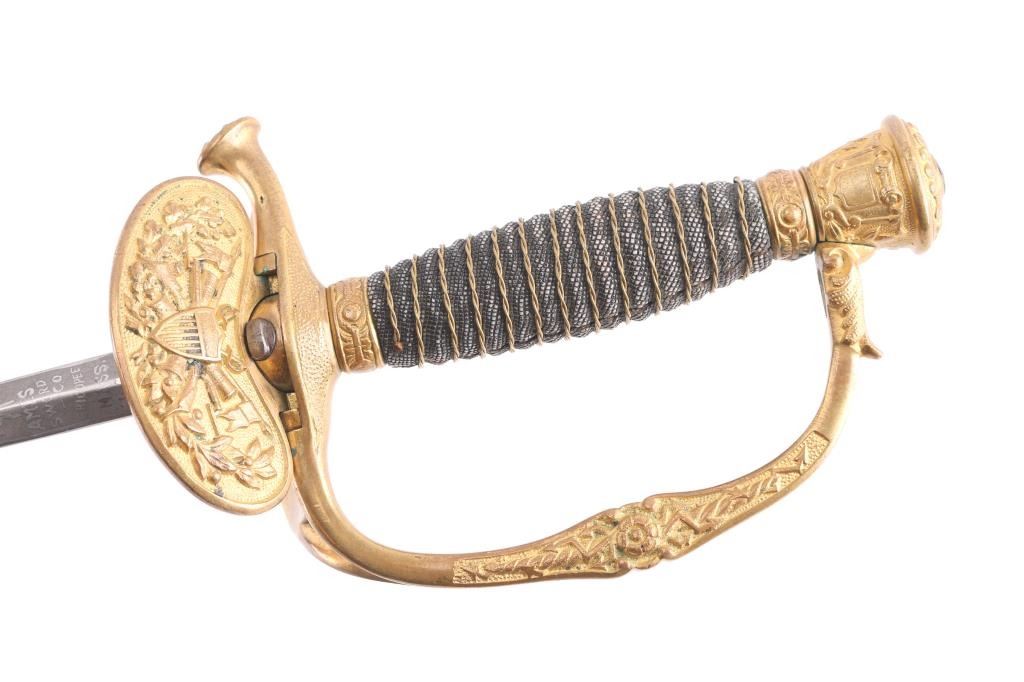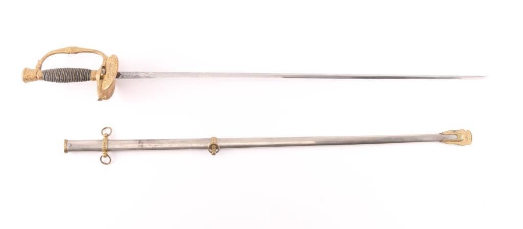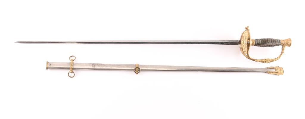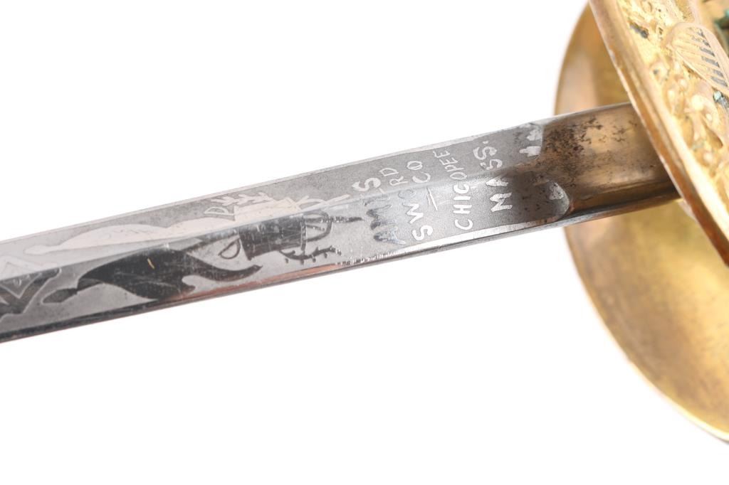 The brass hilt shows much of its original gilt and the cast motifs are crisp. The urn shaped pommel has an eagle on one side and plain shield on the other. The knucklebow has a central motif of a flower and twisted bolts of lightning. The grip is sharkskin, with all binding wire present/tight. The folding counterguard has wreath with American shied with crossed cannons, rifles banners. The eagle on the guard has no shield on its breast. The scabbard has 3 rings. The ring mounts are relief cast with simple leaves. The scabbard drag has star on one side, and crossed flags on the other, scribed line around the drag The 29"blade etching is vivid and set off by its frosted background. The obverse shows a geometric base trophy of arms with a shield, quiver and U.S. The reverse has “Ames sword. Co. / Chicopee / Mass” (1881 due to restructuring began marking blades AMES SWORD CO).etched just above the ricasso, with American eagle. Overall very good condition, there is a split in the shark skin, and some discoloration on the drag. Indian was period.