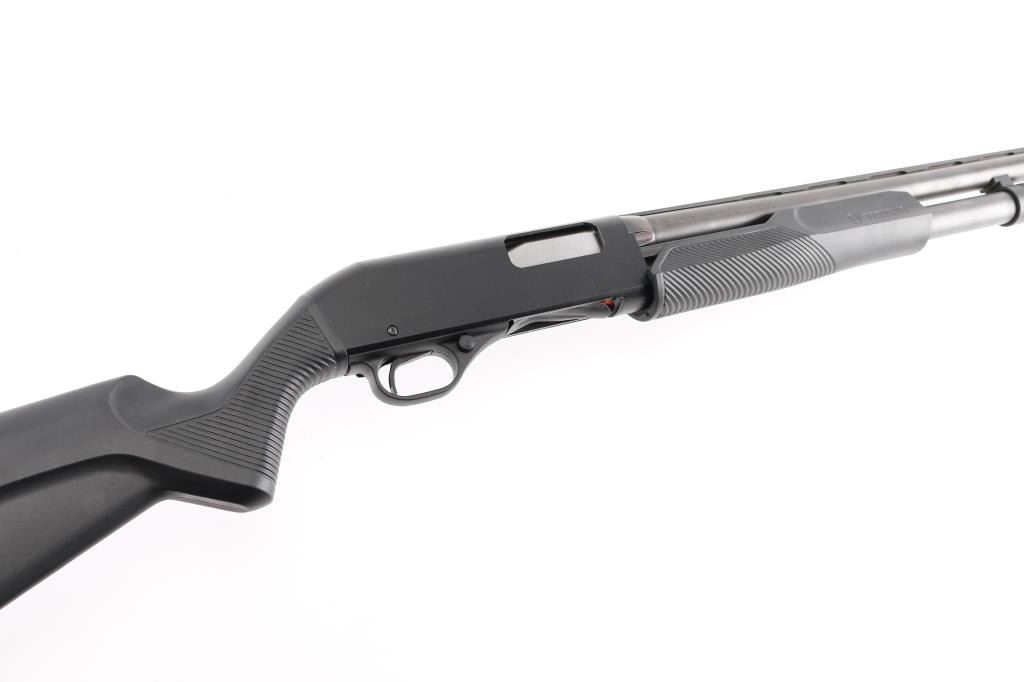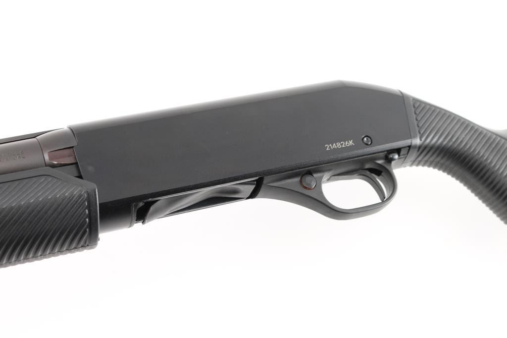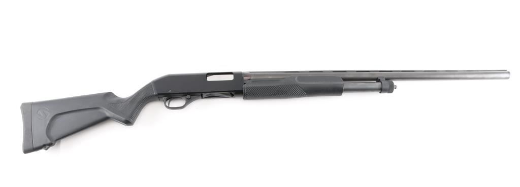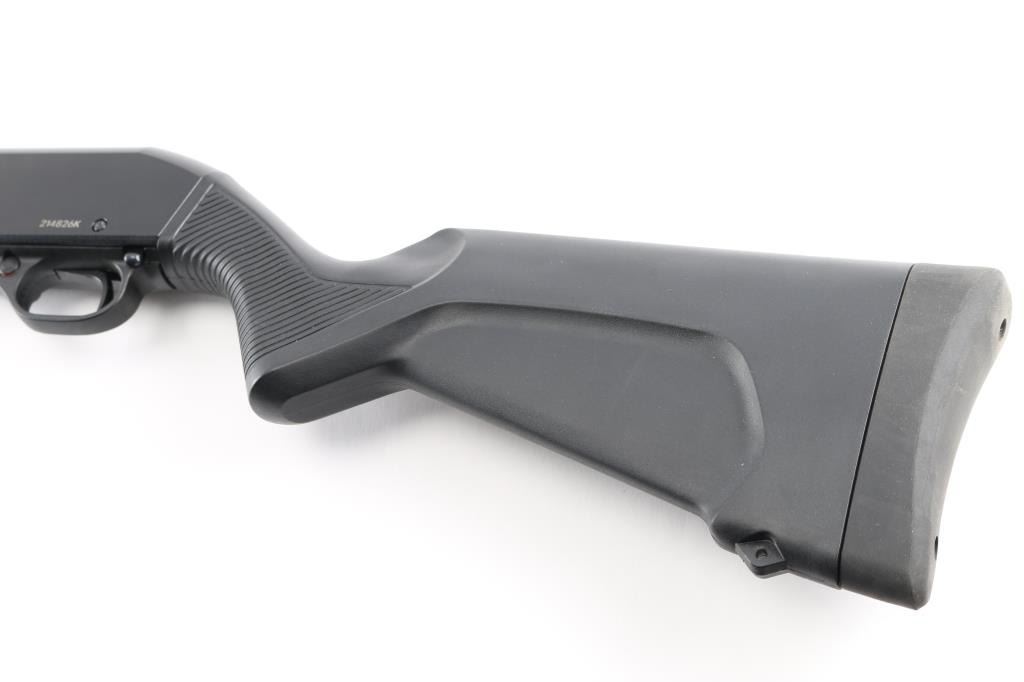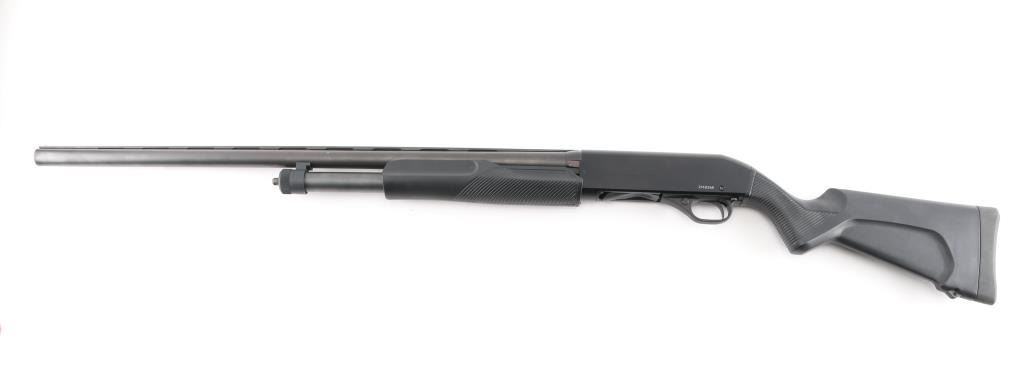 S/N: 214826K. Made in P. R.C. Pump action 12 Ga. shotgun and chambered for 2 3/4" & 3" shells. Features a 28" Parkerized serrated vent-ribbed barrel with a brass bead front sight, black polymer serrated slide forearm and shoulder stock with factory soft rubber buttpad. Has a smooth curved trigger and push button safety. LOP is 13 3/4". Retains approximately 95% finish with a small scrape on top left of barrel and little to no edge wear on magazine tube and action bars. Bore is clean and shiny with a smooth action. Comes with a IMPROVED MODIFIED choke tube installed.