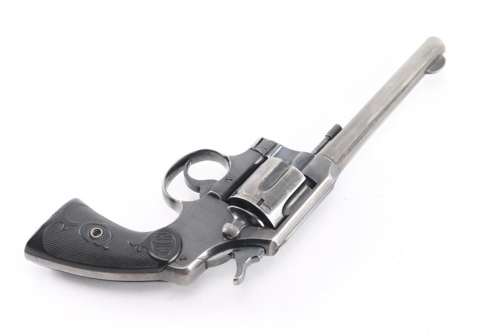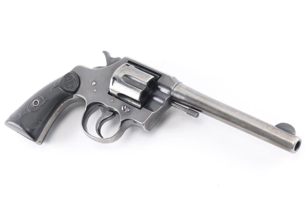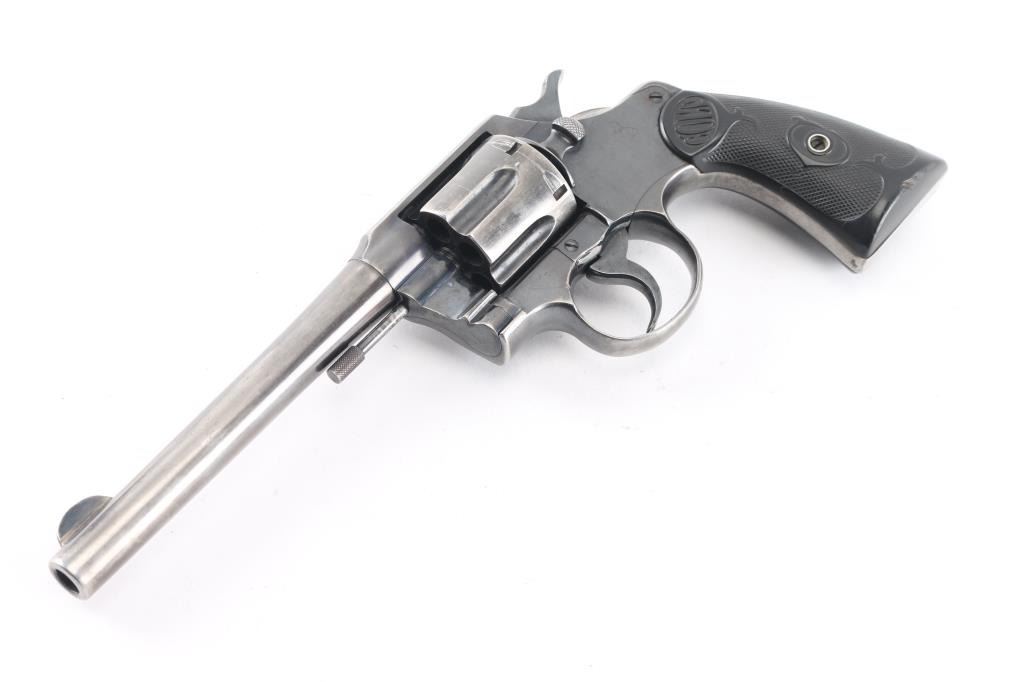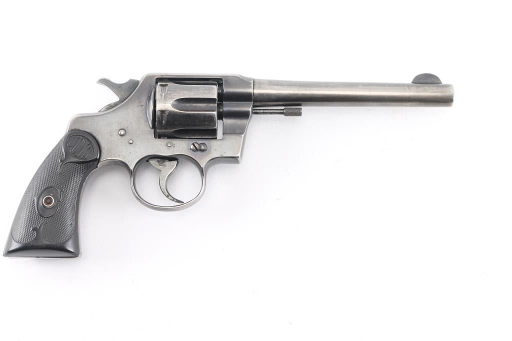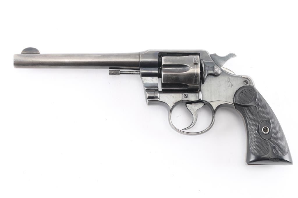 Post-war medium frame double action target revolver chambered in .38 Special, manufactured circa 1950. Features a blued finish, tapered 6" barrel, blade front sight, integral U- notch rear sight, smooth trigger, knurled hammer spur, fluted six-shot cylinder, non-shrouded ejector rod, knurled backstrap and two-piece checkered hard rubber grips with "COLT" decor. The revolver has been buffed at some point, therefore the barrel markings are gone, the Rampant Colt on the left fame is faint, Revolver exhibits approximately 50% of it's old reblued finish showing holster wear, handling marks, some small scattered losses and heavy wear on the grip straps. Action is smooth with solid lock-up, the bore is excellent, the hard rubber grips are good with semi-worn checkering, minor losses .Not much collector value, but it would make a good shooter.
