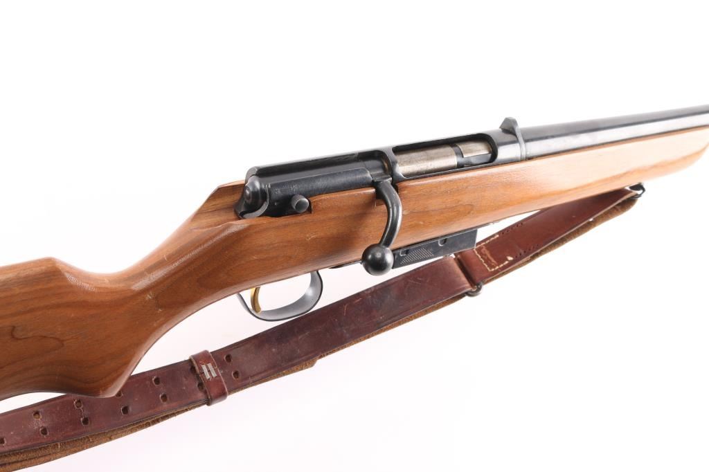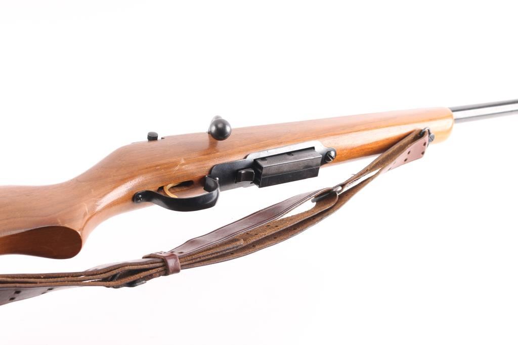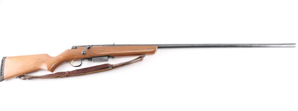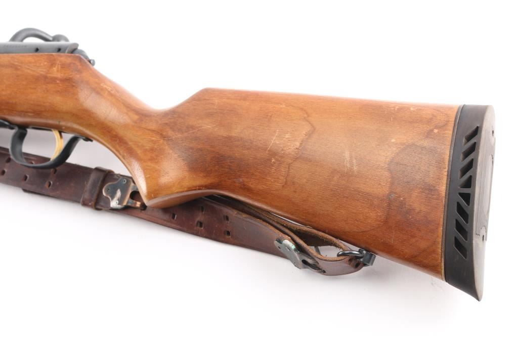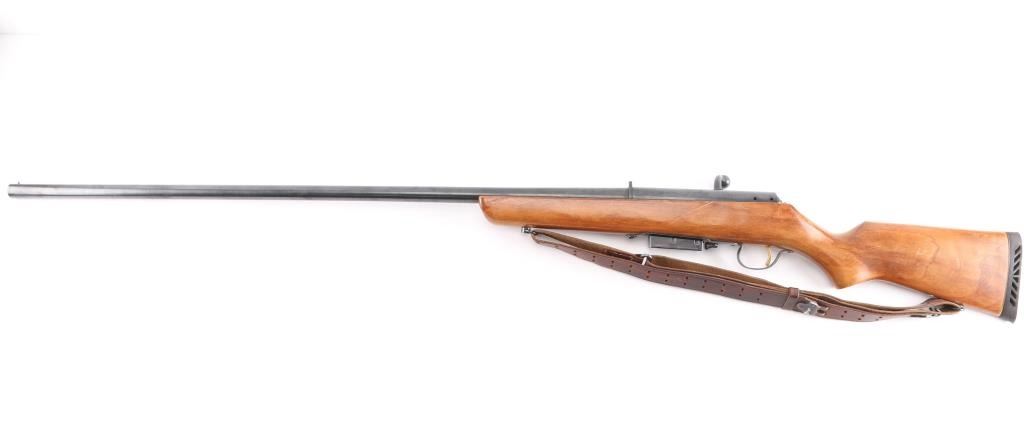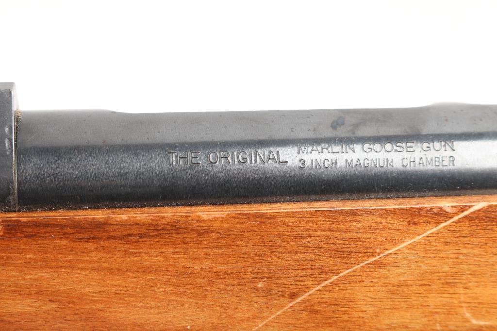"The Original Marlin Goose Gun" Bolt action shotgun features 36" full choke barrel, brass bead front sight, notch rear sight, detachable magazine, manual safety, wood stock, ventilated rubber recoil pad, sling swivels. Bore is very good condition. Retains 90% finish with some color fading, a few small patches of patina. Wood is very good with scratches and scuffs. Includes one magazine, and a good condition leather sling.