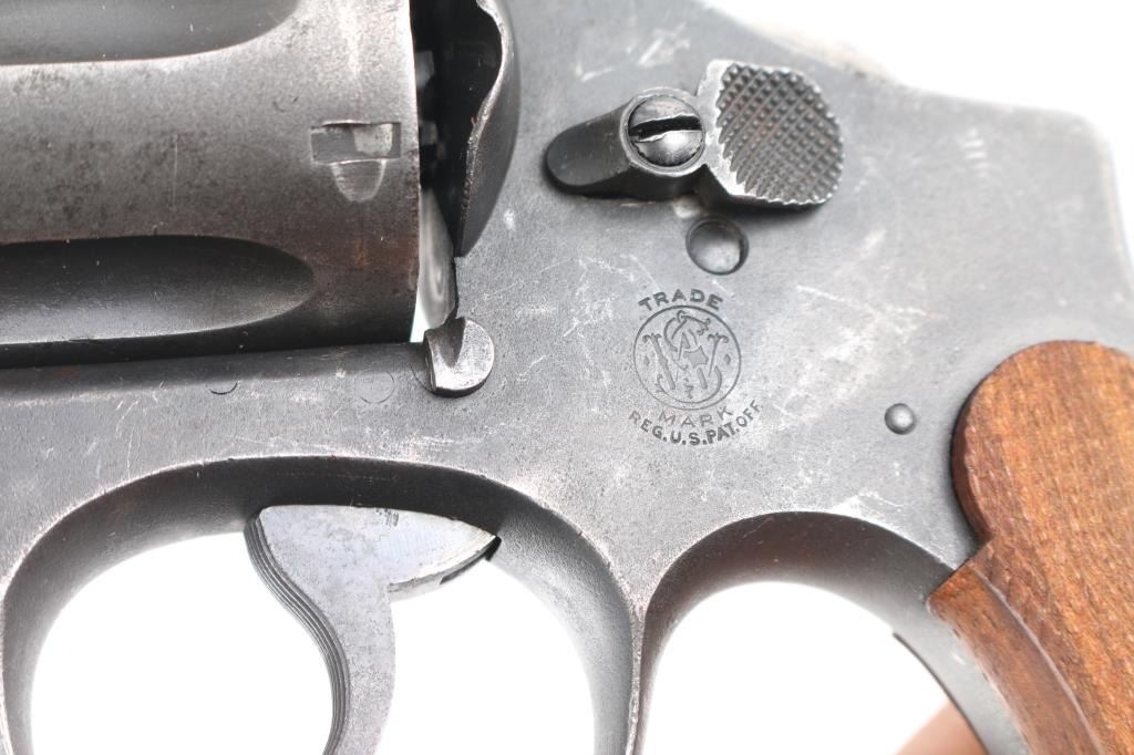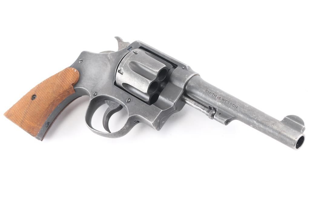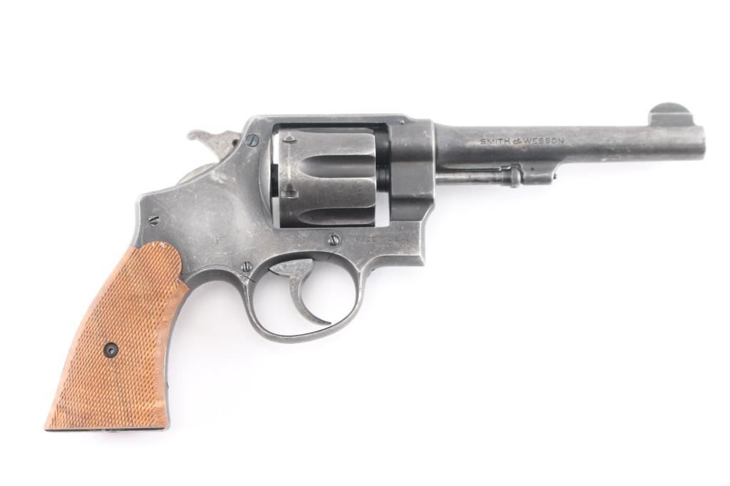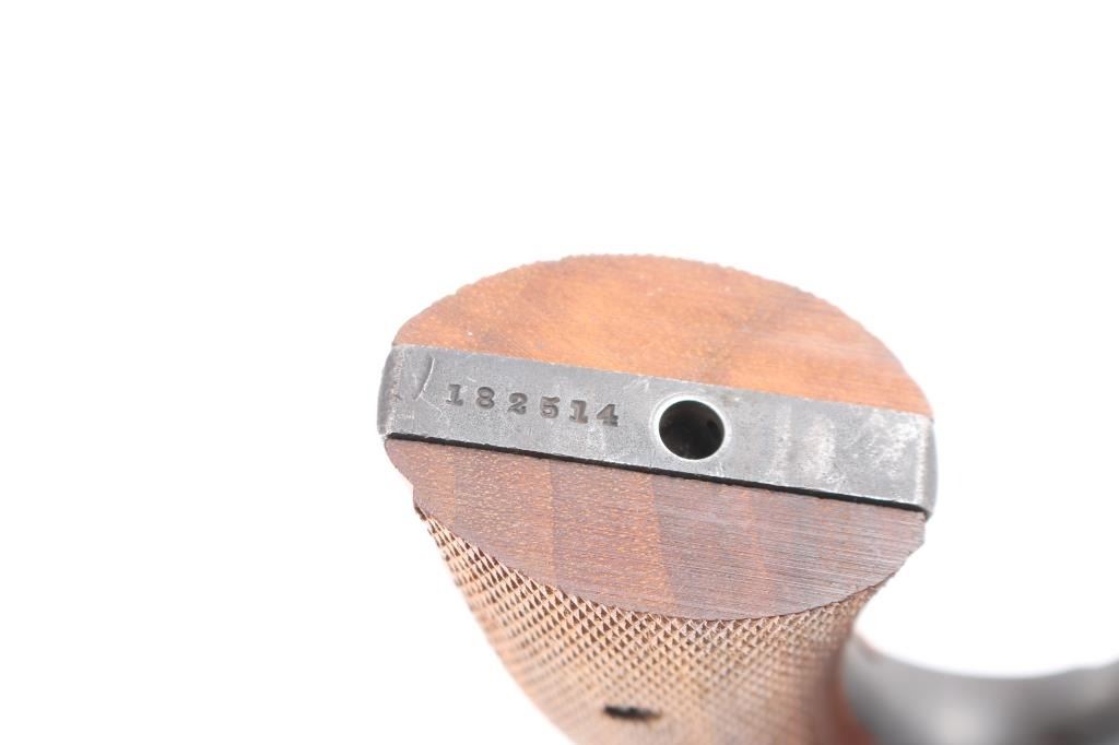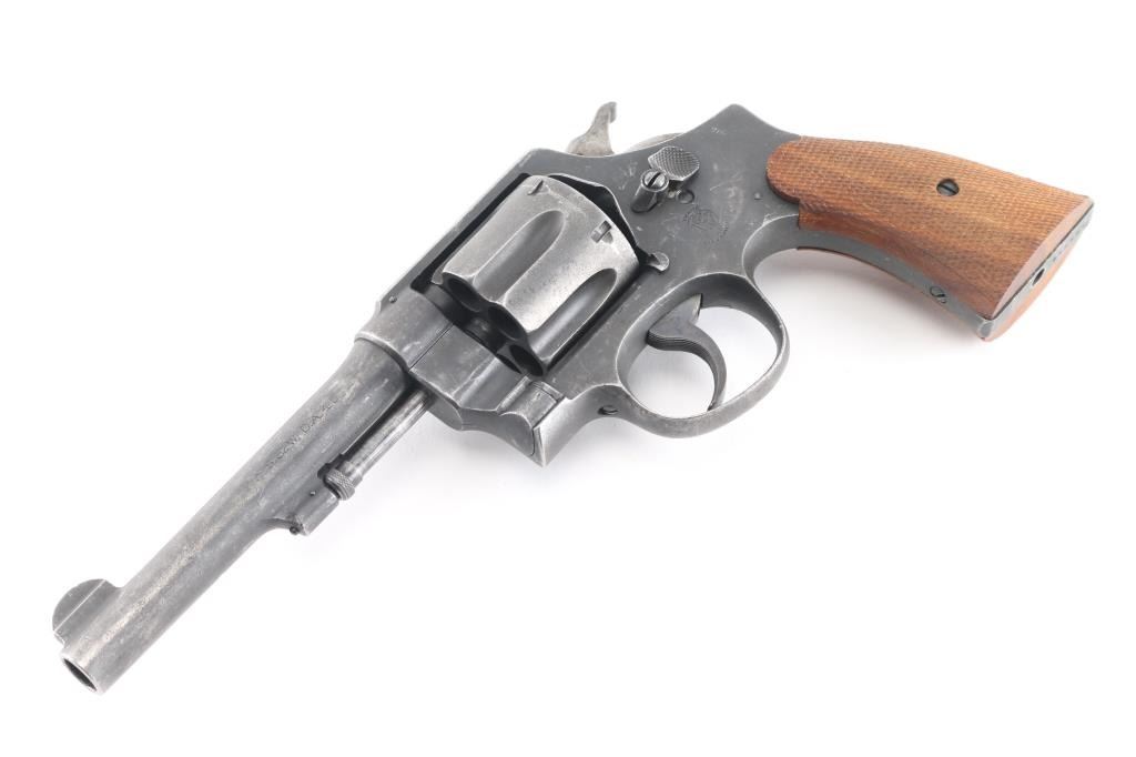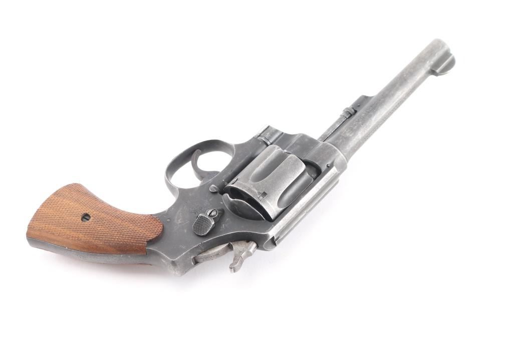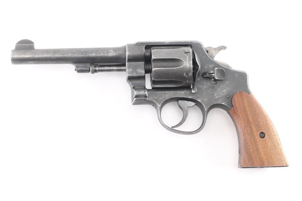 Sn: 182514. Brazilian Contract. N Frame, square butt. Blued finish. 5.5" round, pinned barrel. Brazilian Contract. 25,000 Model 1917's were made for the Brazilian Government and stamped with the Brazilian crest on the sideplate dated 1937. Small S&W trademark is found on the frame's left side with "Made in the U.S.A. on the right. Patent dated on top of the barrel, and "S&W D.A. 45" on the barrels left side. . Checkered hammer spur, and checkered wood grips. A number of these revolvers have made their way back to the U.S. imported by IA Co. marked on right frame. The Brazilian scrubbed at the time of re import,with just traces remaining, "1937 is clear Revolver has an old parkerized finish Bore and cylinders appear very good. Action is crisp/tight. Grips are very good. Parkerized finish is about 70 % with handling loss, edge wear/scratches, light tracking on the cylinder.