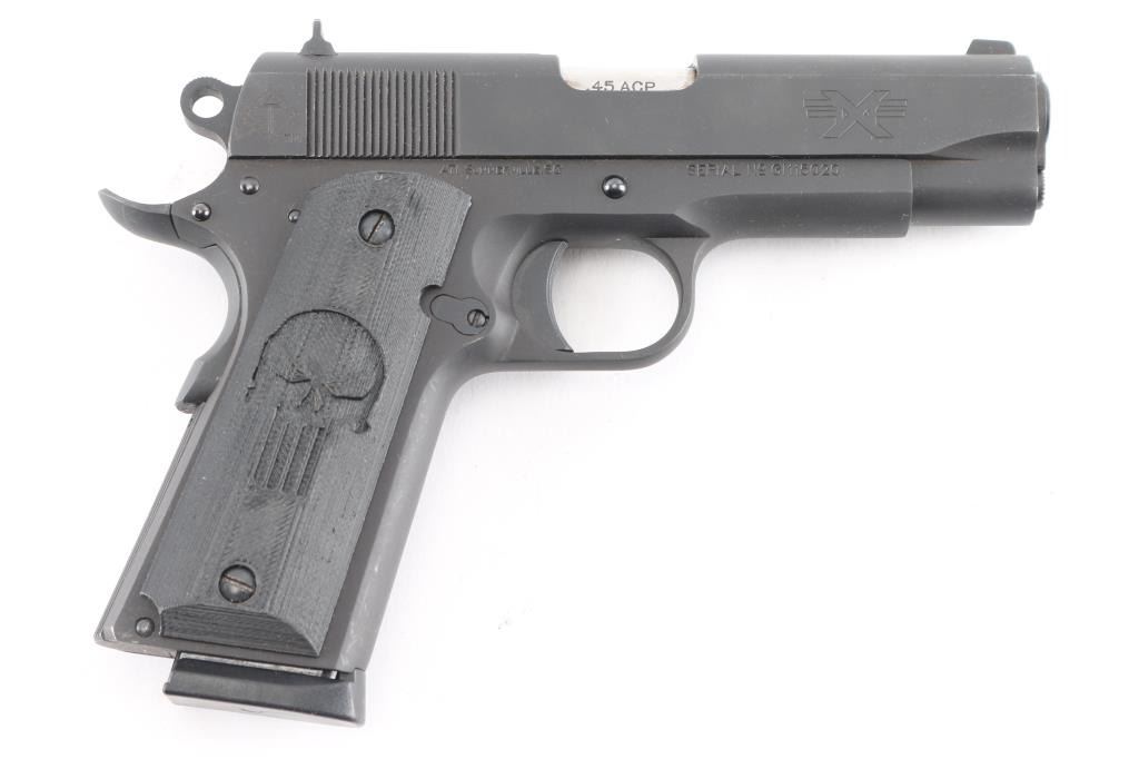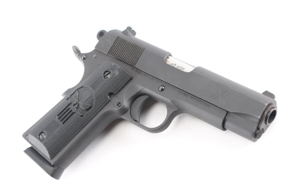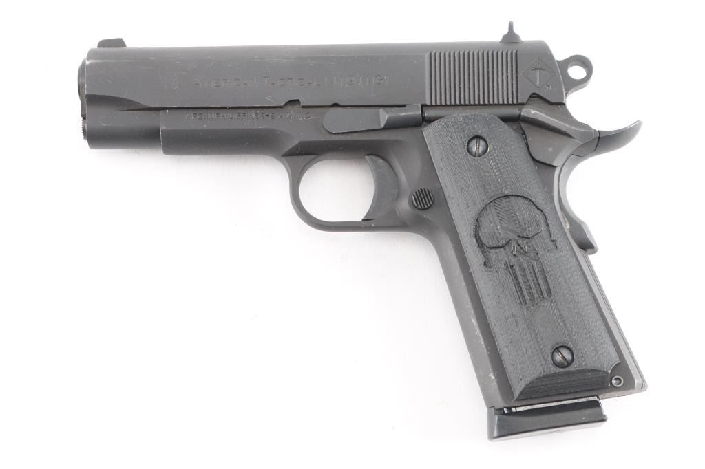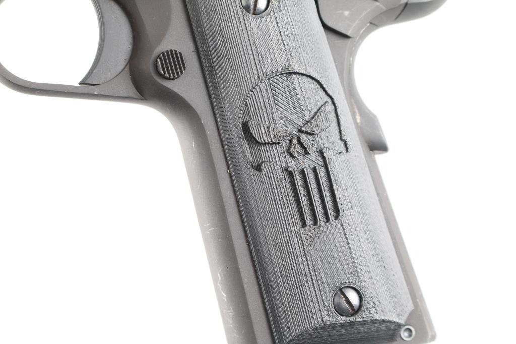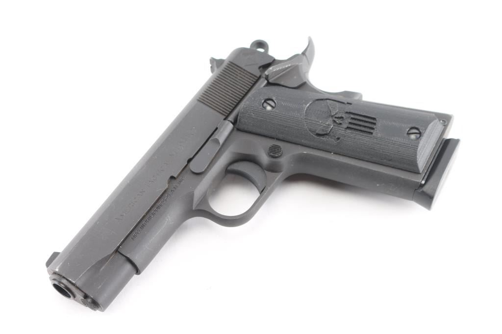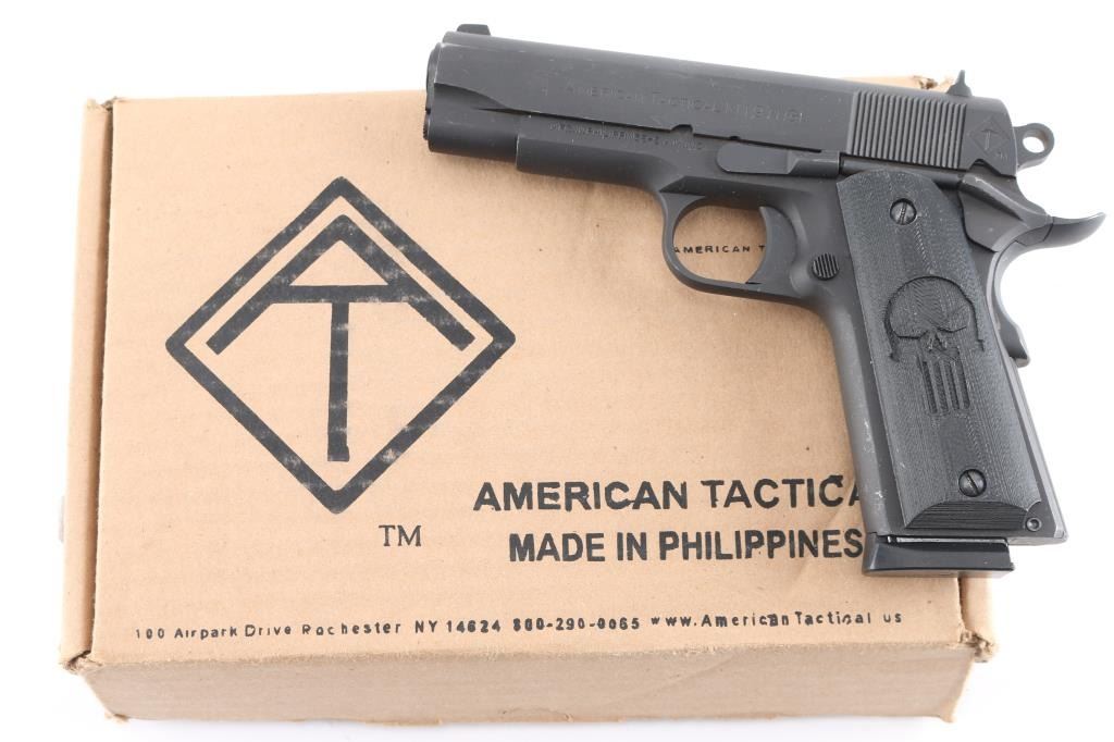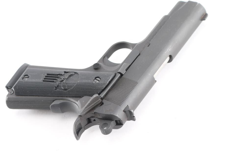 Semiautomatic upgraded 1911 type pistol made in the Philippines, imported by ATI, Summerville SC. Features matte gray finish, 4.25" barrel, blade front & dovetail mounted rear window sights, thumb safety, wide upswept beavertail safety with memory bump, serrated rowel hammer, serrated trigger, serrated flat mainspring housing, black polymer grips with "Punisher" motif. Overall like new condition, with few handling marks, a few scratches. Includes factory cardboard box with papers, one ActMag magazine.