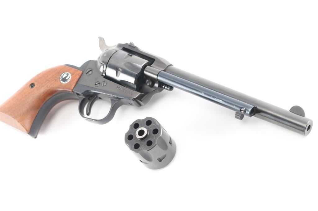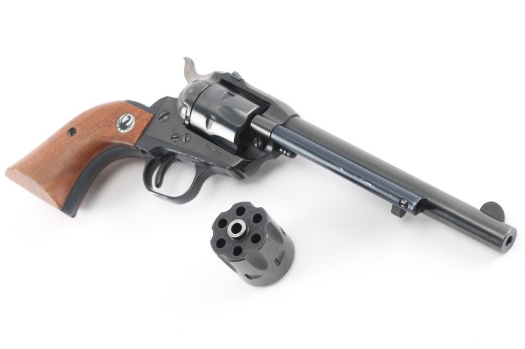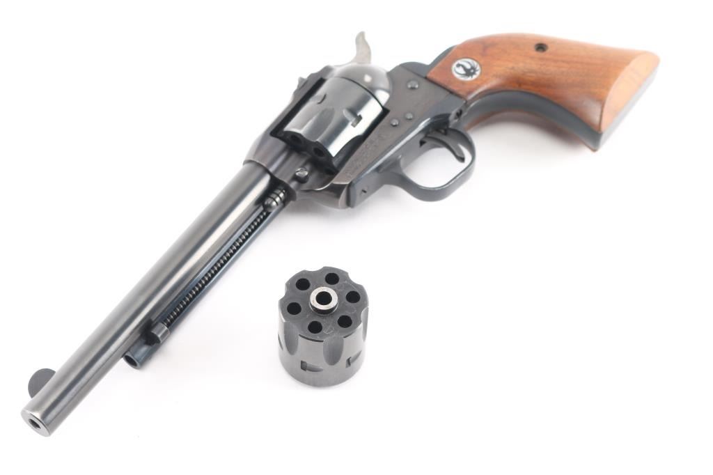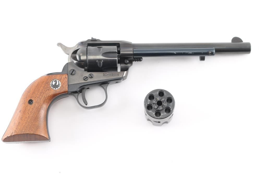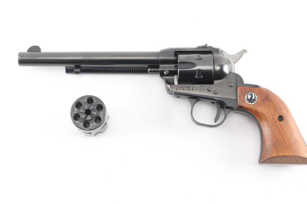 "Old Model, Three-Screw' single action 6 shot revolver manufactured circa 1970. Features blued finish, smooth wood grips with Ruger medallions, 6.5" barrel, fixed front & dovetailed square-notch rear sights, fluted 6 shot cylinder. Bore & charge holes are excellent. Retains 96% original finish, with some minor scratches/scuffs. Grips are very good condition. Action is sound, with tight lock-up. Includes extra cylinder for 22 Mag (WMR).