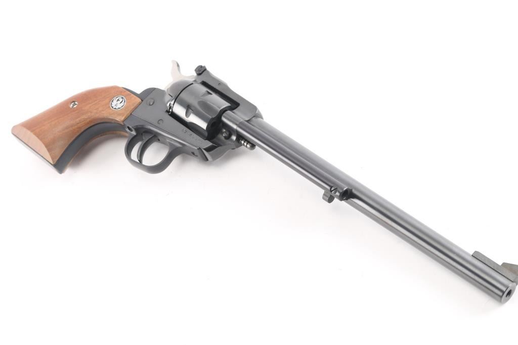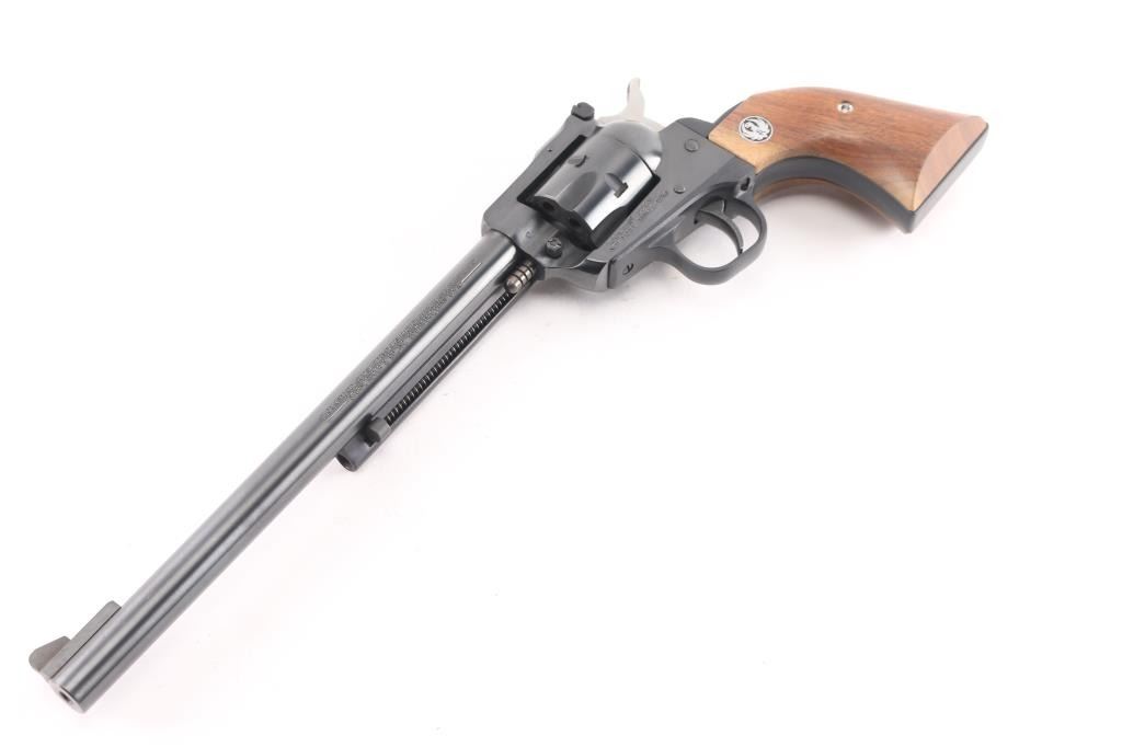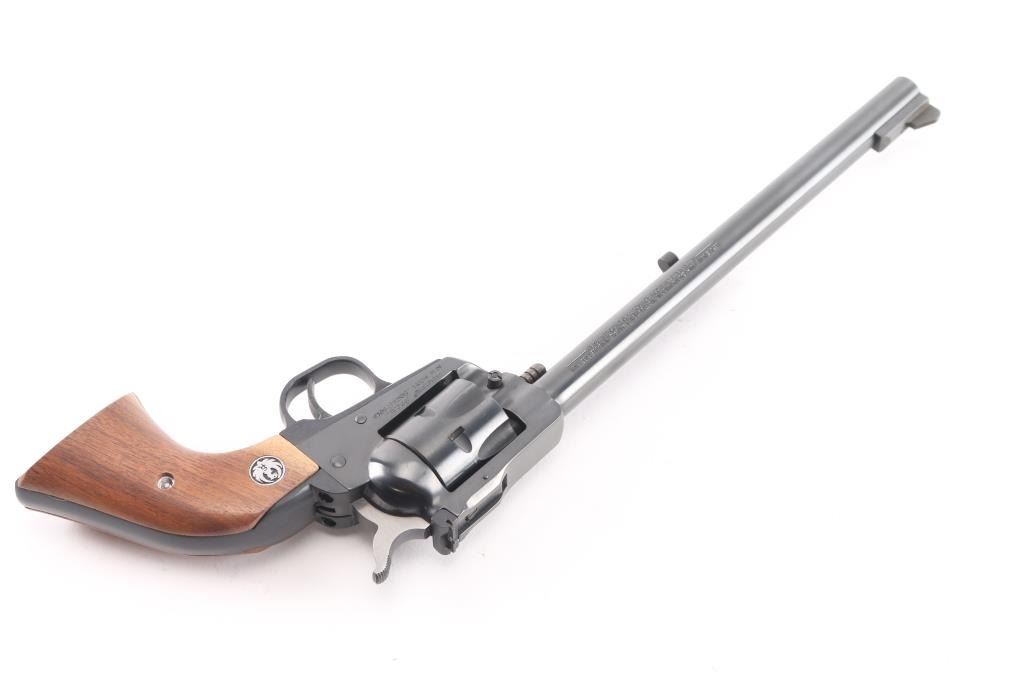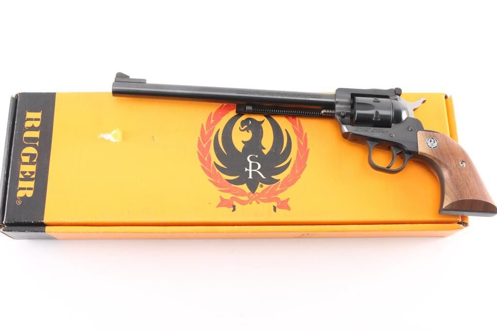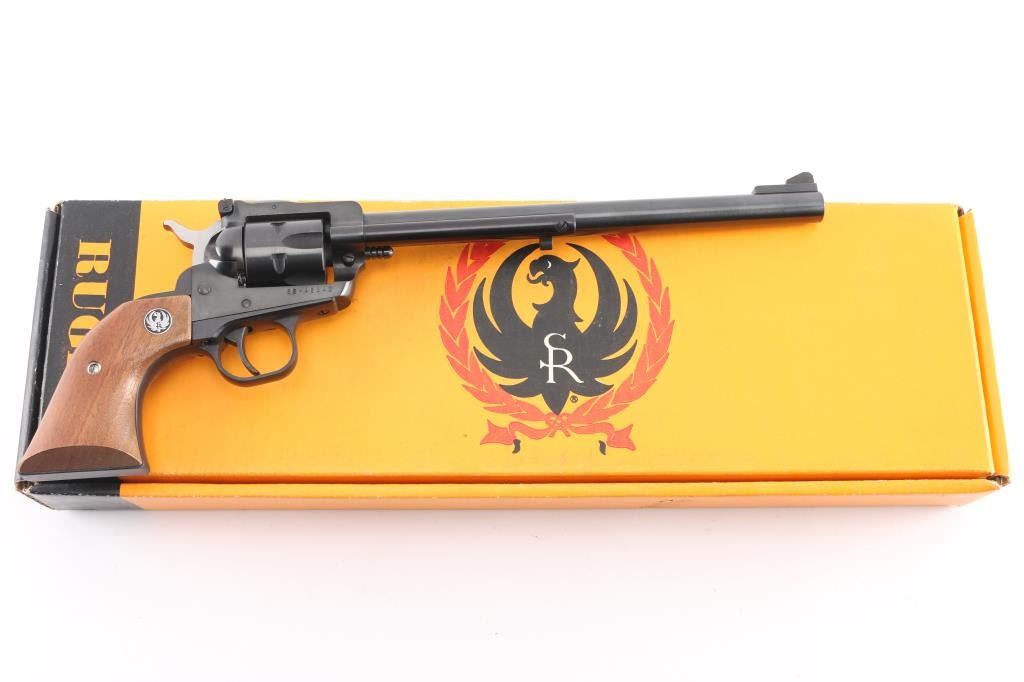 SN: 69-45343. Manufactured 1982. American made small frame western style single action revolver with both a .22 Long Rifle cylinder & a .22 Magnum cylinder. Features a blued finish, 9 1/2" barrel, black Partridge front sight & fully-adjustable rear sight , smooth trigger, serrated hammer spur, transfer bar safety, un-fluted six-shot .22 LR cylinder with recessed chambers, ejector rod with flat faced button and smooth brown laminated wood grips with silver & black Ruger medallions. Bore and charge holes are excellent. Revolver is in like new condition, Appears unfired. Includes the original factory yellow box with owners manual,u-fluted fluted .22 Win. Mag. cylinder, and a 4/34" barrel. All in like new condition.