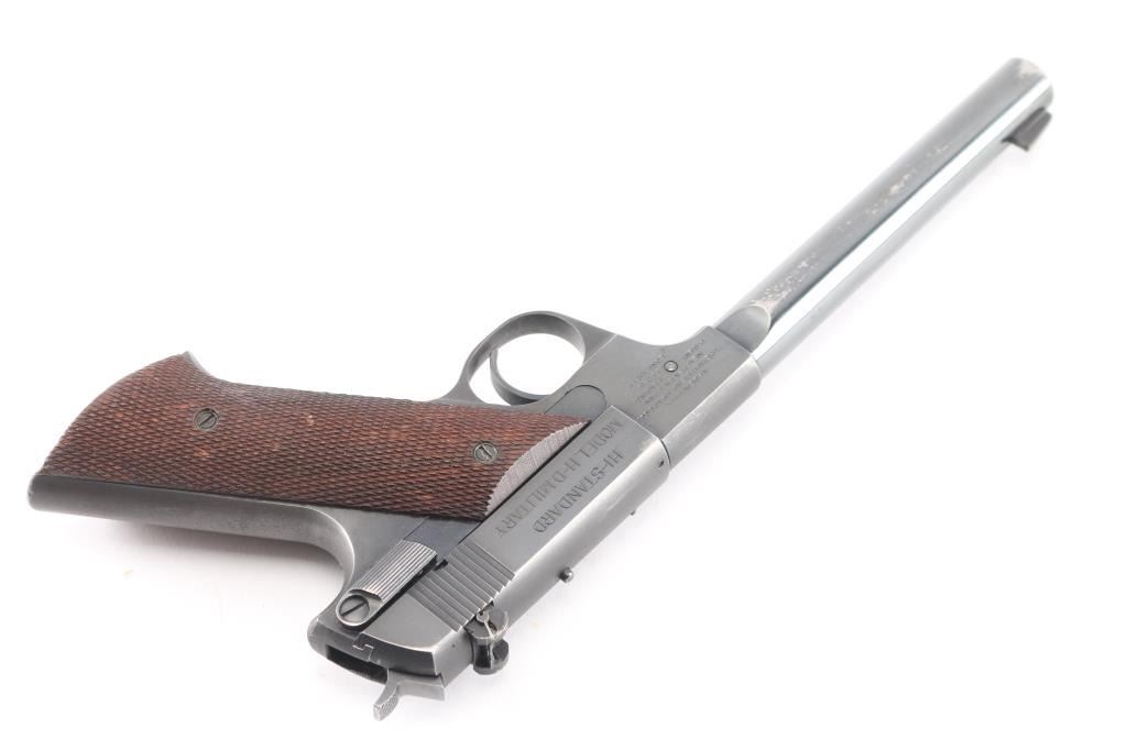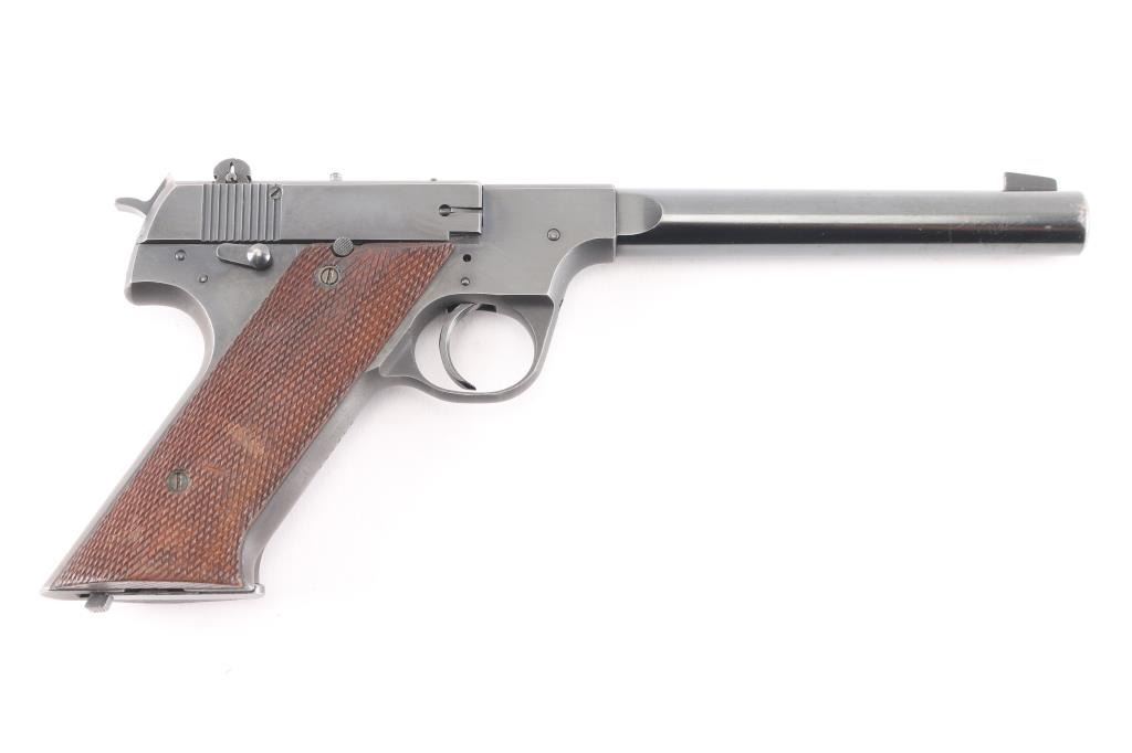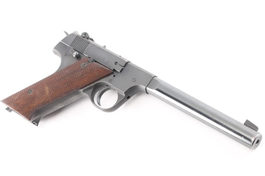 Semiautomatic rimfire pistol manufactured circa 1946 - 1955. Features blued finish, checkered walnut grips, 6.75" heavy round barrel with shrouded breech, adjustable sights, manual safety, slide stop lever, heel magazine release, external hammer. Bore is very good condition. Retains 80% blue, some bare metal on edges & corners, along sides of barrel, at muzzle. Tinning and fading to gray on grip straps. Grips are good condition with flattened checker points, small dents. Includes one magazine.