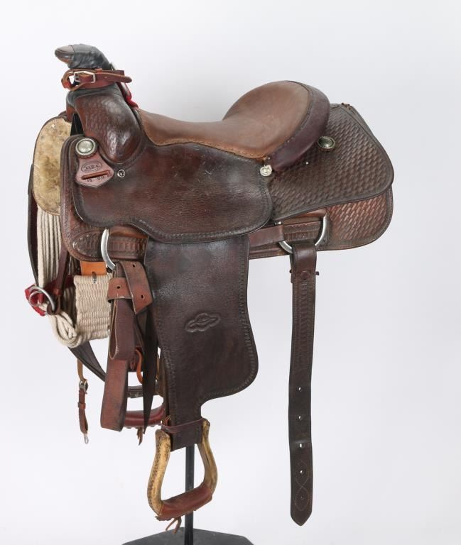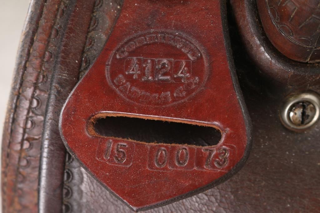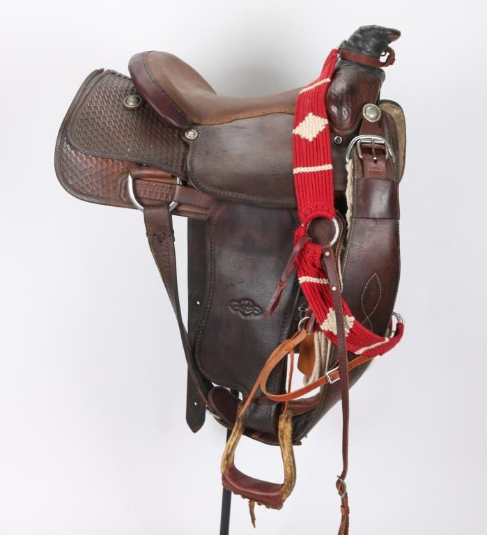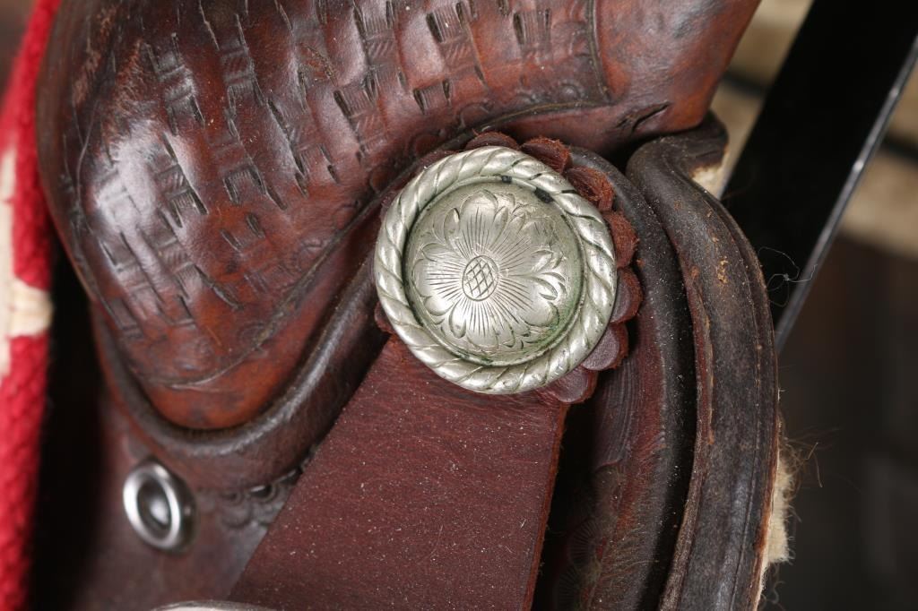 Brown leather saddle maker marked nickeled conchos with basket weave design. With a 15" saddle